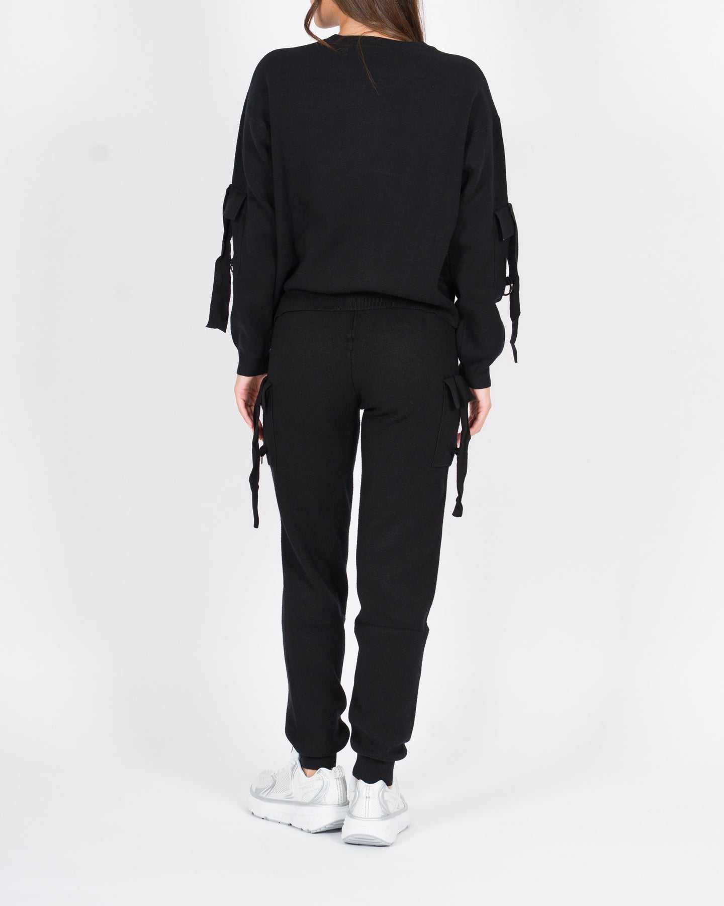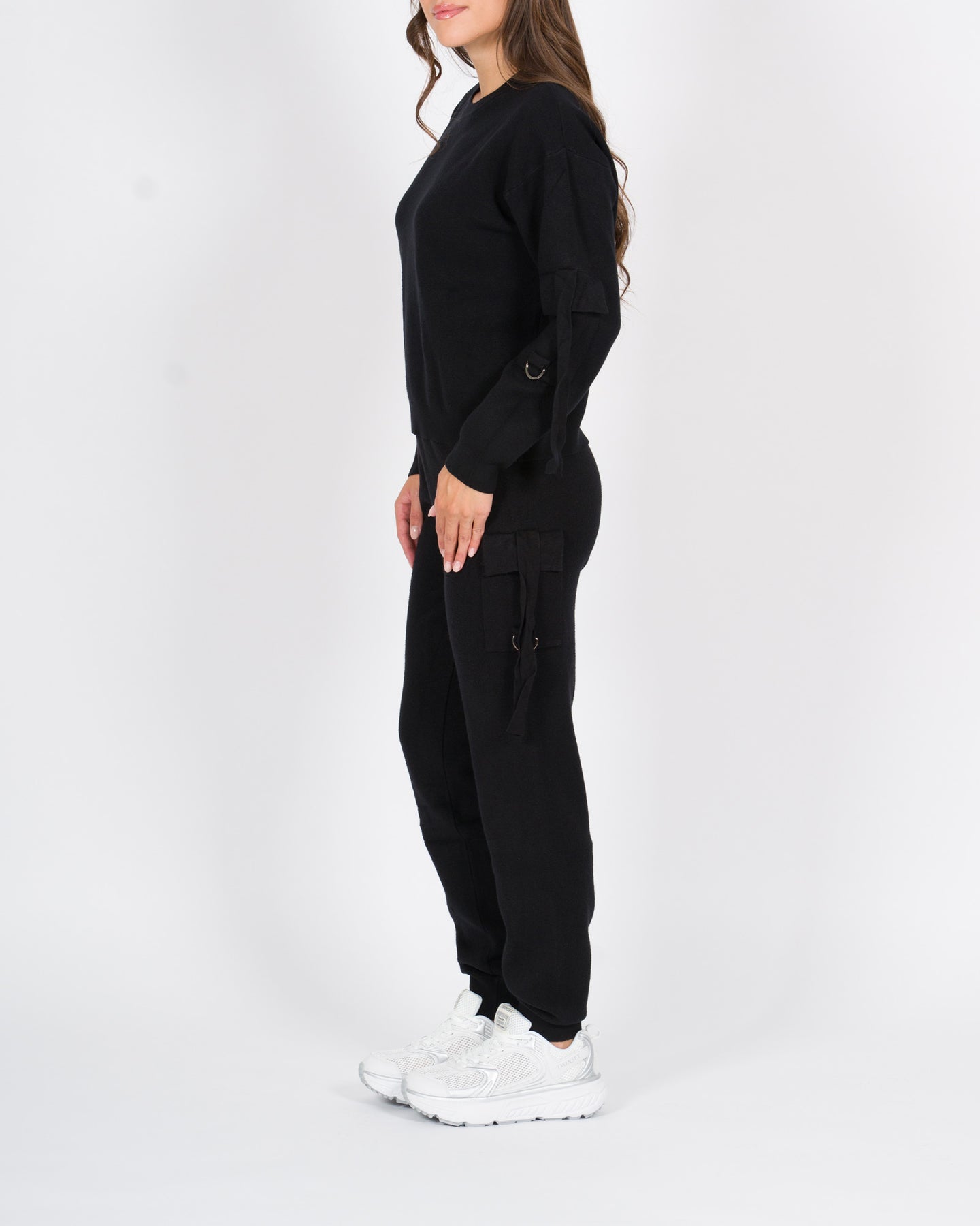 Completo coordinato in morbido tessuto di viscosa, composto da maglia a manica lunga e pantalone dal taglio rilassato, perfetto per un look moderno e ricercato.La maglia presenta un design originale con lacci decorativi lungo le braccia, che aggiungono un tocco grintoso e femminile. Il pantalone è caratterizzato da lacci regolabili sulle gambe e polsini al fondo, che donano struttura e movimento al capo.Un outfit versatile, comodo ma d'impatto, ideale sia per il tempo libero che per occasioni più urban-chic.Dettagli tecnici:•Tessuto: viscosa•Lacci su maglia e pantaloni•Colore: neroLa modella indossa la taglia S/M ed è alta 1.70