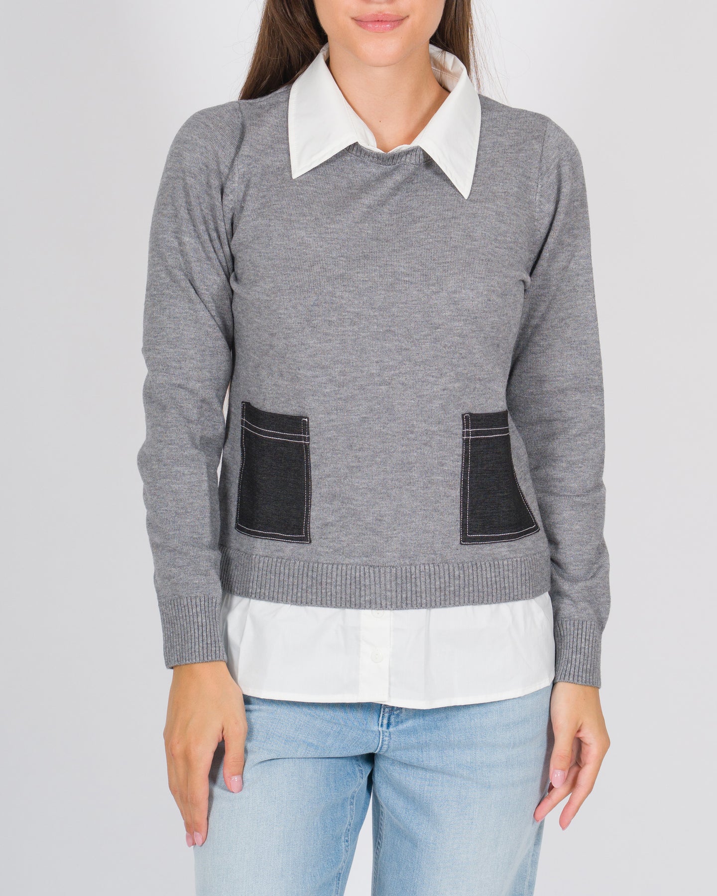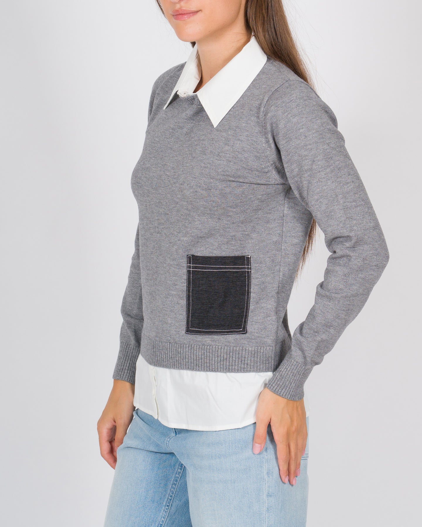 Questa maglia in lana con maniche lunghe unisce dettagli sartoriali e comfort quotidiano. Il design è arricchito da finte tasche ricamate, che donano un tocco di raffinatezza, e da una camicia applicata sul collo e sul fondo, creando un sofisticato effetto layering senza rinunciare alla praticità. La vestibilità aggiornata rende il capo versatile e perfetto per completare look casual chic o per aggiungere un dettaglio elegante ad outfit più formali.