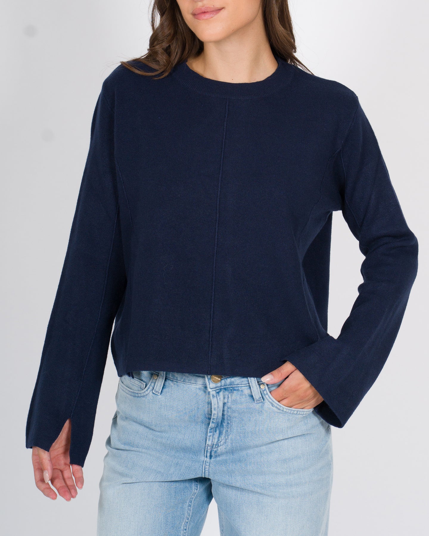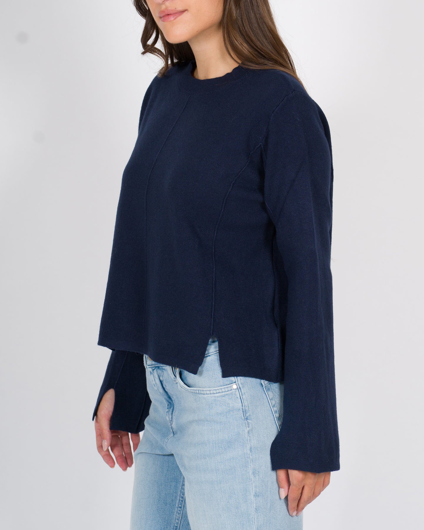 Maglia girocollo a manica lunga dal design contemporaneo, realizzata in morbido tessuto di viscosa che accarezza la pelle con leggerezza. La vestibilità cropped valorizza la silhouette e dona un tocco moderno e grintoso. I tagli sui polsi e le righe a contrasto lungo la parte centrale e le braccia definiscono un look dinamico e originale, perfetto per chi ama distinguersi con stile. Ideale da abbinare a pantaloni a vita alta o gonne per un outfit casual ma ricercato.Dettagli tecnici:Vestibilità croppedTessuto: viscosaTagli su polsiColore: bluLa modella indossa la taglia S/M ed è alta 1.70