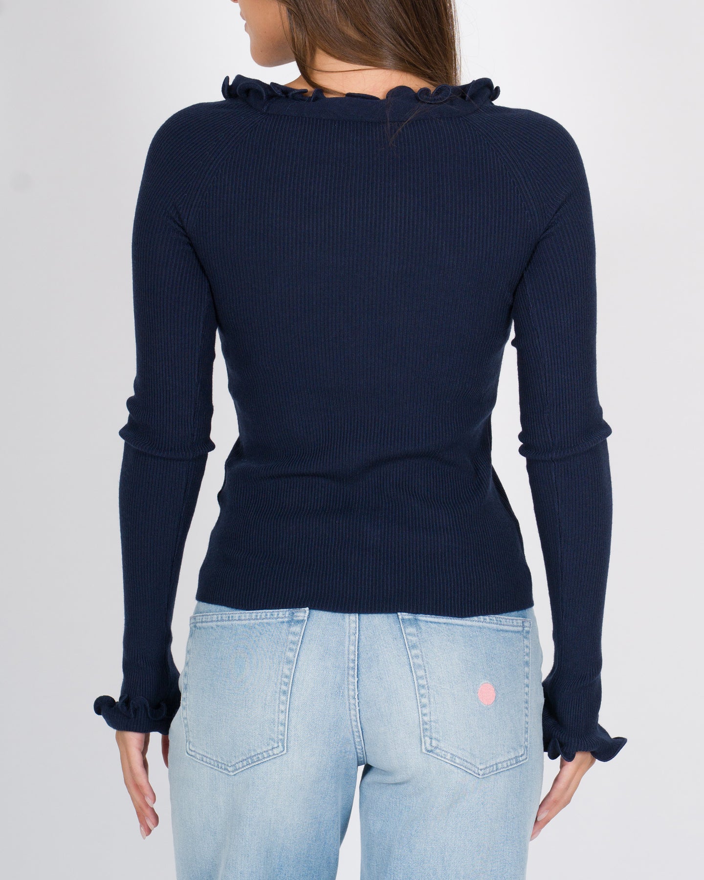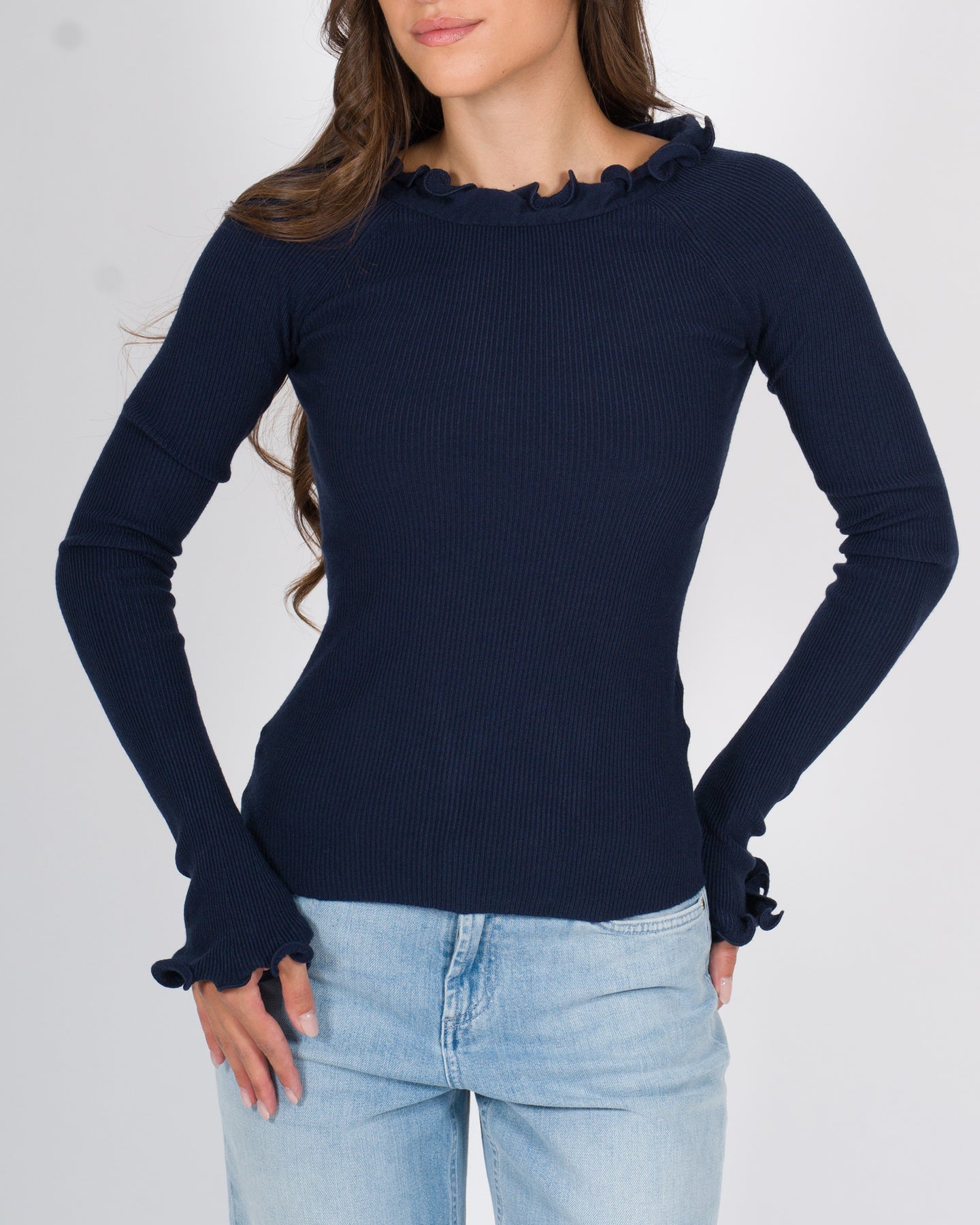 Pulito nelle linee ma ricco nei dettagli, questo pullover manica lunga in viscosa si distingue per la sua lavorazione a costine che dona struttura e dinamicità al capo.I profili del collo e dei polsini sono impreziositi da un delicato bordo smerlato, che aggiunge un tocco femminile e raffinato alla maglia, senza rinunciare alla sobrietà.Dettagli tecnici:Collo smerlatoPolsini smerlatiVestibilità: slim fitTessuto: viscosaLavorazione a costineColore: bluLa modella indossa la taglia S/M ed è alta 1.70.