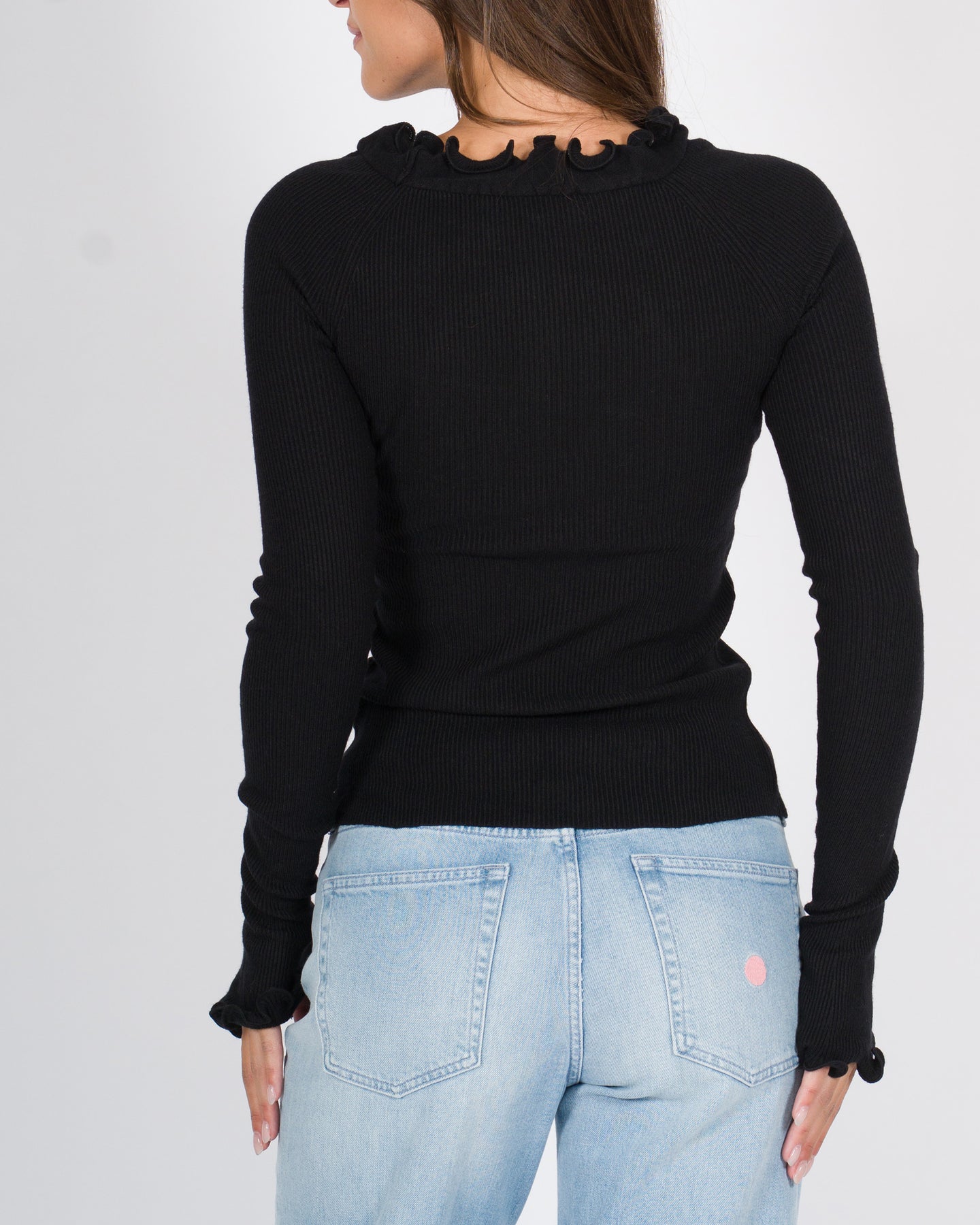 Pulito nelle linee ma ricco nei dettagli, questo pullover manica lunga in viscosa si distingue per la sua lavorazione a costine che dona struttura e dinamicità al capo.I profili del collo e dei polsini sono impreziositi da un delicato bordo smerlato, che aggiunge un tocco femminile e raffinato alla maglia, senza rinunciare alla sobrietà.Dettagli tecnici:Collo smerlatoPolsini smerlatiVestibilità: slim fitTessuto: viscosaLavorazione a costineColore: neroLa modella indossa la taglia S/M ed è alta 1.70.