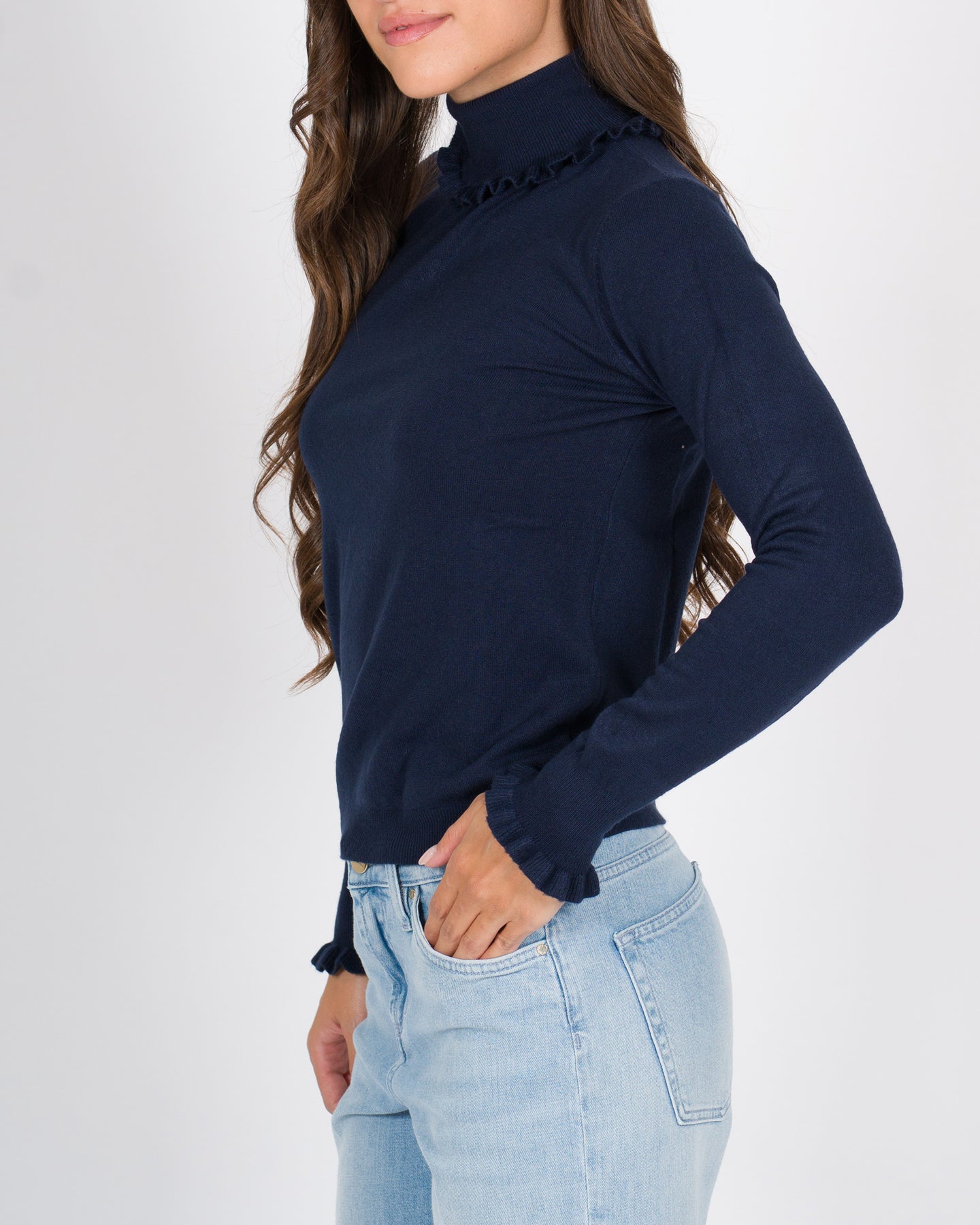Elegante e femminile, questo pullover colo alto è realizzato in morbida viscosa elasticizzata, perfetta per accompagnare forme con leggerezza e confort. La sua linea essenziale è impreziosita da un raffinato dettaglio smerlato sul bordo del collo e dei polsi, che dona un tocco delicato e ricercato, ideale sia per il giorno che per la sera.Dettagli tecnici:Carattere: elegante, raffinatoTessuto: ViscosaVestibilità: regolareColore: bluLa modella indossa la taglia S/M ed è alta 1.70.