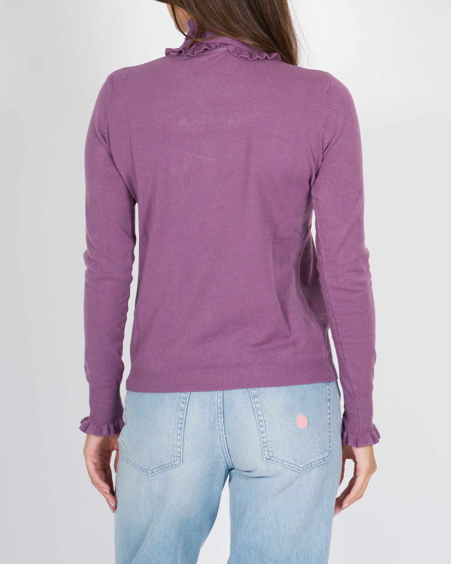 Elegante e femminile, questo pullover colo alto è realizzato in morbida viscosa elasticizzata, perfetta per accompagnare forme con leggerezza e confort. La sua linea essenziale è impreziosita da un raffinato dettaglio smerlato sul bordo del collo e dei polsi, che dona un tocco delicato e ricercato, ideale sia per il giorno che per la sera.Dettagli tecnici:Carattere: elegante, raffinatoTessuto: ViscosaVestibilità: regolareColore: melanzanaLa modella indossa la taglia S/M ed è alta 1.70.