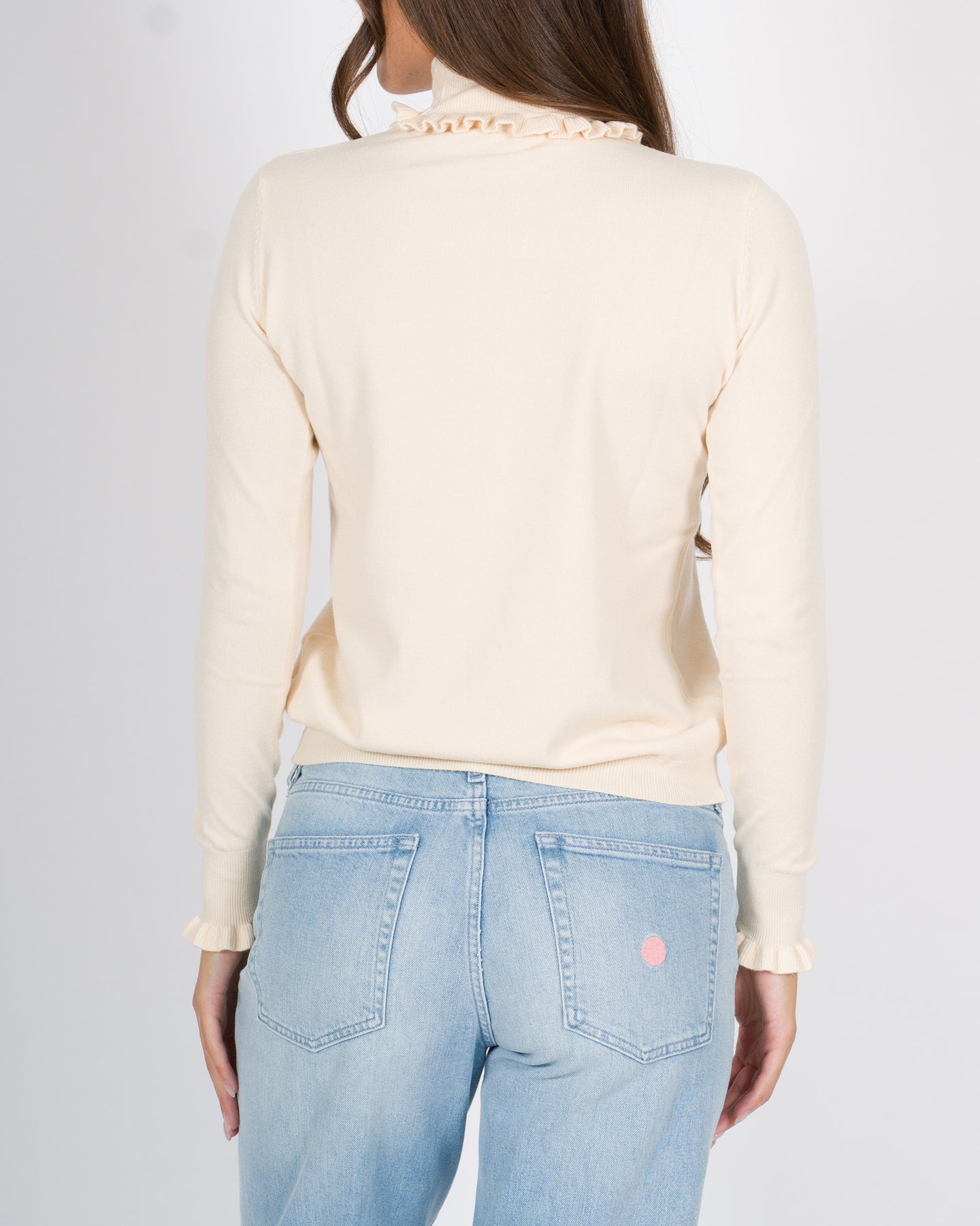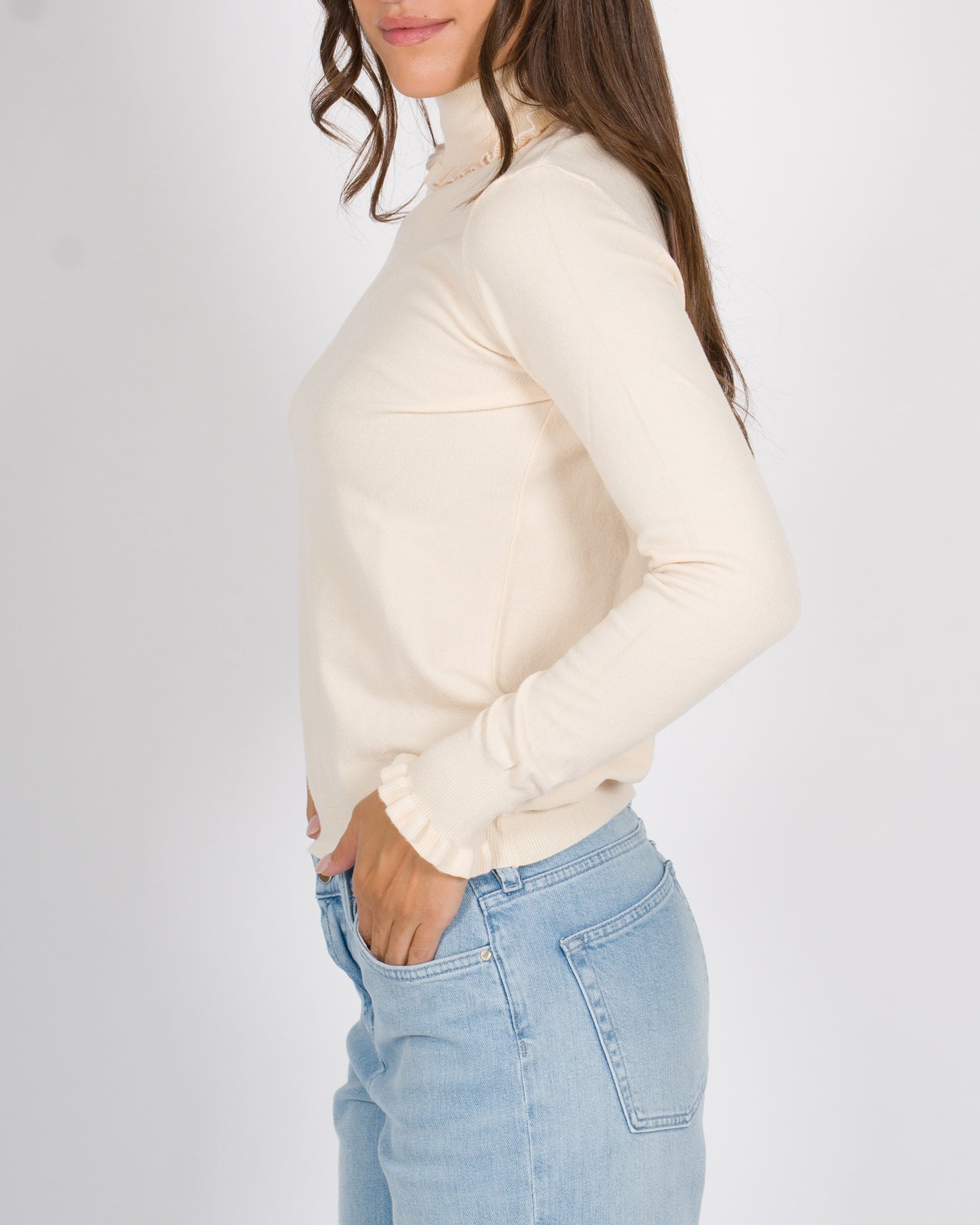 Elegante e femminile, questo pullover colo alto è realizzato in morbida viscosa elasticizzata, perfetta per accompagnare forme con leggerezza e confort. La sua linea essenziale è impreziosita da un raffinato dettaglio smerlato sul bordo del collo e dei polsi, che dona un tocco delicato e ricercato, ideale sia per il giorno che per la sera.Dettagli tecnici:Carattere: elegante, raffinatoTessuto: ViscosaVestibilità: regolareColore: pannaLa modella indossa la taglia S/M ed è alta 1.70.