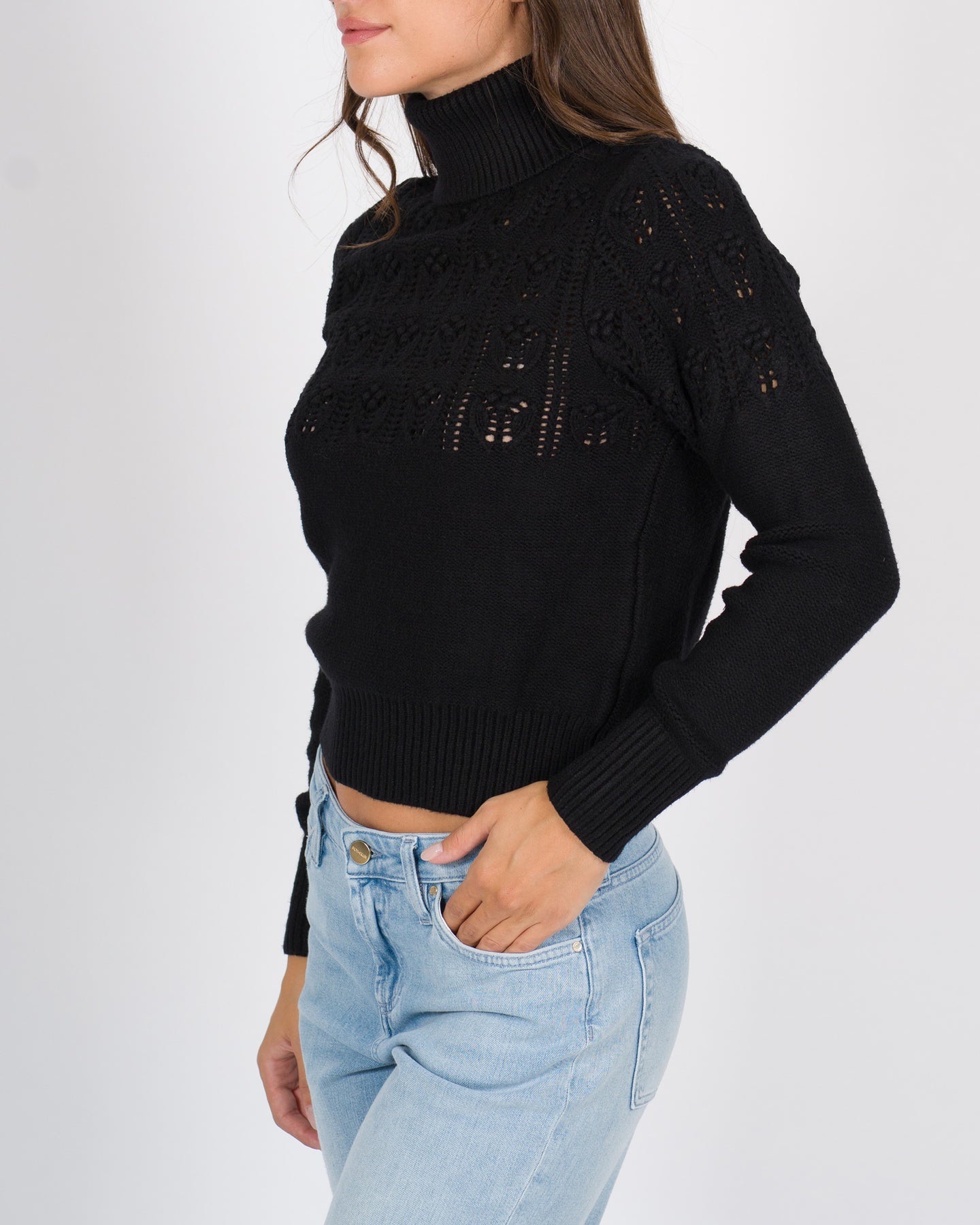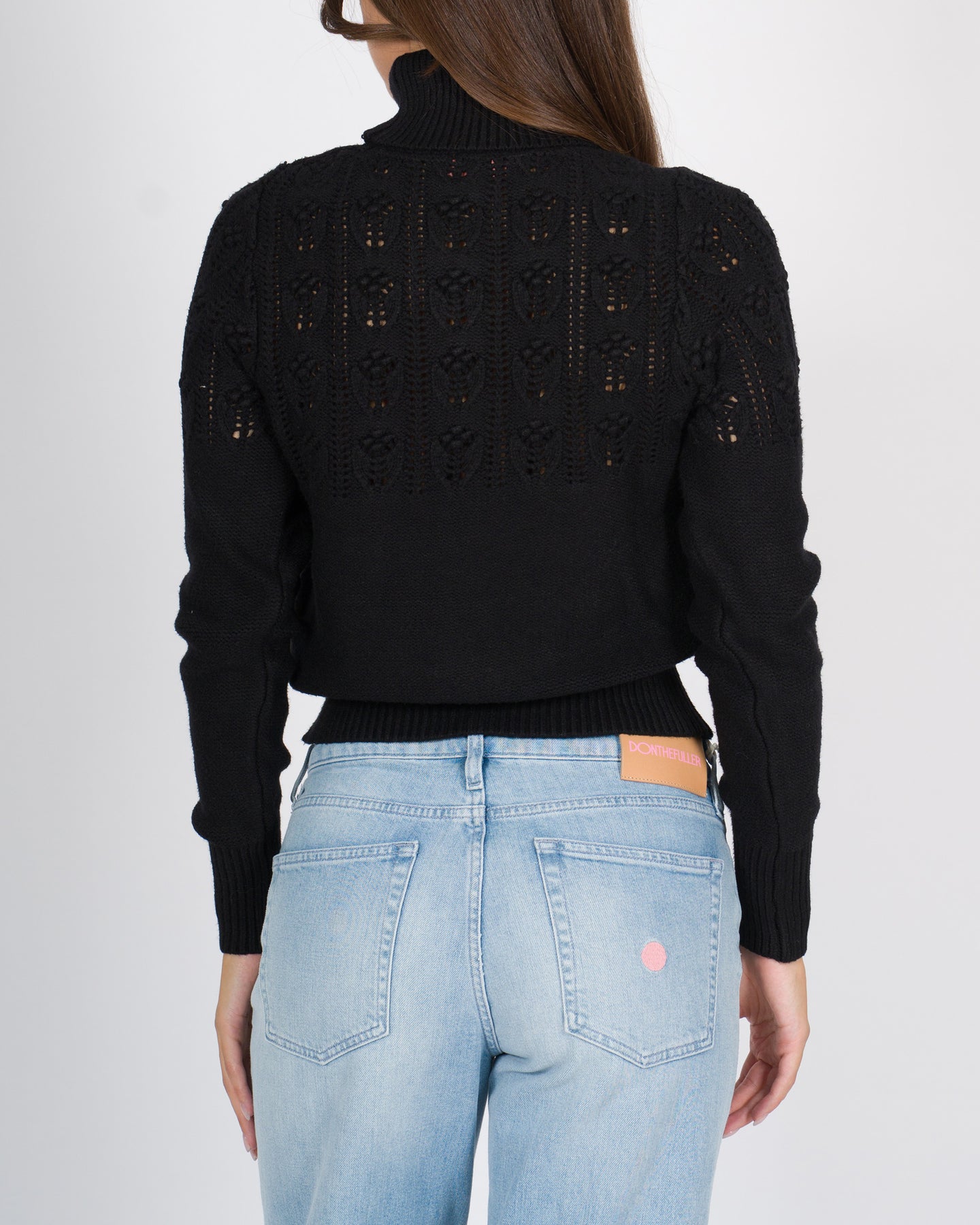 Dal fascino sofisticato e femminile, questo pullover collo alto unisce comfort e stile grazie a una lavorazione traforata che decora con discrezione il davanti, le spalle e la parte posteriore del capo.Realizzata in morbida viscosa avvolgente, è rifinita con bordature a costine su collo, polsini e fondo, per una mavestibilità definita e una maggiore stabilità delle forme.Dettagli tecnici:Maniche lunghe con polsini a costeFondo con bordatura a coste Vestibilità regolare Tessuto: viscosaColore: neroLa modella indossa la taglia S/M ed è alta 1.70.