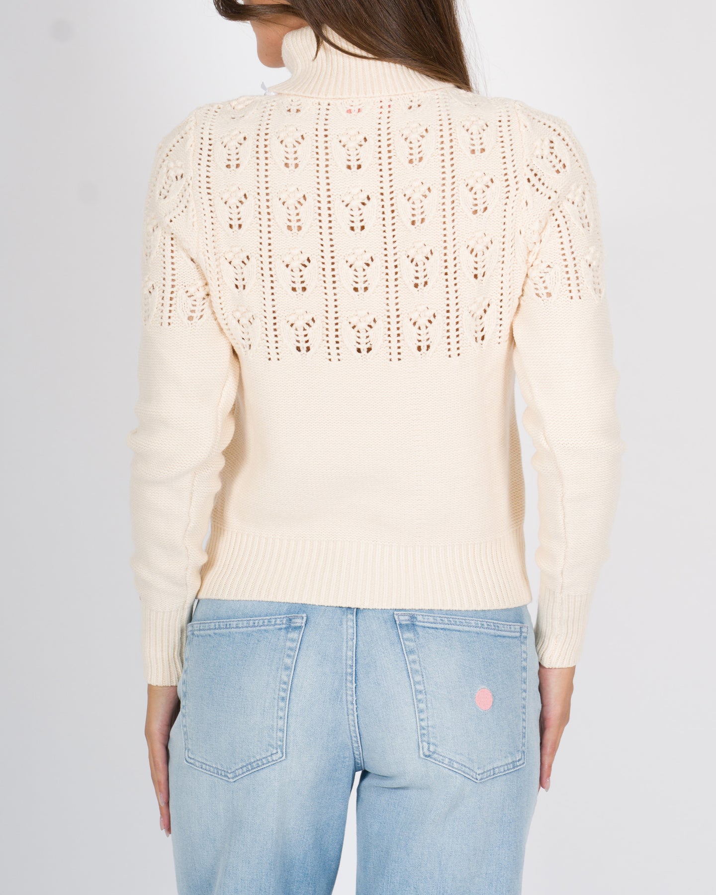 Dal fascino sofisticato e femminile, questo pullover collo alto unisce comfort e stile grazie a una lavorazione traforata che decora con discrezione il davanti, le spalle e la parte posteriore del capo.Realizzata in morbida viscosa avvolgente, è rifinita con bordature a costine su collo, polsini e fondo, per una mavestibilità definita e una maggiore stabilità delle forme.Dettagli tecnici:Maniche lunghe con polsini a costeFondo con bordatura a coste Vestibilità regolare Tessuto: viscosaColore: pannaLa modella indossa la taglia S/M ed è alta 1.70.