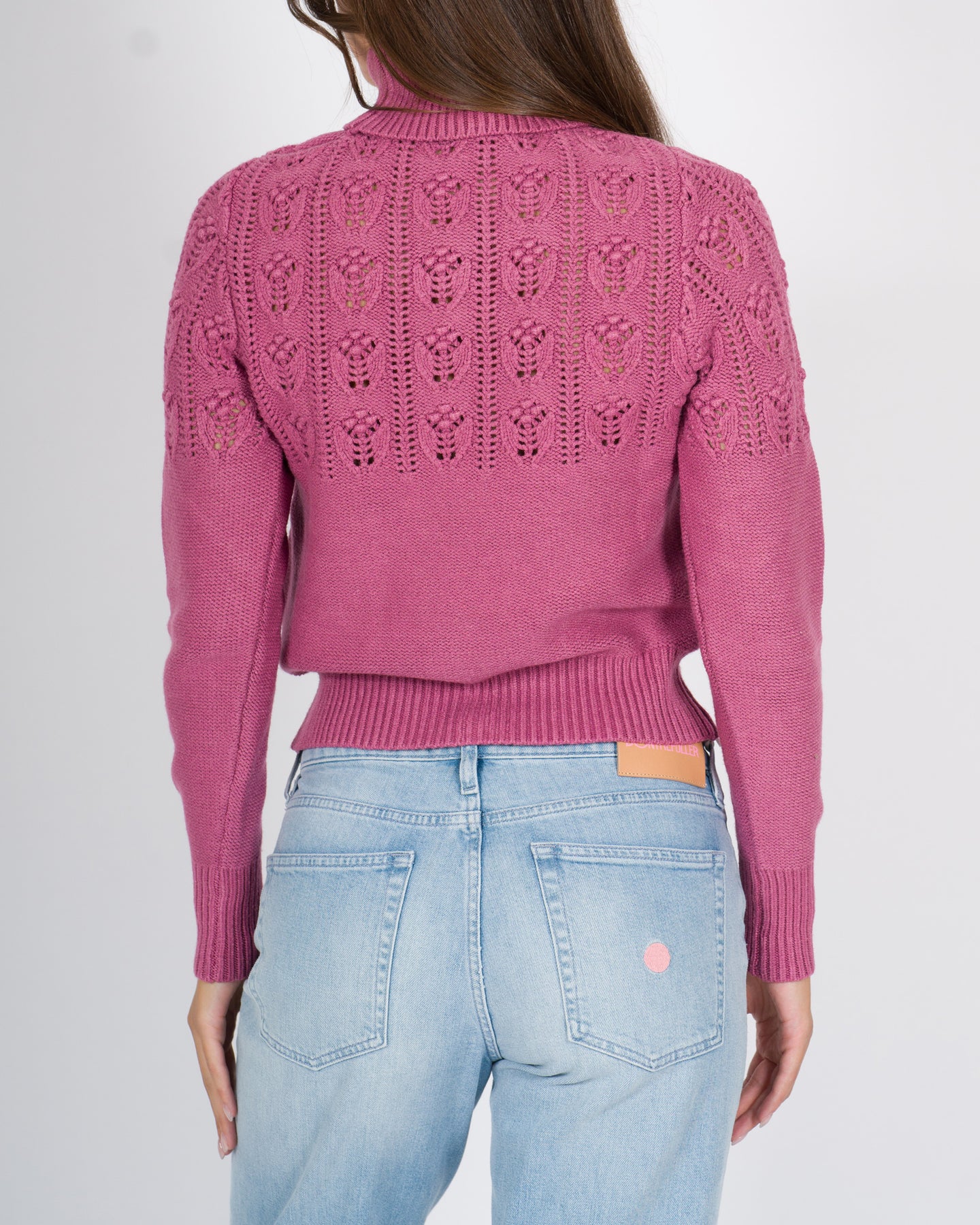 Dal fascino sofisticato e femminile, questo pullover collo alto unisce comfort e stile grazie a una lavorazione traforata che decora con discrezione il davanti, le spalle e la parte posteriore del capo.Realizzata in morbida viscosa avvolgente, è rifinita con bordature a costine su collo, polsini e fondo, per una mavestibilità definita e una maggiore stabilità delle forme.Dettagli tecnici:Maniche lunghe con polsini a costeFondo con bordatura a coste Vestibilità regolare Tessuto: viscosaColore: rosaLa modella indossa la taglia S/M ed è alta 1.70.