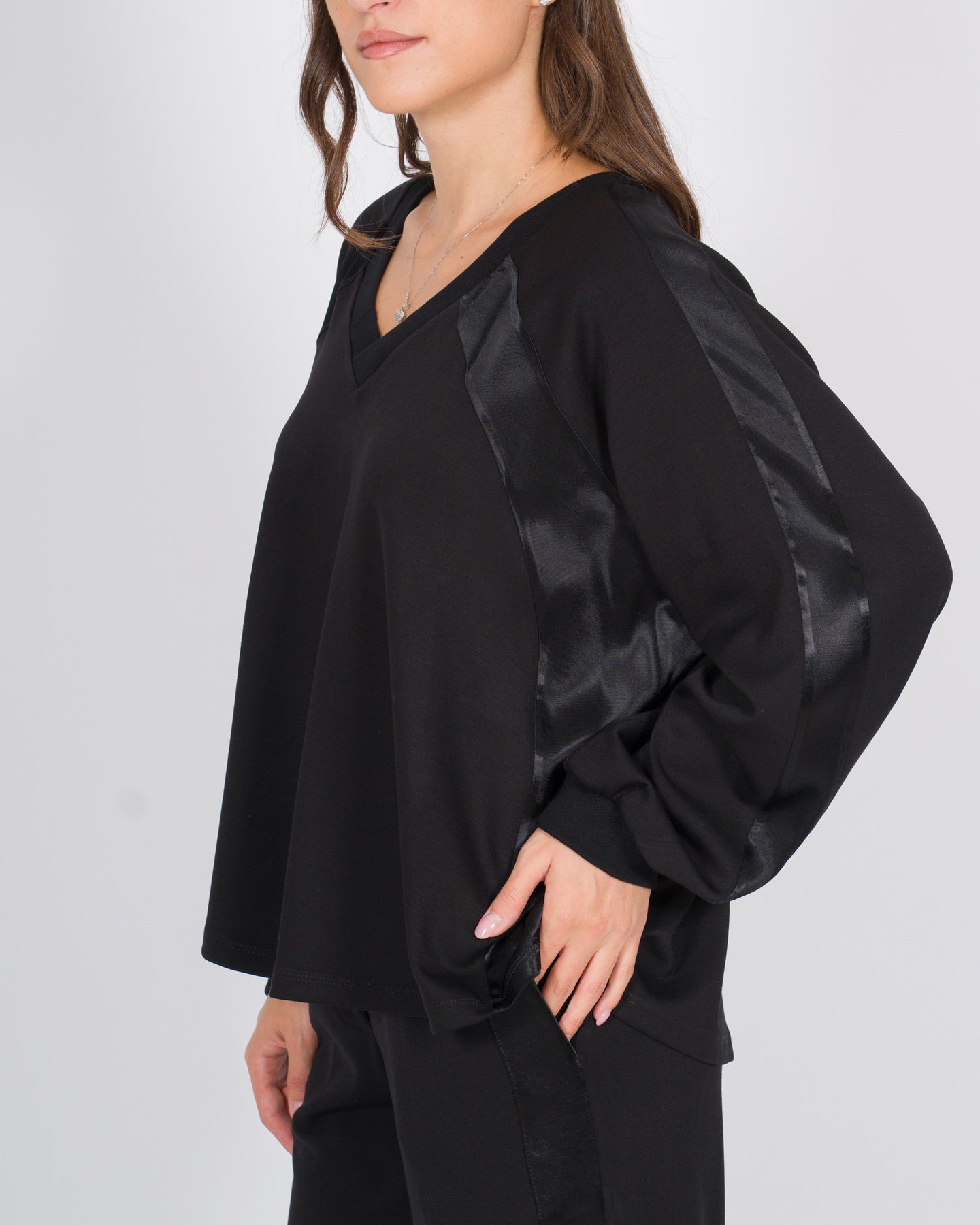 Questa blusa con scollo a V a coste combina comfort e raffinatezza in un design essenziale ma sofisticato. Le maniche lunghe con polsini a coste donano struttura e armonia alla silhouette, mentre i dettagli in raso aggiungono un tocco luminoso e delicato che eleva il capo con discreta eleganza.Perfetta per un look quotidiano elegante, si abbina con facilità a pantaloni sartoriali o gonne midi, adattandosi con versatilità a ogni occasione.