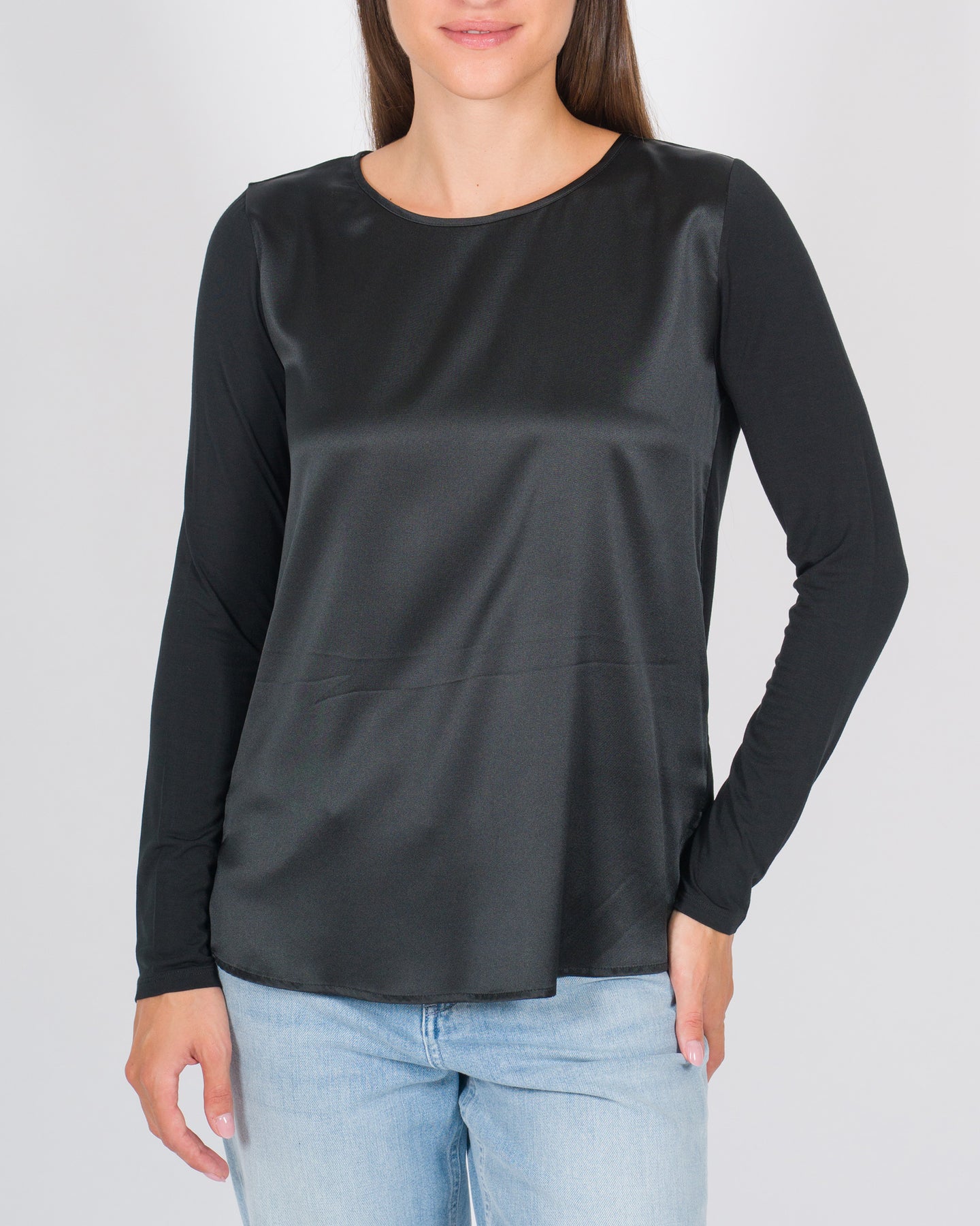 Elegante e raffinata, questa blusa è realizzata con un delicato contrasto di tessuti: seta liscia e luminosa sul davanti per un tocco di classe, mentre viscosa morbida e fluida sul retro e sulle maniche garantisce comfort e vestibilità. Il girocollo pulito e le maniche lunghe la rendono perfetta sia per un look formale che per uno stile casual-chic. Versatile e femminile, è un capo ideale da abbinare a pantaloni sartoriali o jeans.Dettagli tecnici:Tessuto: seta e viscosaColore: neroLa modella indossa la taglia S ed è alta 1.70.