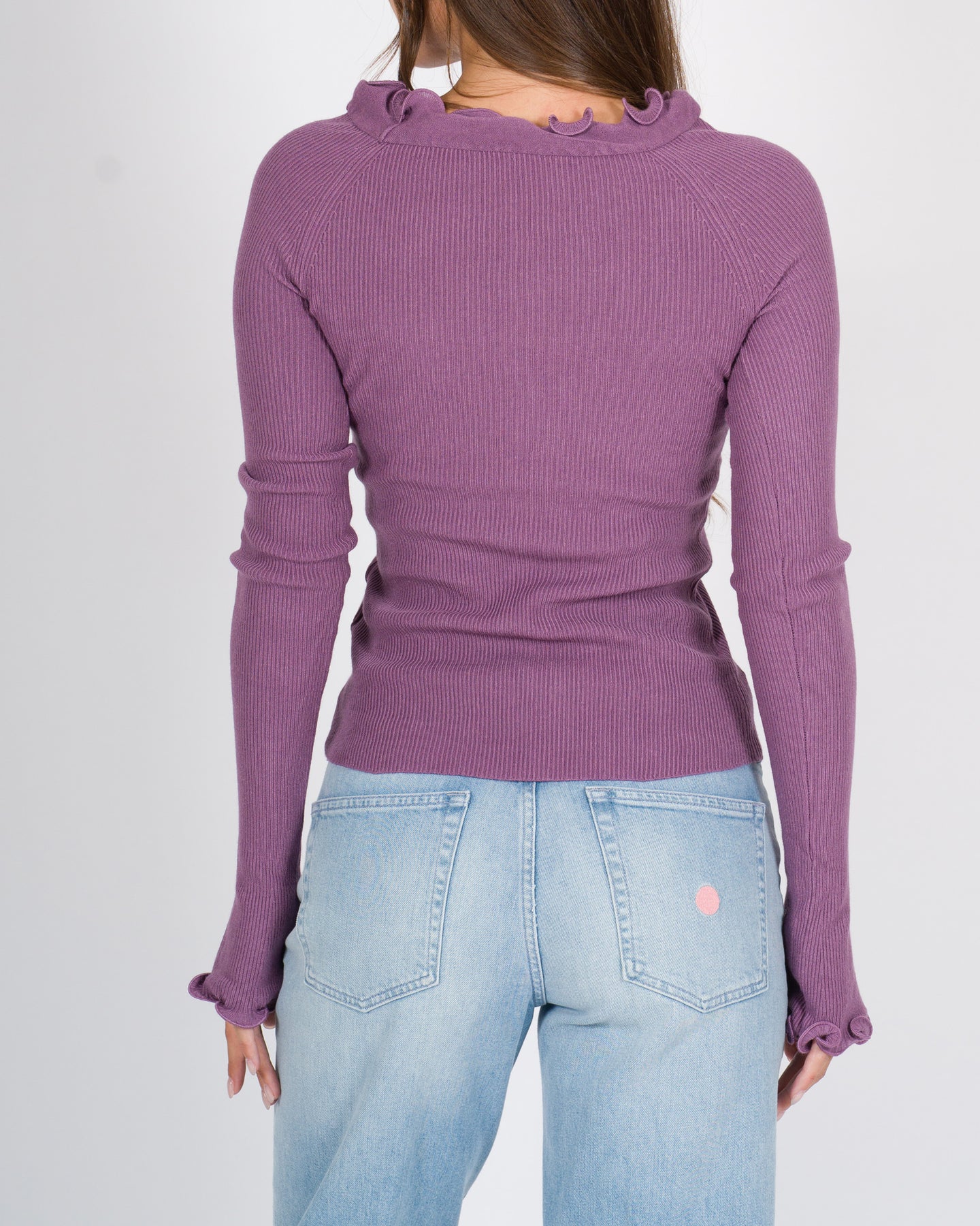 Pulito nelle linee ma ricco nei dettagli, questo pullover manica lunga in viscosa si distingue per la sua lavorazione a costine che dona struttura e dinamicità al capo.I profili del collo e dei polsini sono impreziositi da un delicato bordo smerlato, che aggiunge un tocco femminile e raffinato alla maglia, senza rinunciare alla sobrietà.Dettagli tecnici:•Collo smerlato•Polsini smerlati•Vestibilità: slim fit•Tessuto: viscosa•Lavorazione a costine•Colore: melanzanaLa modella indossa la taglia S/M ed è alta 1.70.