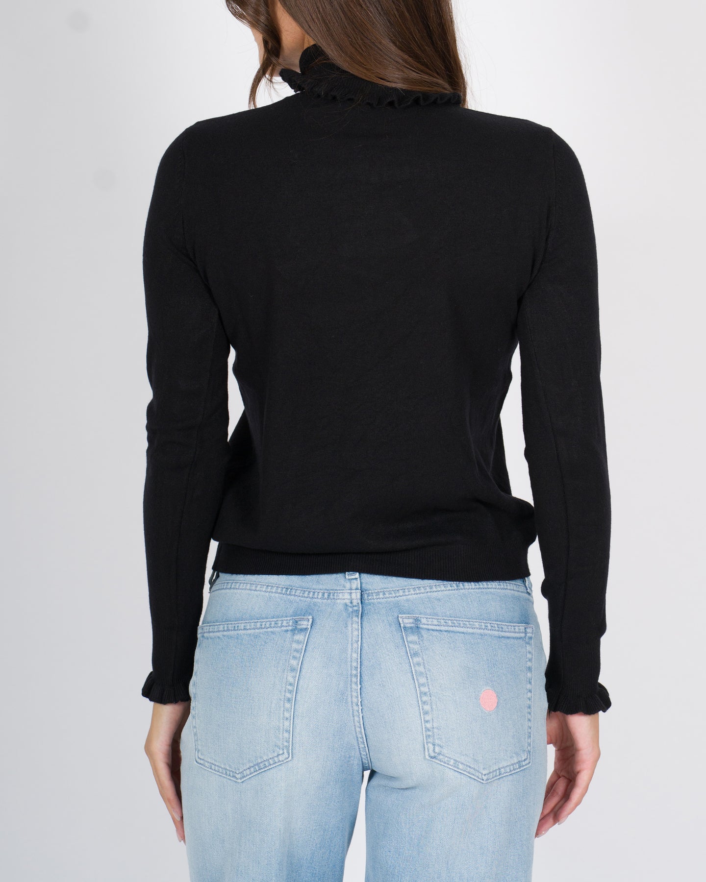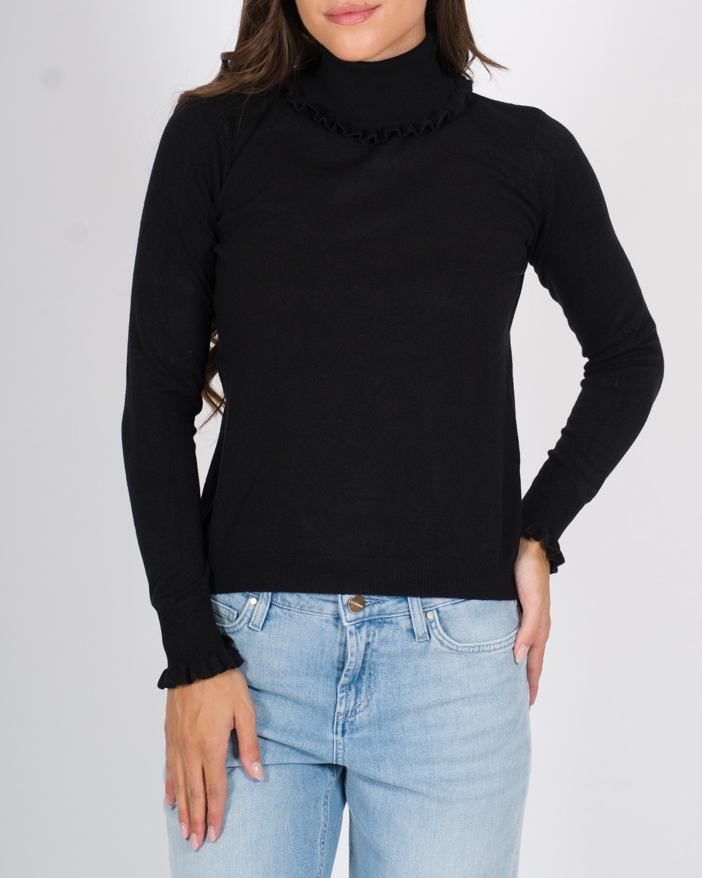 Elegante e femminile, questo pullover colo alto è realizzato in morbida viscosa elasticizzata, perfetta per accompagnare forme con leggerezza e confort. La sua linea essenziale è impreziosita da un raffinato dettaglio smerlato sul bordo del collo e dei polsi, che dona un tocco delicato e ricercato, ideale sia per il giorno che per la sera.Dettagli tecnici:•Carattere: elegante, raffinato•Tessuto: Viscosa•Vestibilità: regolare•Colore: neroLa modella indossa la taglia S/M ed è alta 1.70.