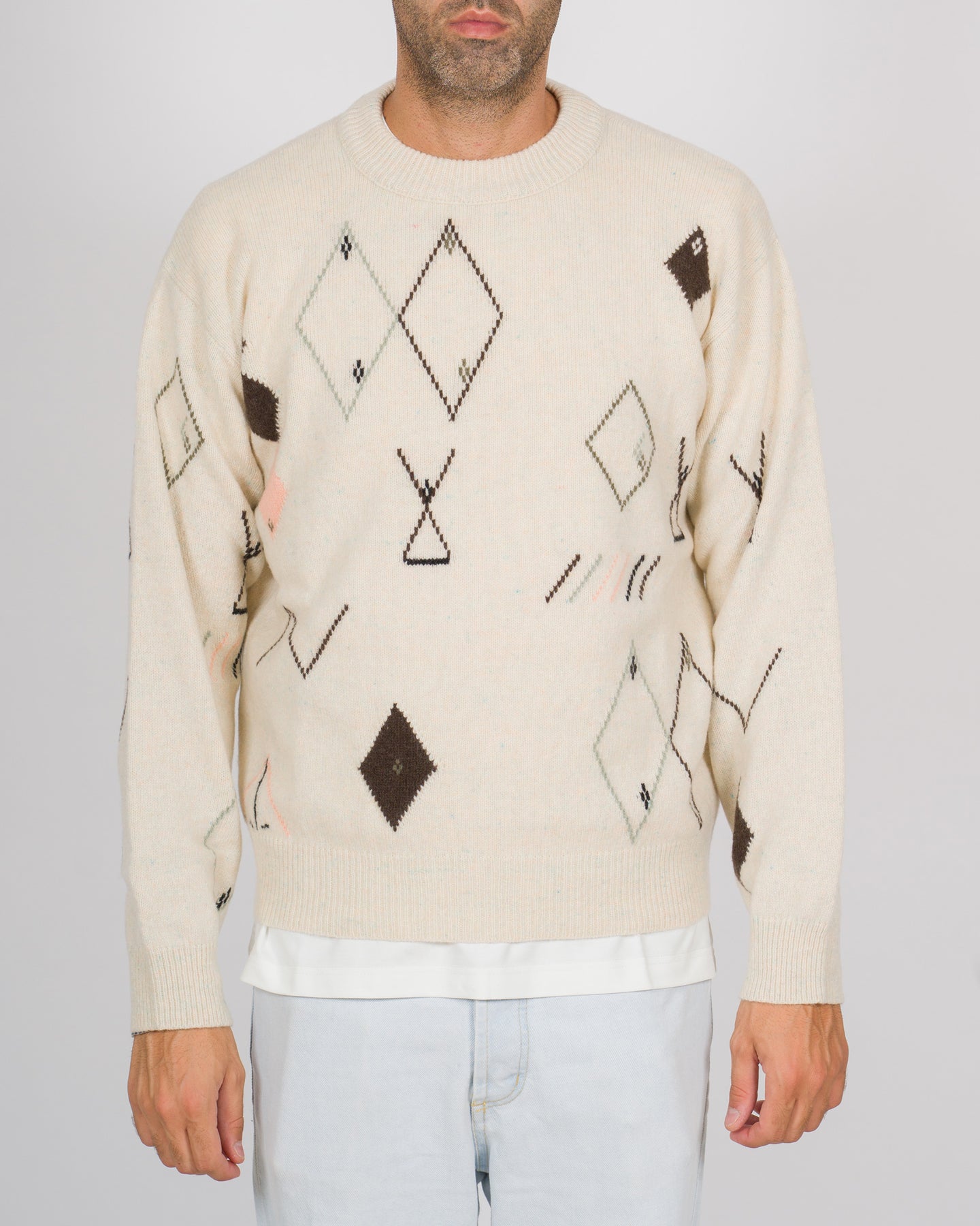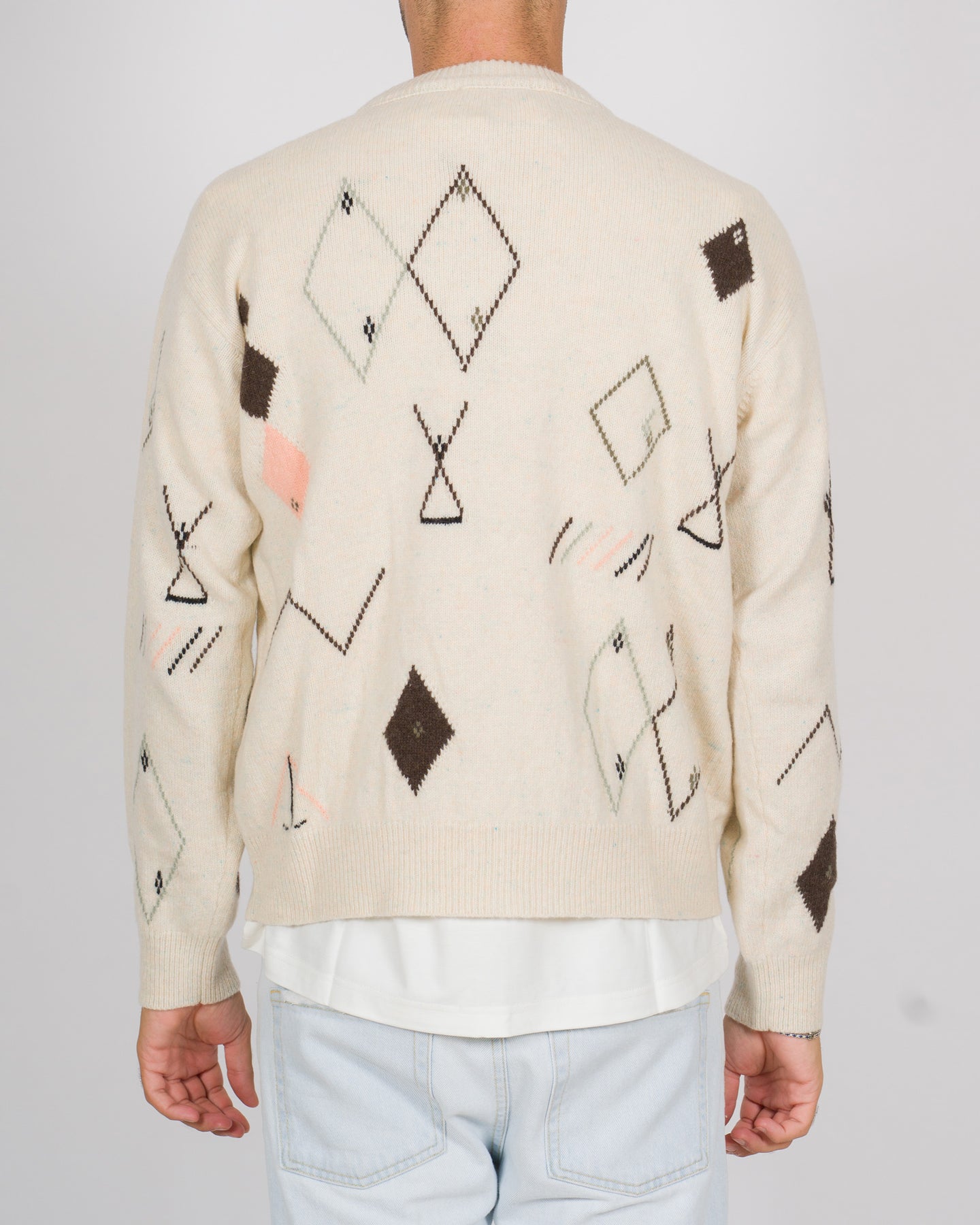 Questo maglione girocollo in lana 100% color panna unisce tradizione e modernità. La sua lavorazione a rombi effetto Navajo richiama motivi artigianali senza tempo, mentre la vestibilità aggiornata dona al capo un'attitude contemporanea e versatile. Le maniche lunghe e la texture calda e avvolgente lo rendono ideale per completare look casual raffinati o per aggiungere un tocco ricercato ad abbinamenti più urbani.Dettagli:Colore: panna100% lanaGirocolloManiche lungheLavorazione a rombi effetto NavajoVestibilità moderna