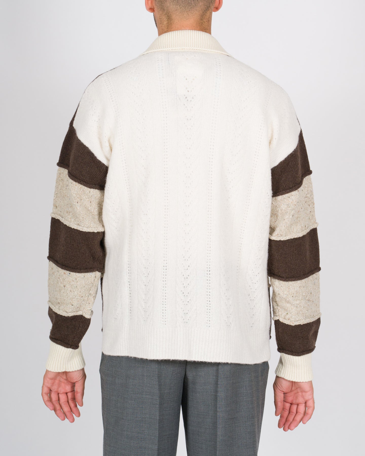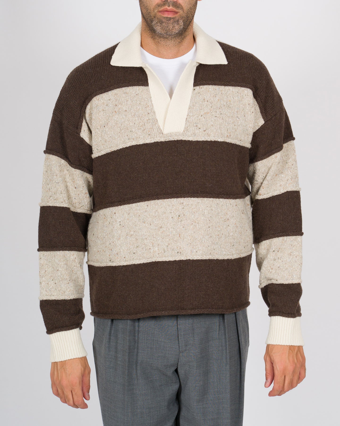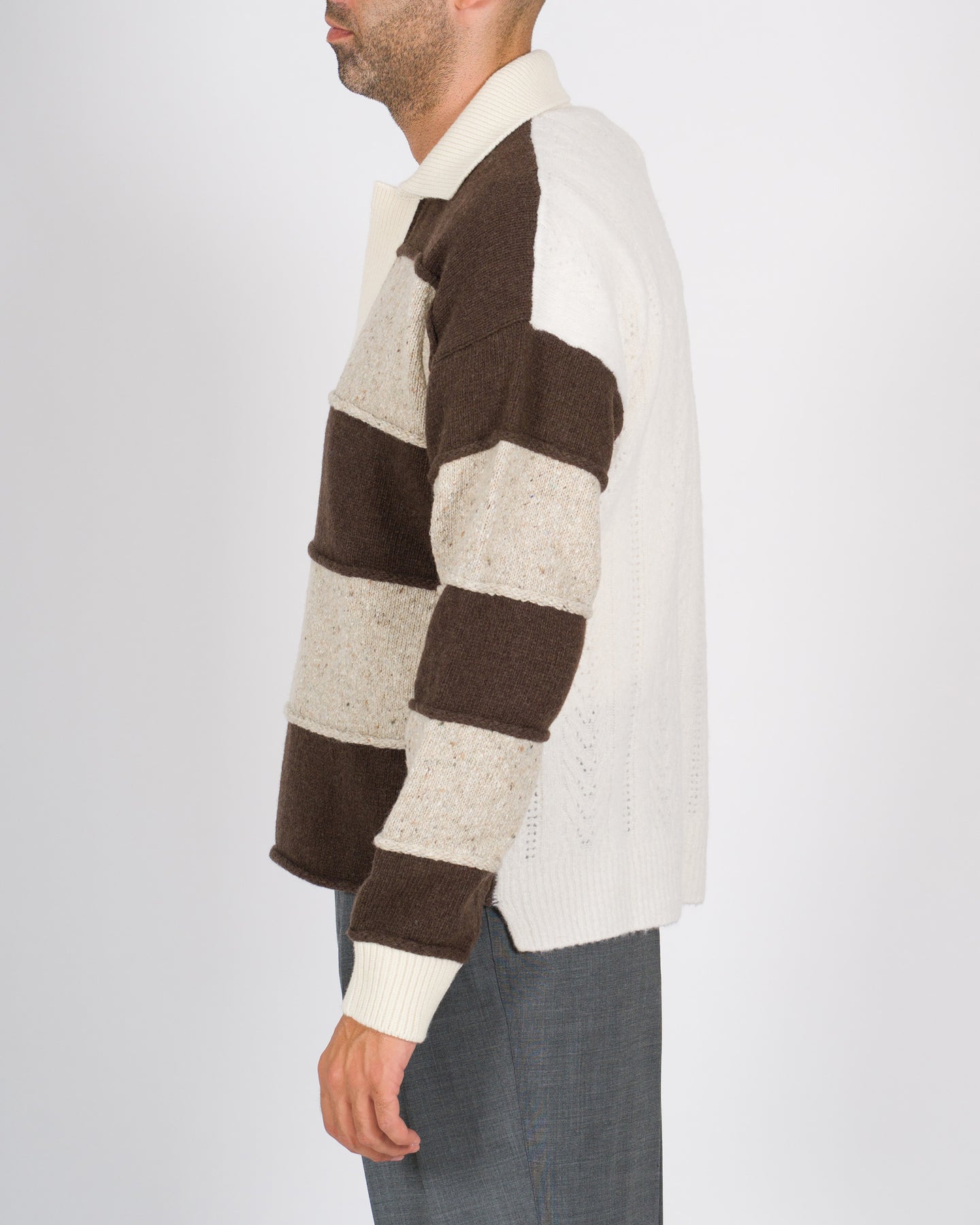 Questa polo Skipper in lana cardata combina comfort e stile in un capo distintivo. Il design presenta fasce in contrasto beige e marrone, che donano profondità e carattere alla polo, mentre il collo Skipper aggiunge un dettaglio raffinato e moderno. La vestibilità comoda e il tessuto morbido la rendono perfetta per look casual-chic o per stratificazioni eleganti nelle stagioni più fresche.DettagliColore: beige e marroneCollo SkipperTessuto: lana cardataFasce in contrastoManiche lungheVestibilità comodaStile contemporaneoComposizione:100% lana cardata Made in Italy Lavare a mano o a secco delicato