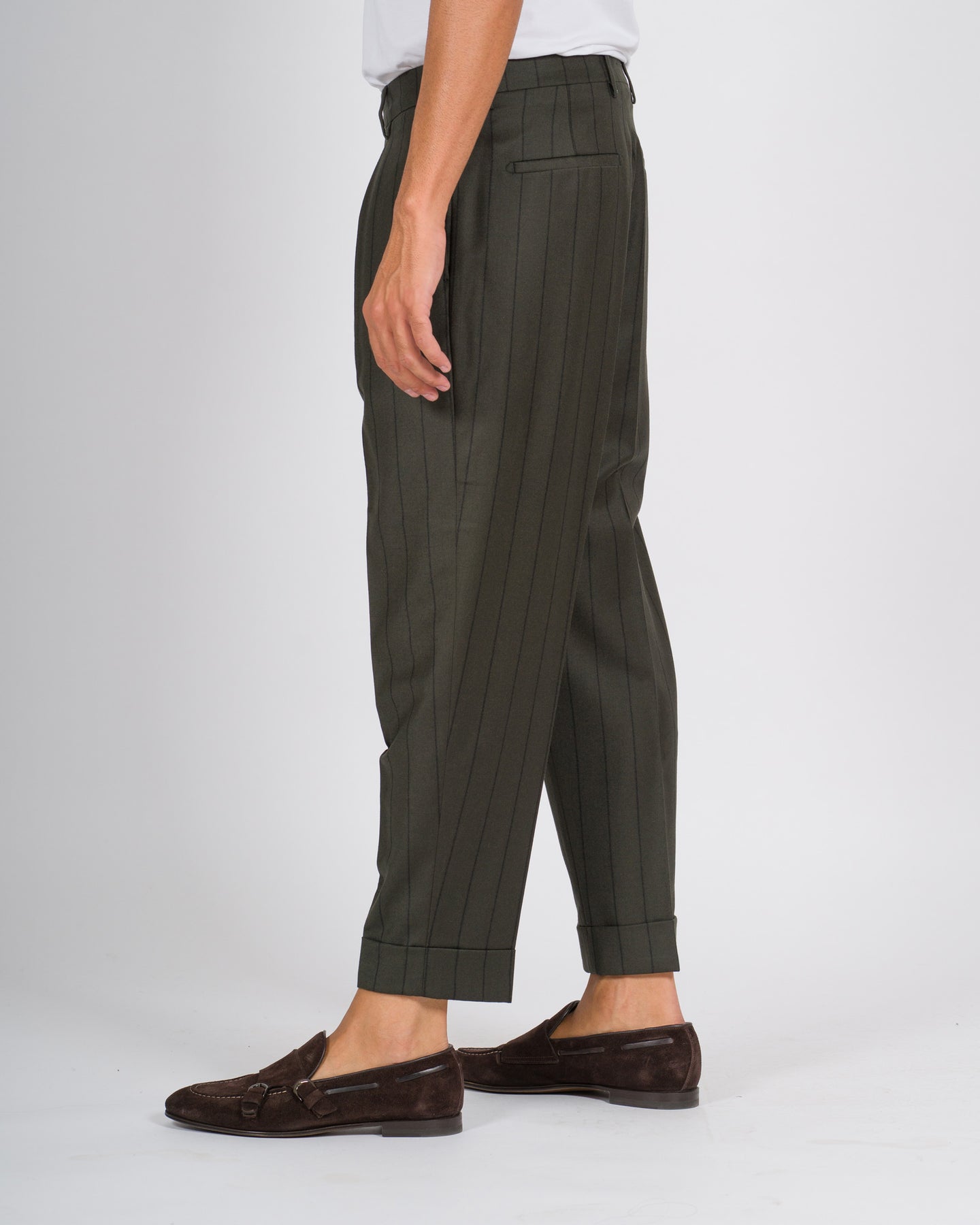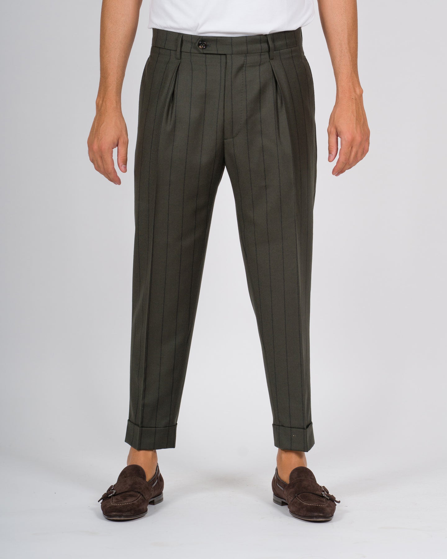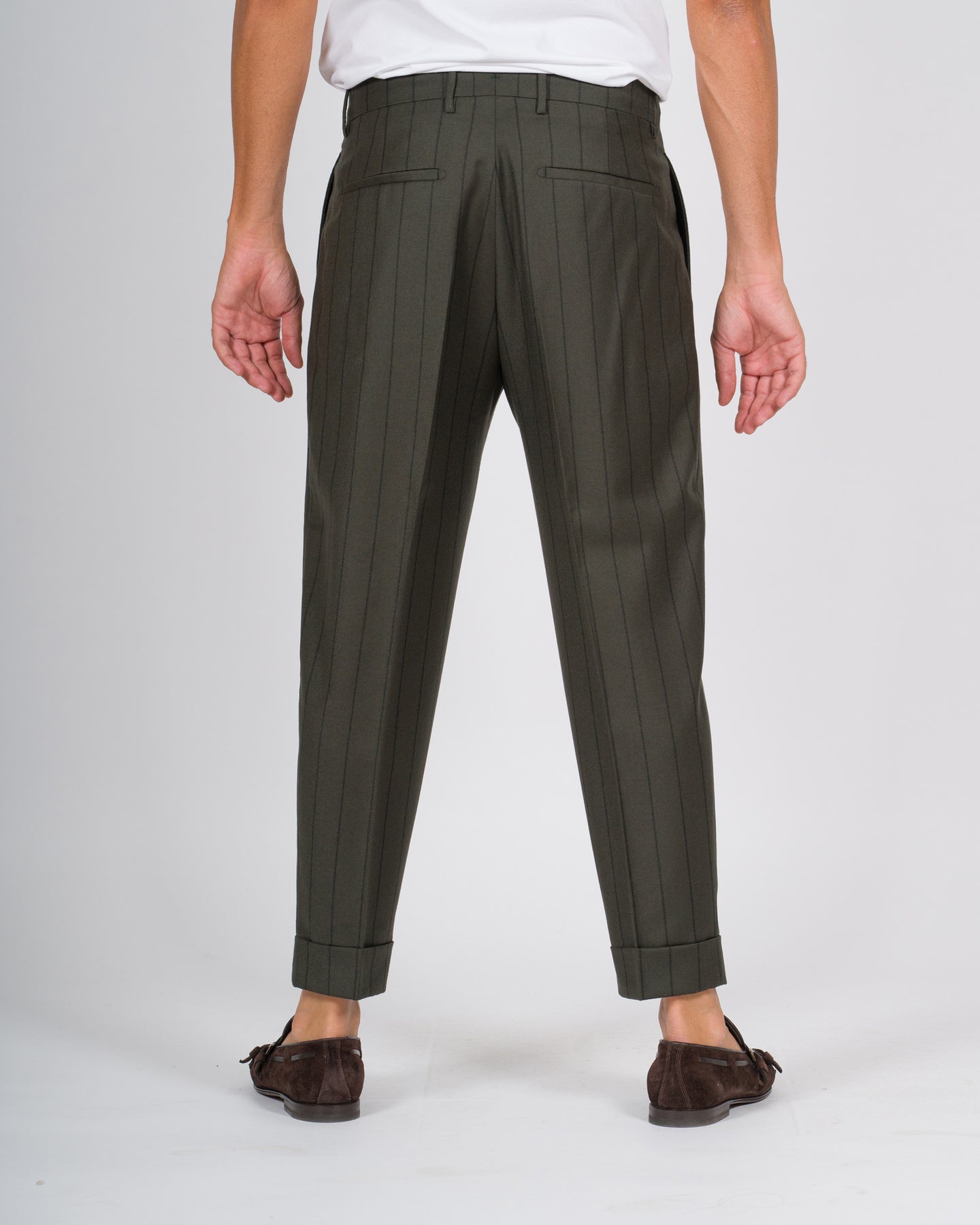 I pantaloni Berwich modello Chiaia, rappresentano un capo sartoriale di ispirazione napoletana, pensato per l'uomo che ricerca uno stile elegante e contemporaneo. Realizzati in pura lana gessato.Il design con pence frontali singole, cintura a passanti e chiusura e chiusura con bottoni e zip sottolinea l'attenzione ai dettagli tipica del brand Berwich. La vestibilità regolare, leggermente affusolata sul fondo, garantisce comfort e proporzioni armoniose.Dettagli tecnici:Modello: ChiaiaTessuto: 100% lana Colore: Verde gessatoIl modello indossa la taglia 48 ed è alto 1.90.