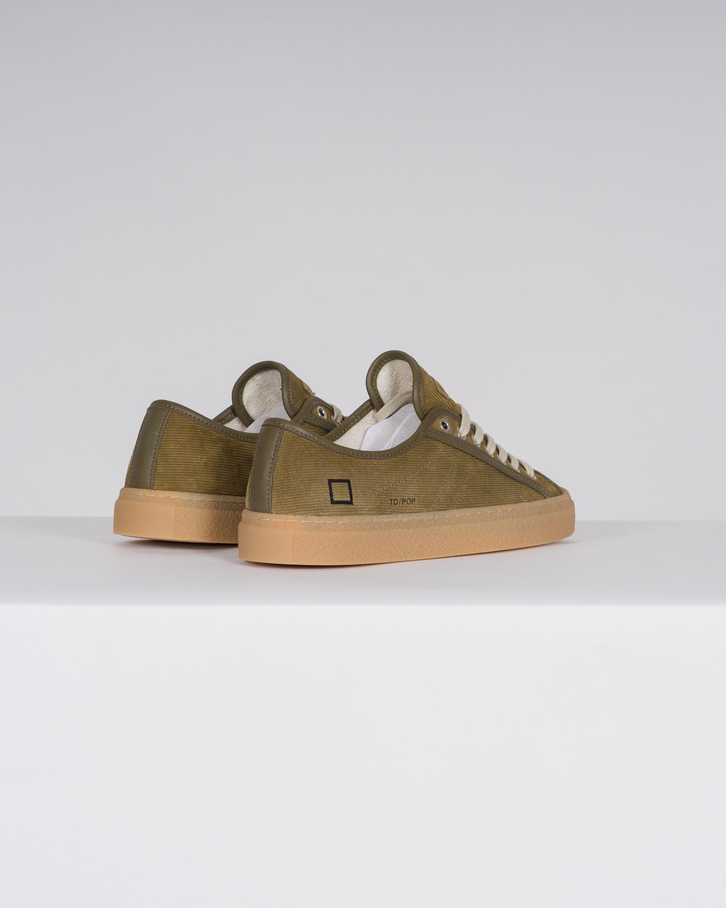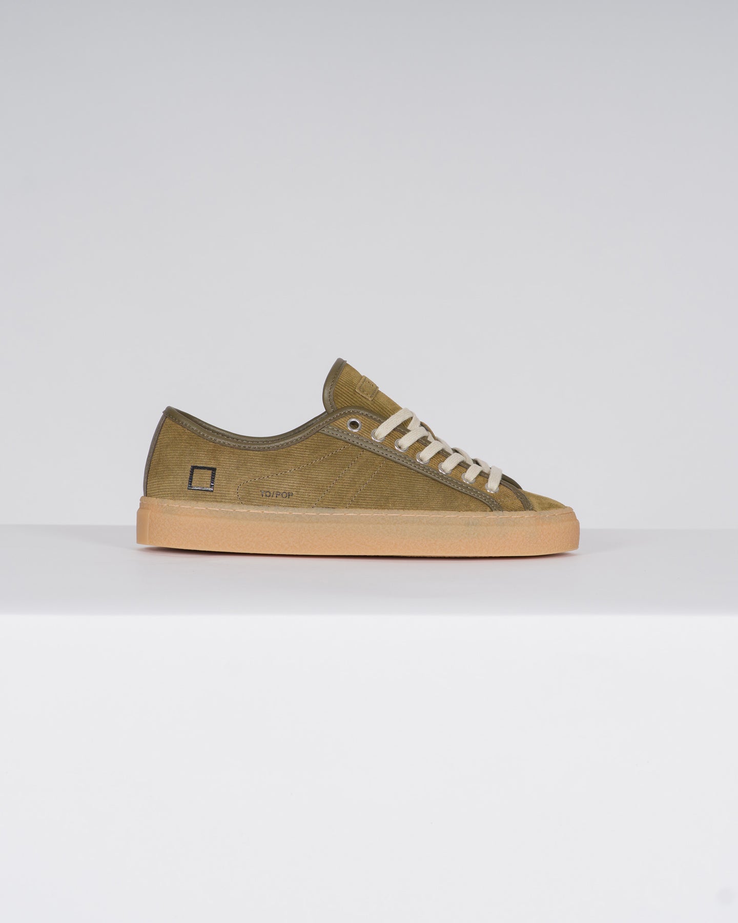 Sneakers bassa in suede a costine verde militare con profili tono su tono.-La label in suede verde militare, con impressa la scritta D.A.T.E., è cucita sulla linguetta.-I lacci sono in cotone.-Il logo quadrato e il codice del modello sono impressi lateralmente.-Fodera in spugna di cotone.-Soletta interna rialzata di 2,5 cm per un miglior comfort.-Suola in gomma cucita effetto cemento alta 3 cm.-Tutti i materiali selezionati sono Made in Italy.-Vestibilità: REGULAR
