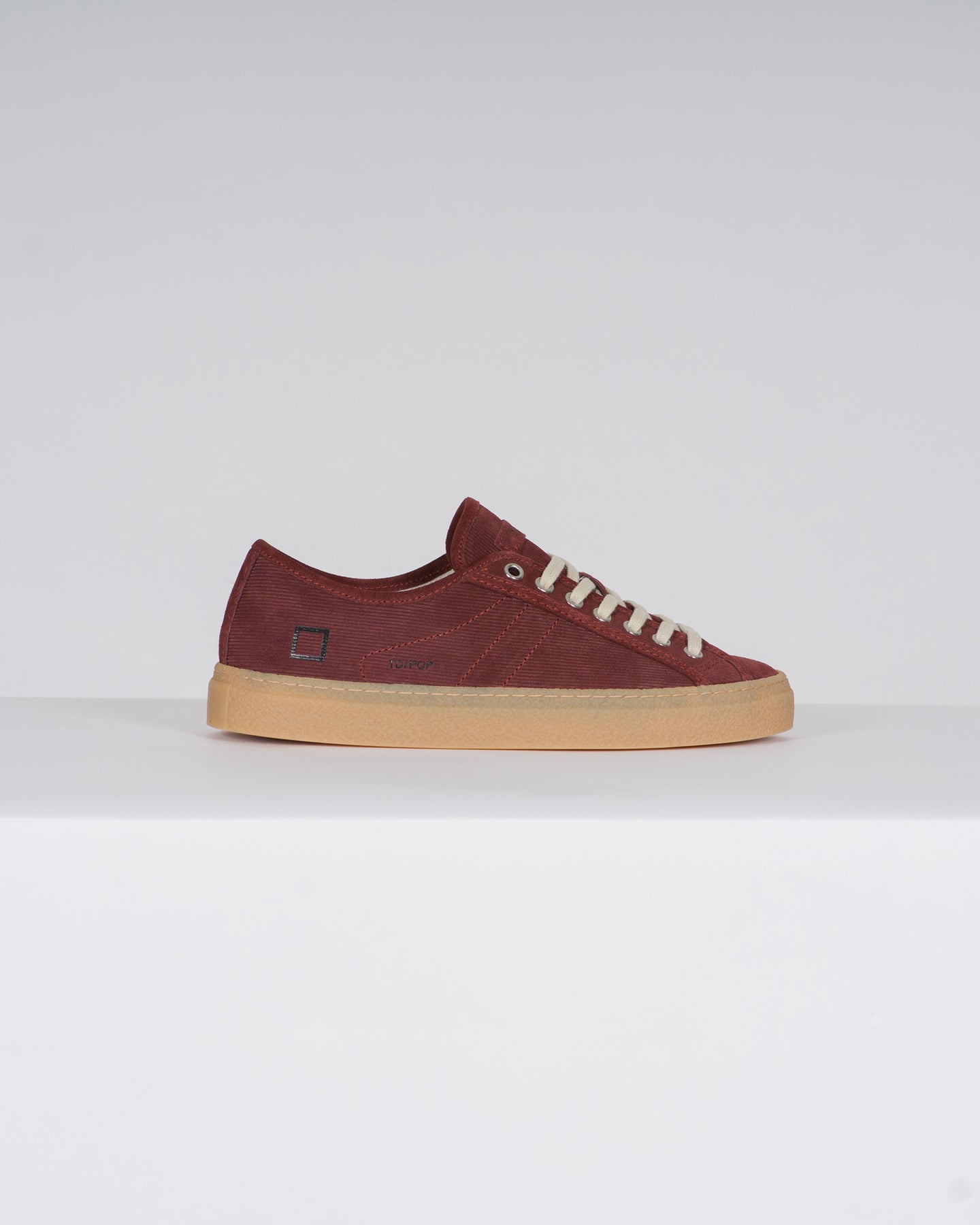 Sneakers bassa in suede a coste colore bordeaux con profili in suede beige.-La label in suede marrone, con impressa la scritta D.A.T.E., è cucita sulla linguetta.-I lacci sono in cotone.-Il logo quadrato è ricamato lateralmente.-Fodera in spugna di cotone.-Soletta interna rialzata di 2,5 cm per un miglior comfort.-Suola in gomma cucita effetto cemento alta 3 cm.-Tutti i materiali selezionati sono Made in Italy.-Vestibilità: REGULAR