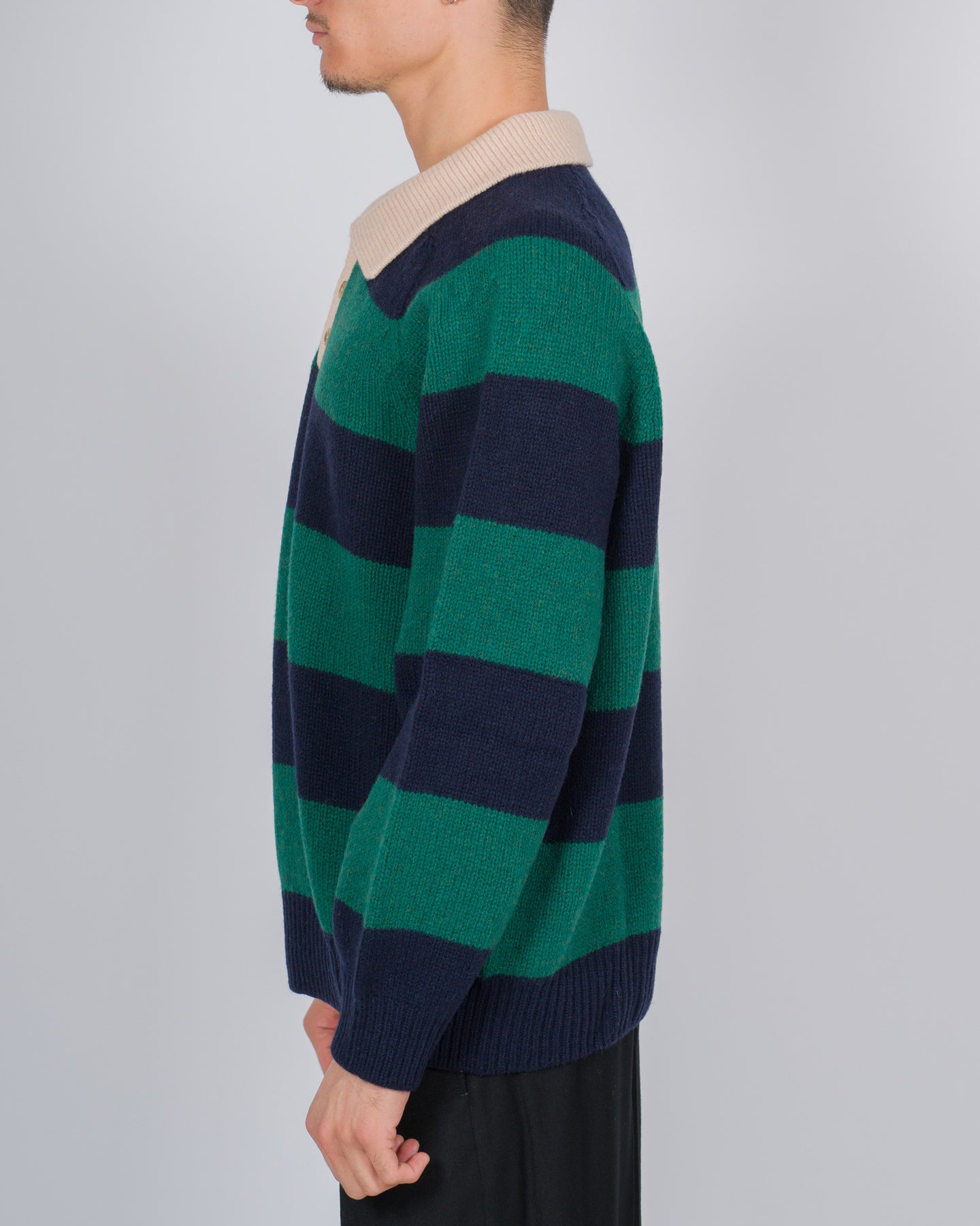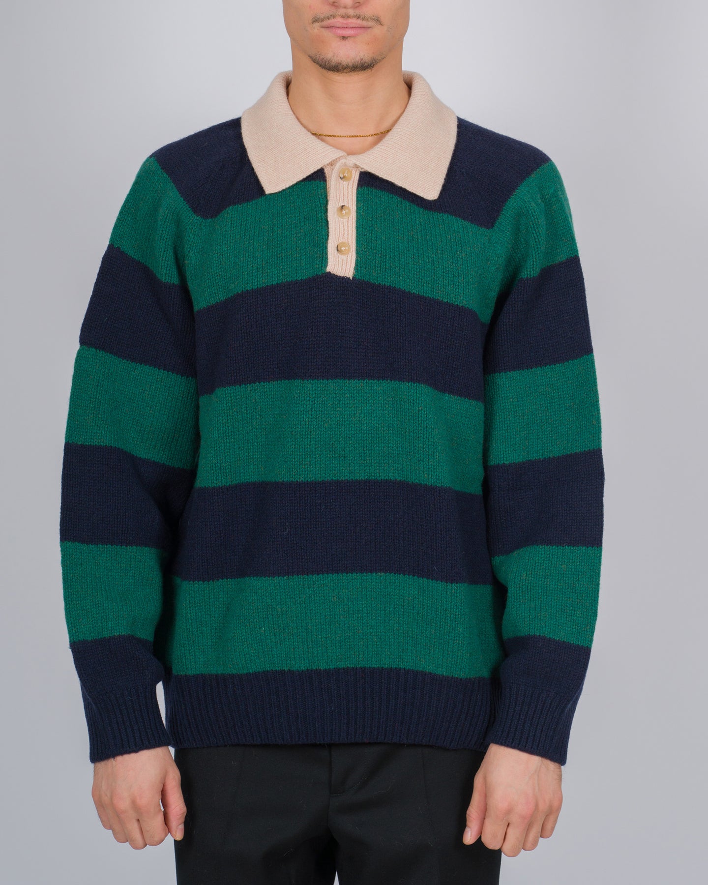 Polo rugby in lana scozzese a righe blu e verde con colletto panna