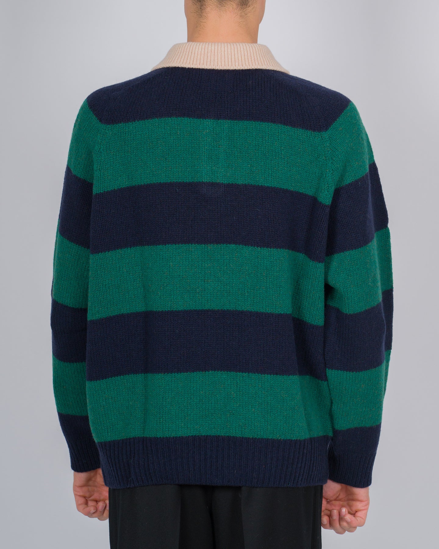 Un'interpretazione contemporanea dell'iconica polo rugby firmata HOWLIN', che combina spirito sportivo e savoir-faire artigianale.Realizzata in Olanda con pura lana proveniente dalla Scozia, presenta un taglio ampio e un design rigato nei toni del blu e del verde, completato da un colletto a contrasto panna.Calda, morbida e ricca di personalità, è perfetta per un look rilassato ma sofisticato.