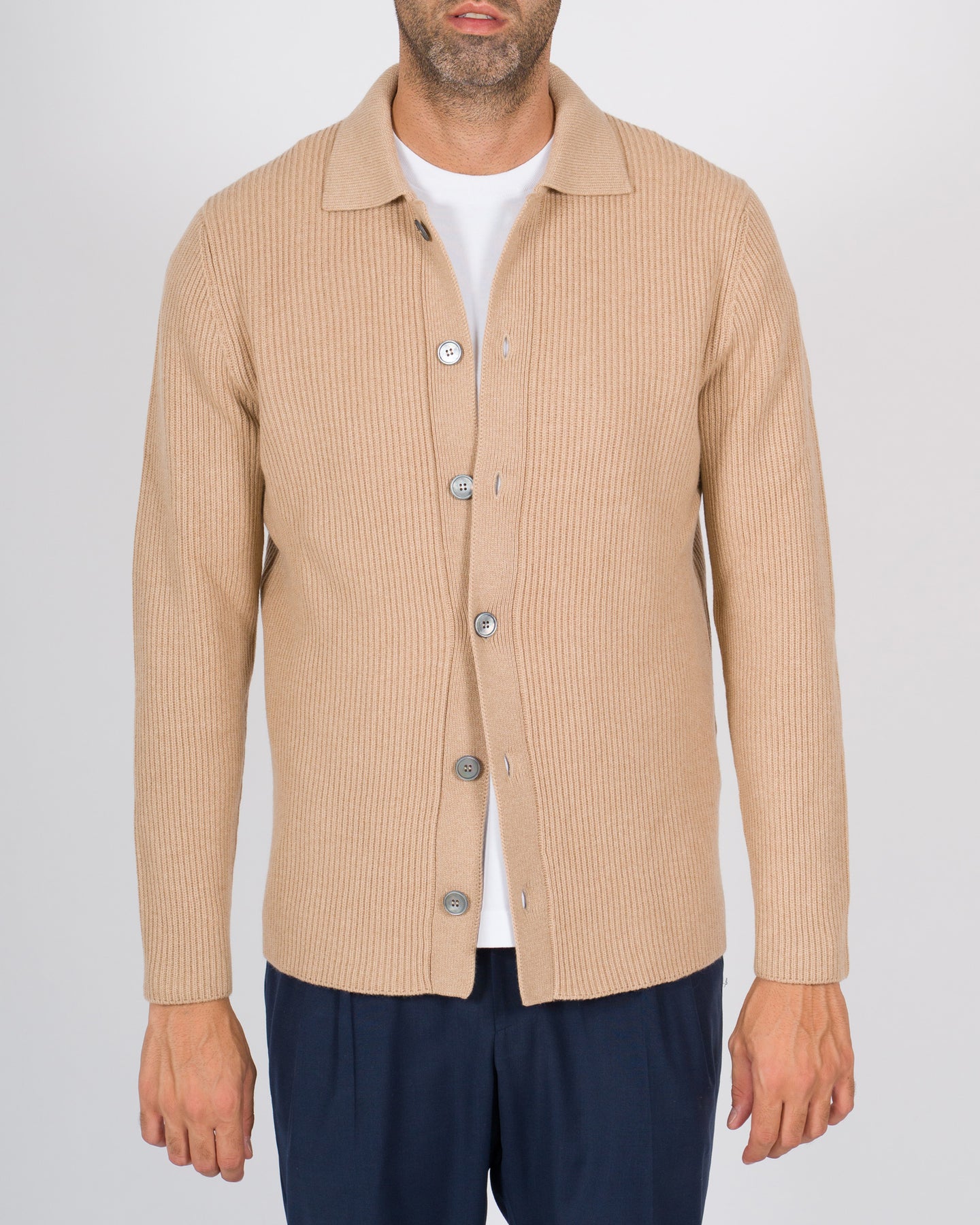Questo cardigan a costine in colore beige è un capo elegante e versatile, ideale per completare outfit sia casual che raffinati. Il modello presenta collo a camicia e chiusura frontale con bottoni per un look classico, mentre l'assenza di polsi elastici conferisce una linea più morbida e fluida alle maniche. La lavorazione a costine dona struttura al tessuto e un tocco contemporaneo al design.Dettagli:Colore: beigeLavorazione a costineCollo a camiciaChiusura frontale con bottoniManiche senza polsi elasticiVestibilità regolareComposizione:Tessuto: lanaMade in Italy Lavare a mano o a secco delicato