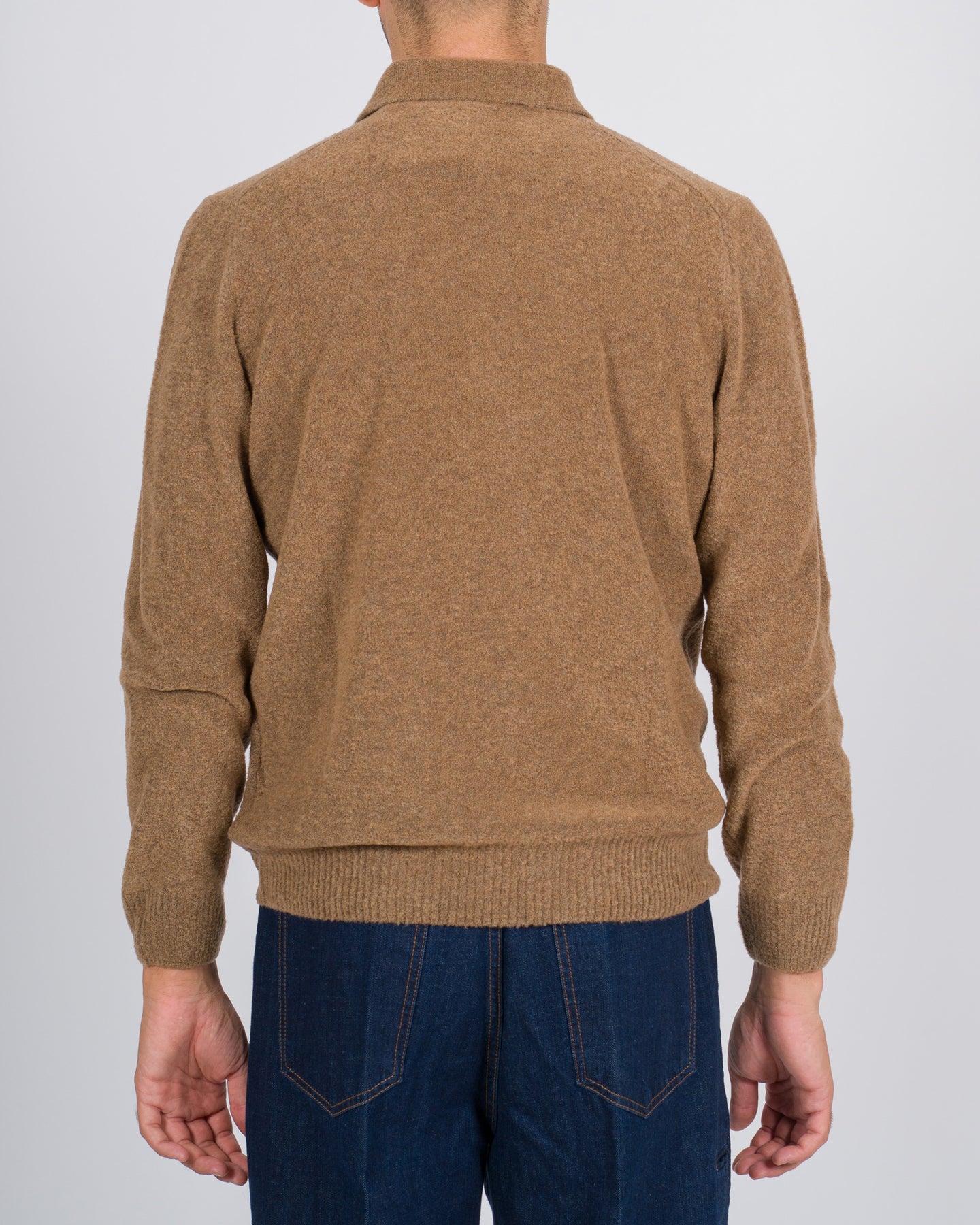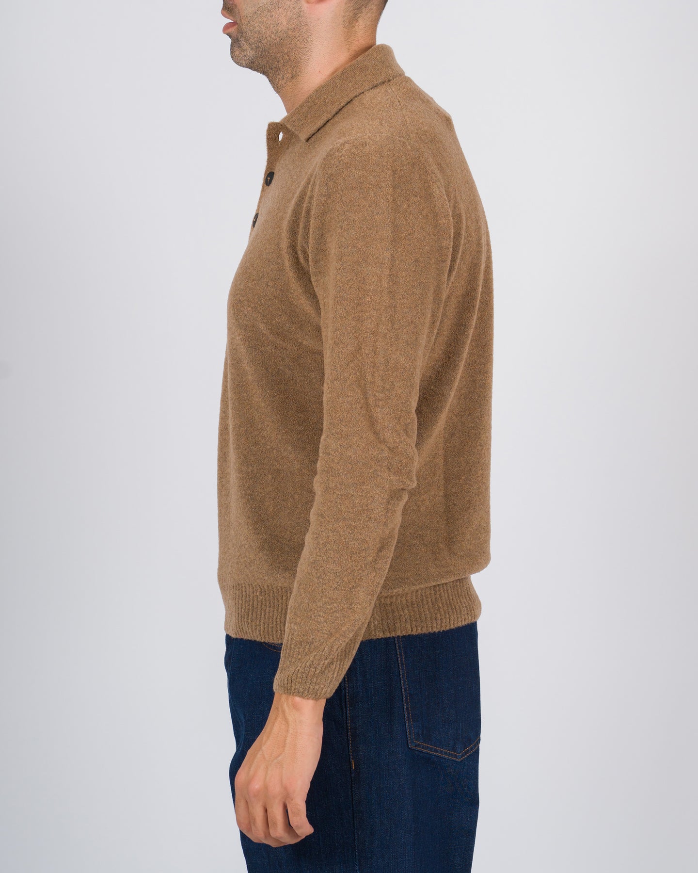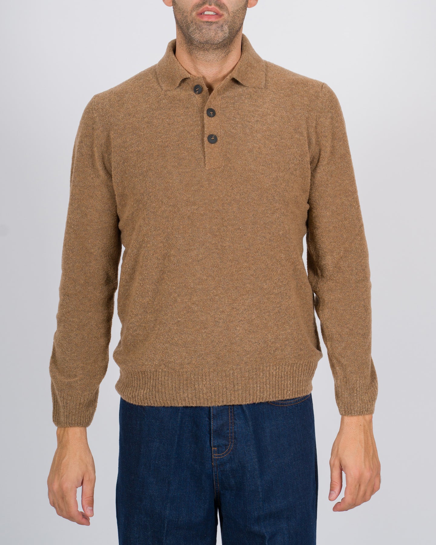 La polo maschile della linea Fileria in tessuto lana melangiata colore cammello è un capo elegante e contemporaneo, realizzato in lana di alta qualità con effetto grattato che conferisce morbidezza, calore e una texture raffinata, con chiusura a tre bottoni che permette di regolare lo scollo a seconda dello stile desiderato, collo classico morbido che valorizza la linea del collo e facilita il layering con giacche o maglioni leggeri, maniche lunghe dal taglio confortevole con polsini rifiniti e fondo dritto per una vestibilità equilibrata, linea leggermente slim che segue le forme senza comprimere e colore cammello versatile che rende la polo facilmente abbinabile a pantaloni sartoriali, jeans o chino, incarnando uno stile sofisticato, caldo e funzionale.