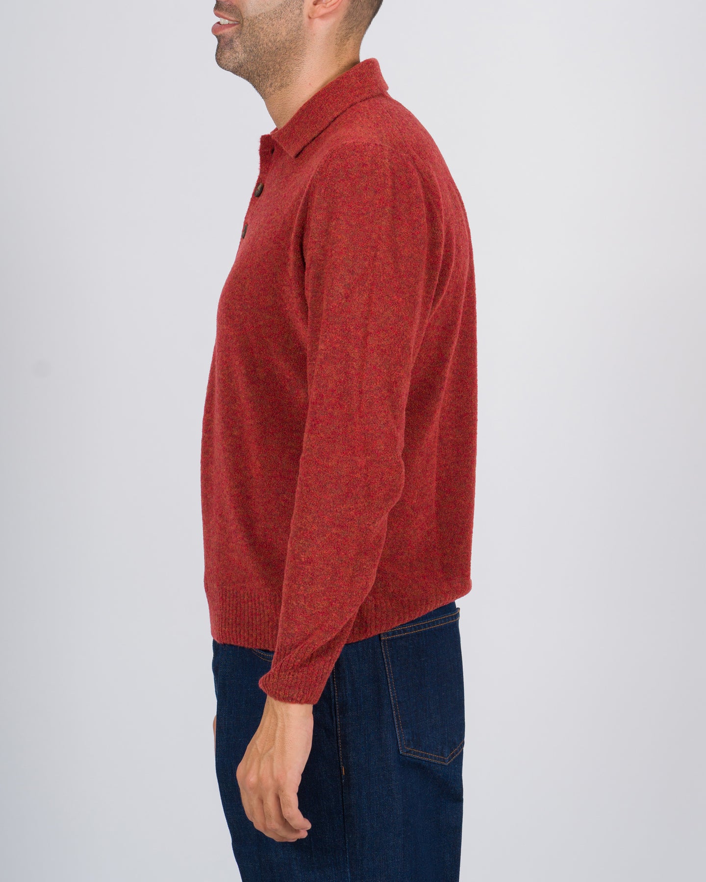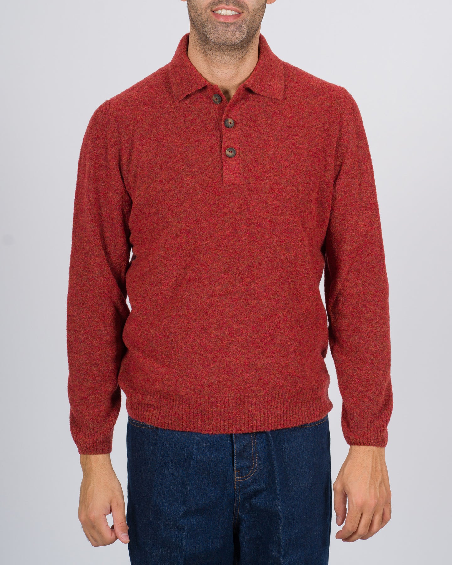 La polo maschile della linea Fileria in tessuto lana melangiata colore mattone è un capo elegante e contemporaneo, realizzato in lana di alta qualità con effetto grattato che conferisce morbidezza, calore e una texture raffinata, con chiusura a tre bottoni che permette di regolare lo scollo a seconda dello stile desiderato, collo classico morbido che valorizza la linea del collo e facilita il layering con giacche o maglioni leggeri, maniche lunghe dal taglio confortevole con polsini rifiniti e fondo dritto per una vestibilità equilibrata, linea leggermente slim che segue le forme senza comprimere e colore cammello versatile che rende la polo facilmente abbinabile a pantaloni sartoriali, jeans o chino, incarnando uno stile sofisticato, caldo e funzionale.