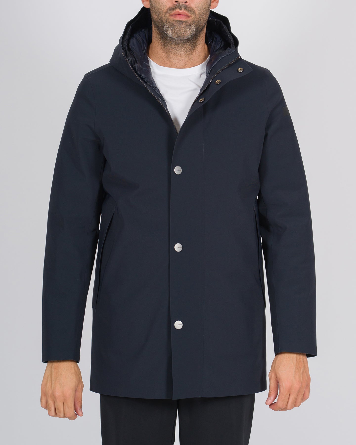 È l'ispirazione stilistica che soffia dall'oceano, a disegnare l'eleganza minimalista di questo parka caldo e protettivo, dotato di cappuccio fisso avvolgente. La raffinatezza tecnologica del modello si esprime nella costruzione Laser Glue Lock, totalmente priva di impunture, del tessuto a membrana Stratofabric #3, che rende il capo assolutamente impermeabile alla pioggia e agli agenti atmosferici. Il look super opaco dell'esterno in esclusivo SURFLEX® esalta l'essenzialità dello stile, vivacizzato dai bottoni metallici a pressione che chiudono la patta sul davanti. Questa nasconde la zip integrale a doppio cursore metallico, affiancata dalle ampie tasche laterali a pistagna. L'imbottitura in soffice e calda piuma d'anatra 90/10 è racchiusa nei canali tubici nell'innovativo sistema Floating Shield, che consente una vestibilità impeccabile e un maggiore comfort all'indosso. L'interno presenta il taschino chiuso dalla zip invisibile con doppio filetto arancione fluo e la tag a cuore "Made with love, designed in Tuscany". Il logo a microiniezione nero sulla manica sinistra conferisce una nota di stile inconfondibile al design.