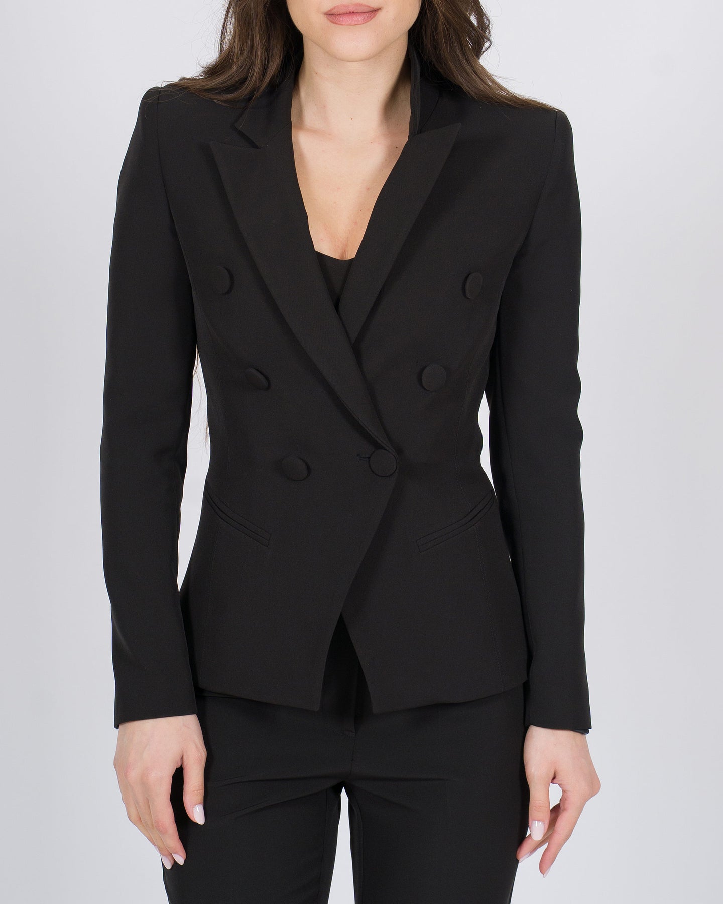 Sartoriale e contemporaneo, il Blazer doppiopetto con revers a lancia unisce eleganza classica e stile moderno. Il taglio doppiopetto valorizza la silhouette con linee strutturate e raffinate, mentre i revers a lancia aggiungono un dettaglio distintivo e sofisticato, perfetto per look di grande classe.Realizzato in tessuto di alta qualità, garantisce vestibilità impeccabile e comfort, rendendolo ideale per outfit business-chic, eventi serali o ensemble eleganti. Perfetto da abbinare a pantaloni coordinati, gonne sartoriali o jeans premium per un ensemble femminile, contemporaneo e luxury.
