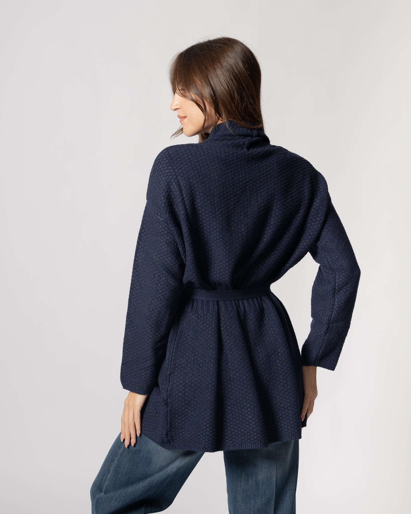 Cardigan in maglia tessuto lana e viscosa con collo sciallato e cintura.