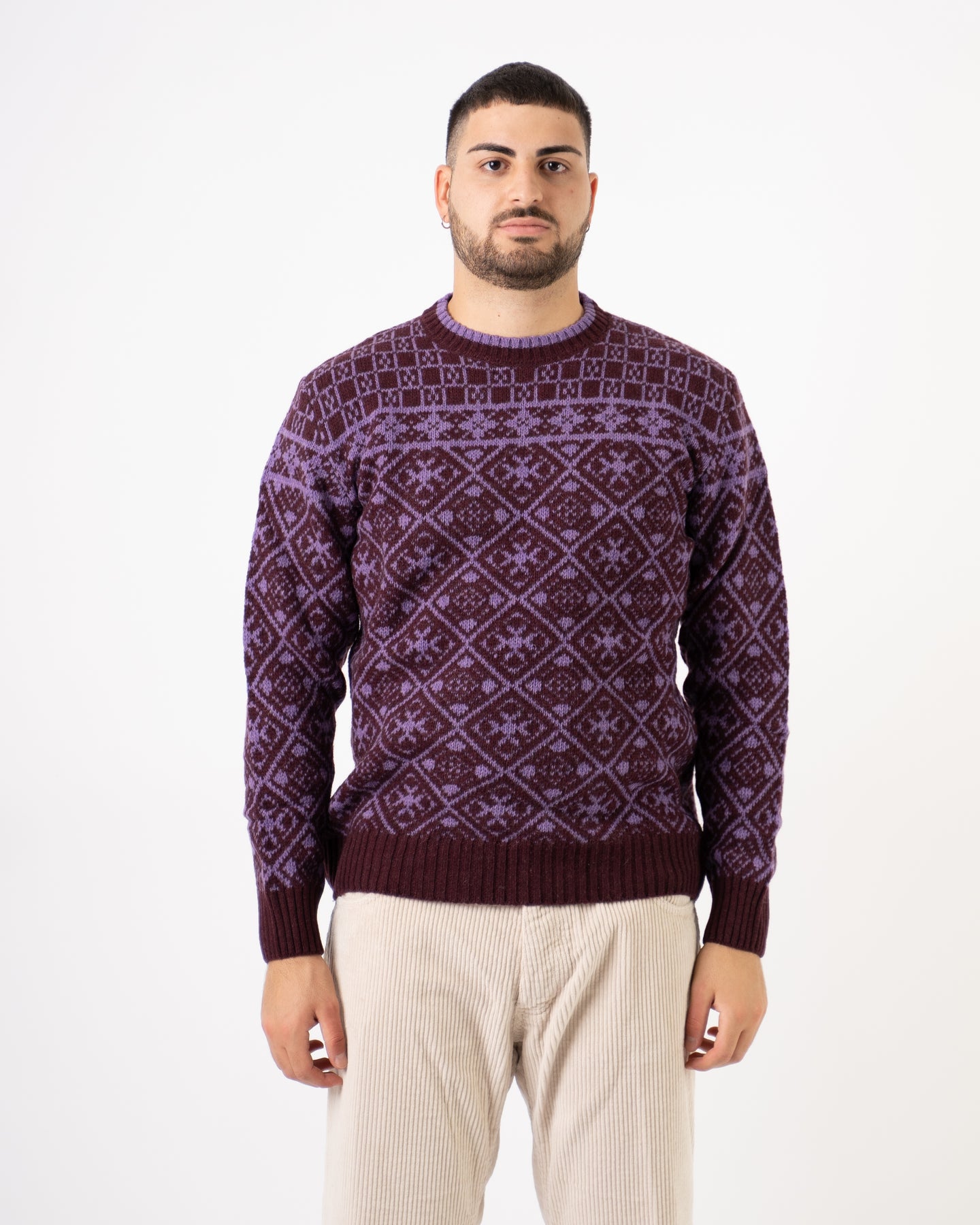 Girocollo in lana lavorazione jacquard colore viola.