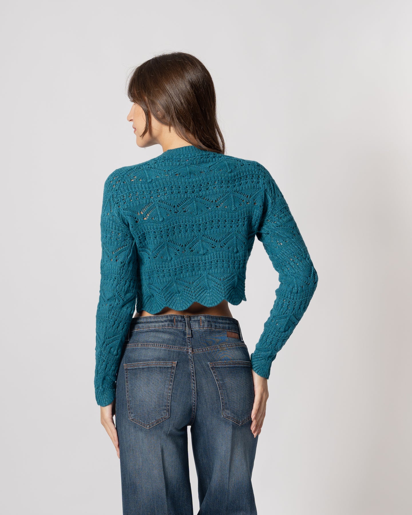 Maglia corta traforata in tessuto viscosa colore ottanio.