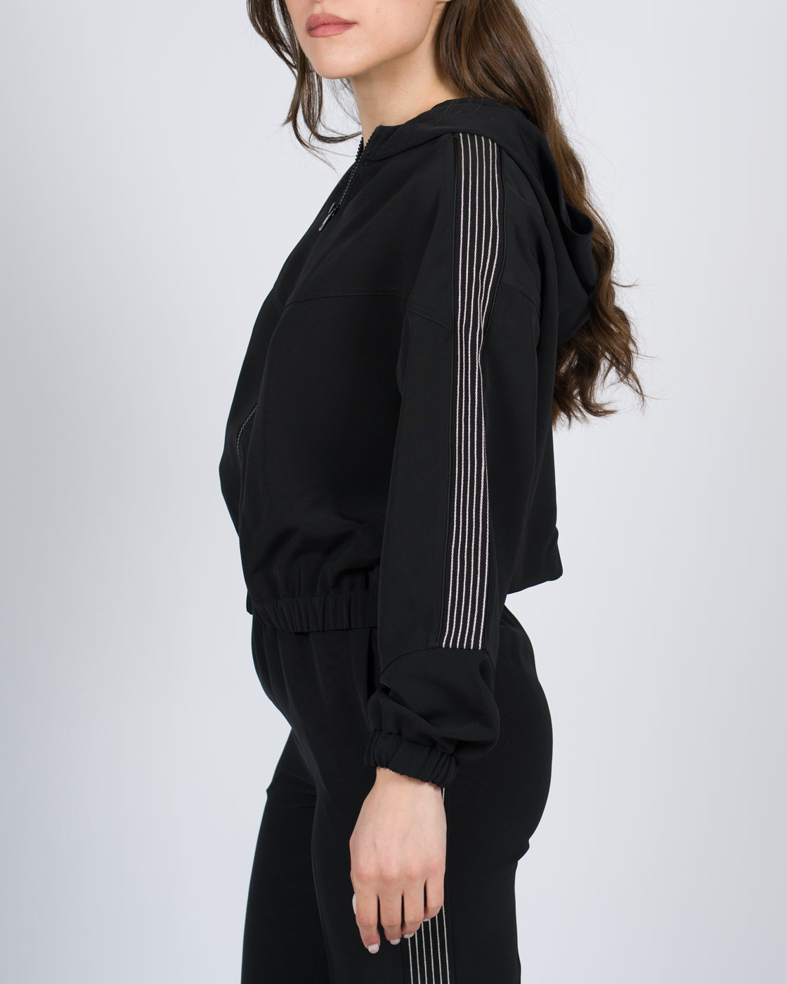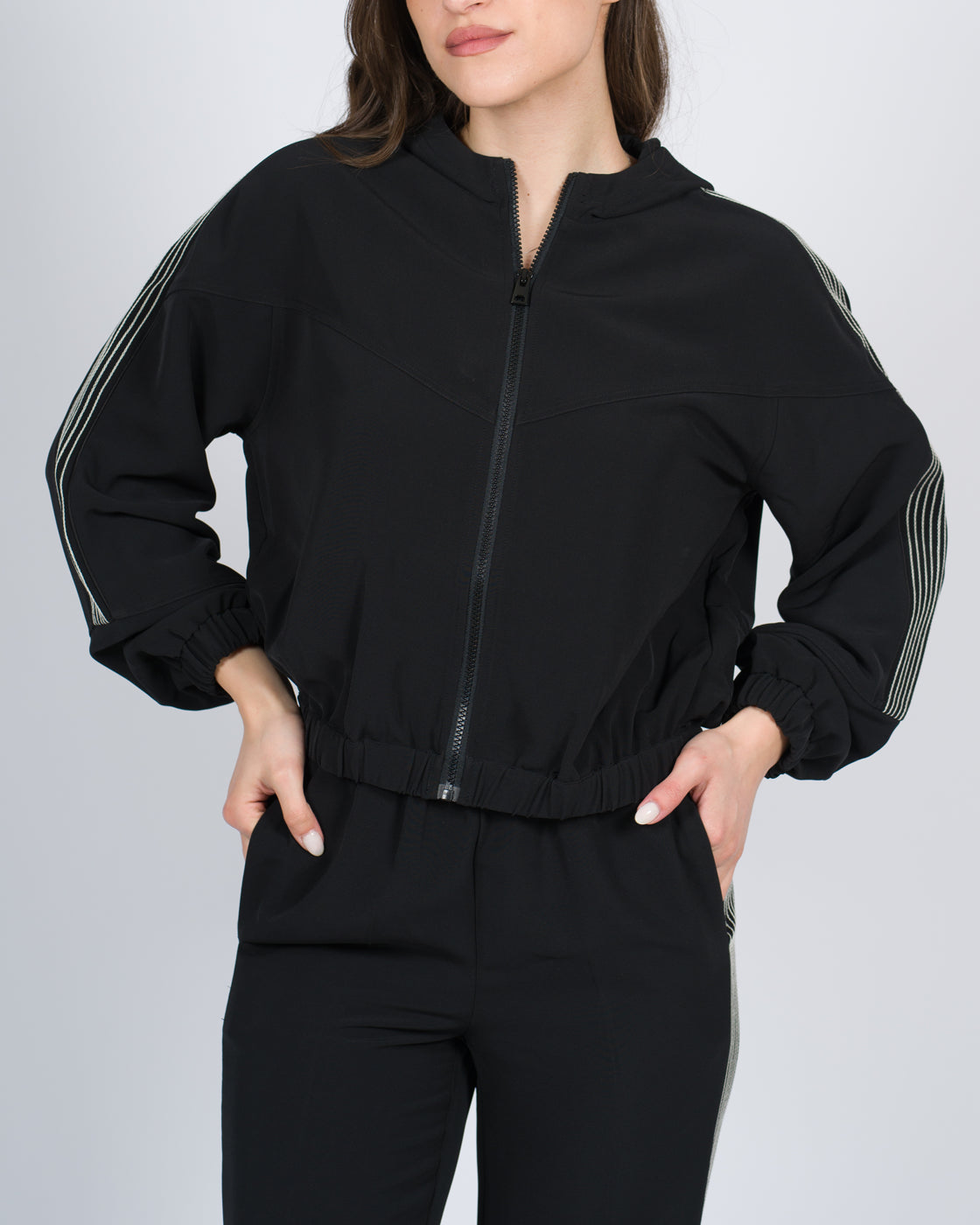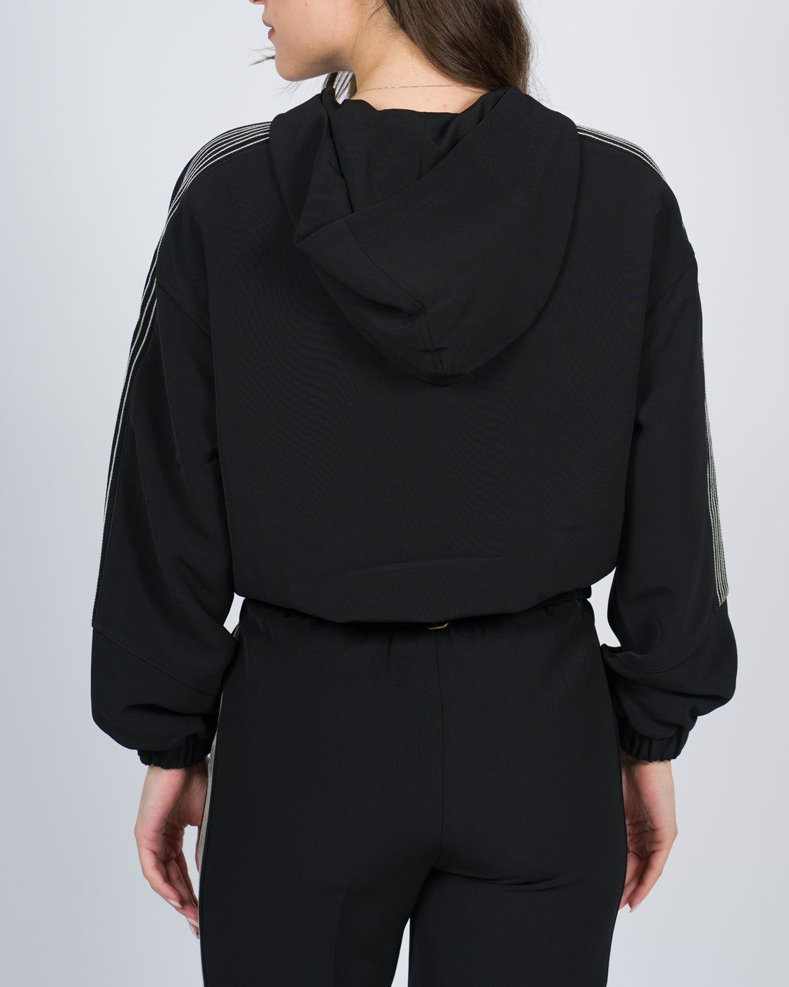 Giacca in crêpe stretch leggero con il 93% di poliestere riciclato post-consumer e impunture con ricamo in punto catenella. Ha collo con cappuccio, maniche lunghe blusante, polsi con elastico inserito nascosto, tasche ai fianchi, logo sul cappuccio, fodera, linea morbida. Questo articolo fa parte della selezione 'Archive', ispirata dai capi più iconici e amati delle collezioni Twinset.