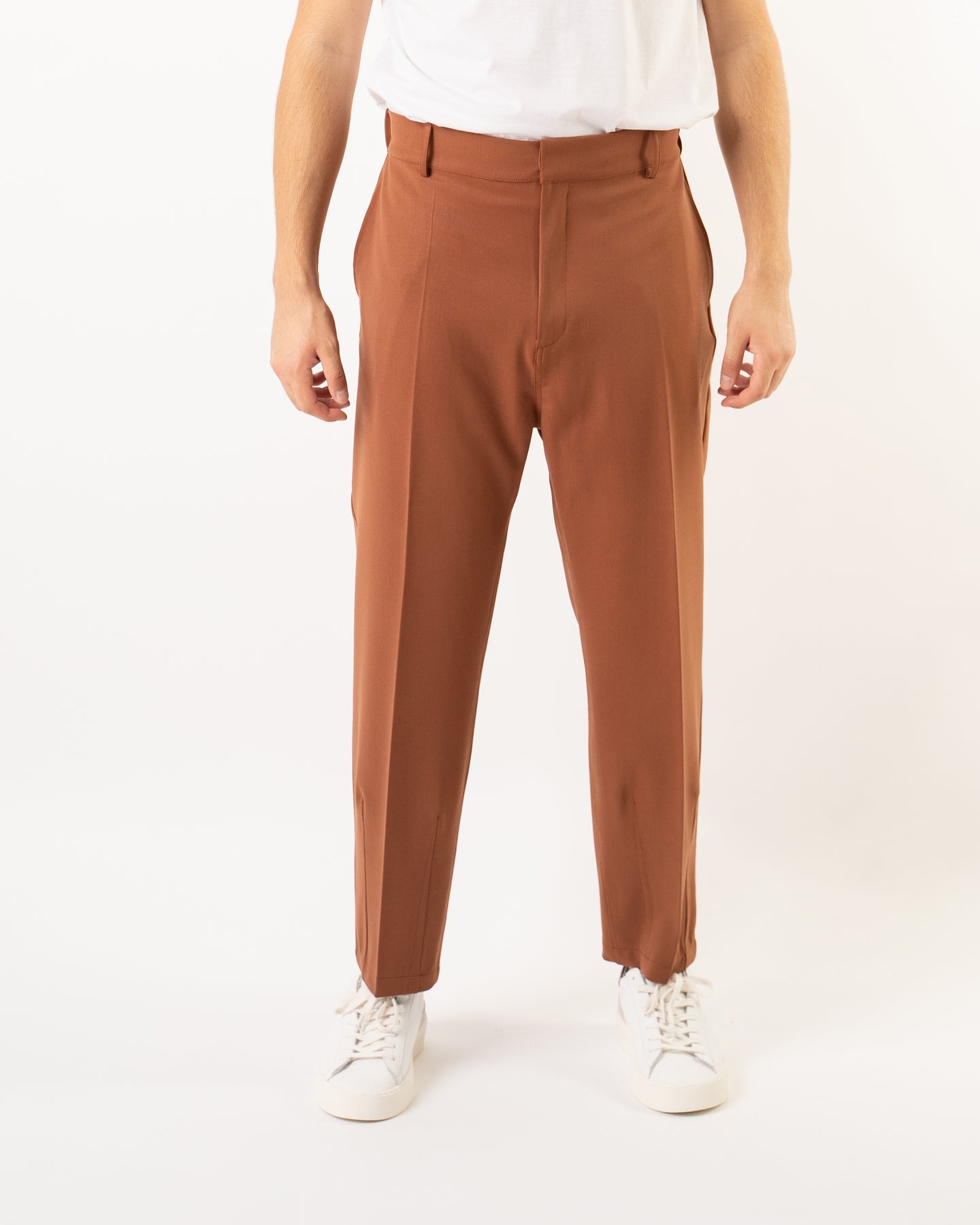Pantlone in tessuto lana vergine vita alta colore tegola, vestibilità carrot.