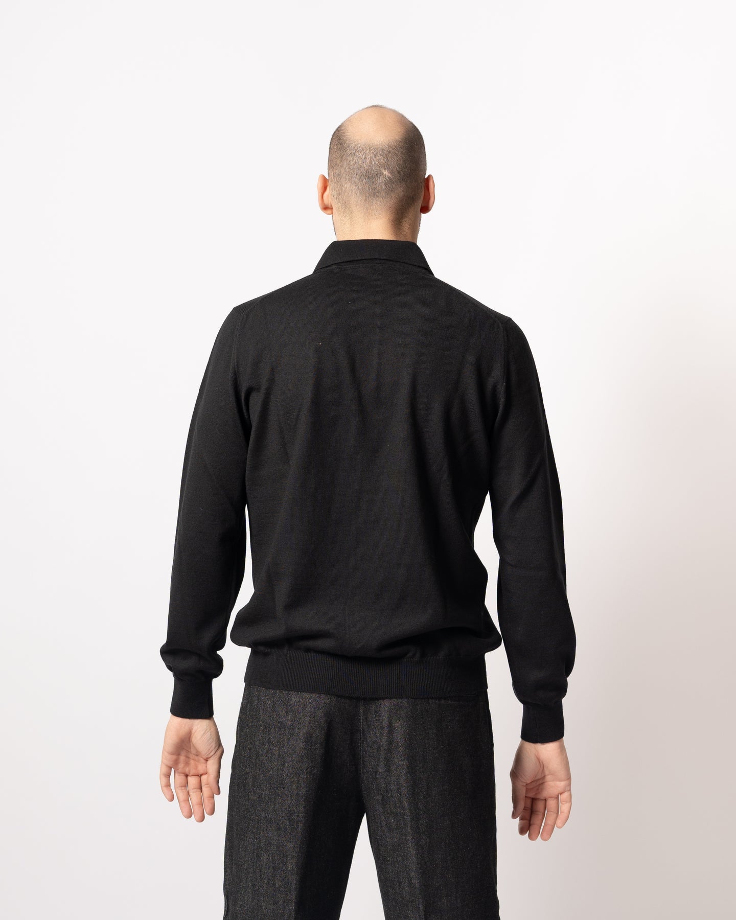 Polo manica lunga tre bottoni in tessuto lana vergine.Il modello indossa la taglia 50