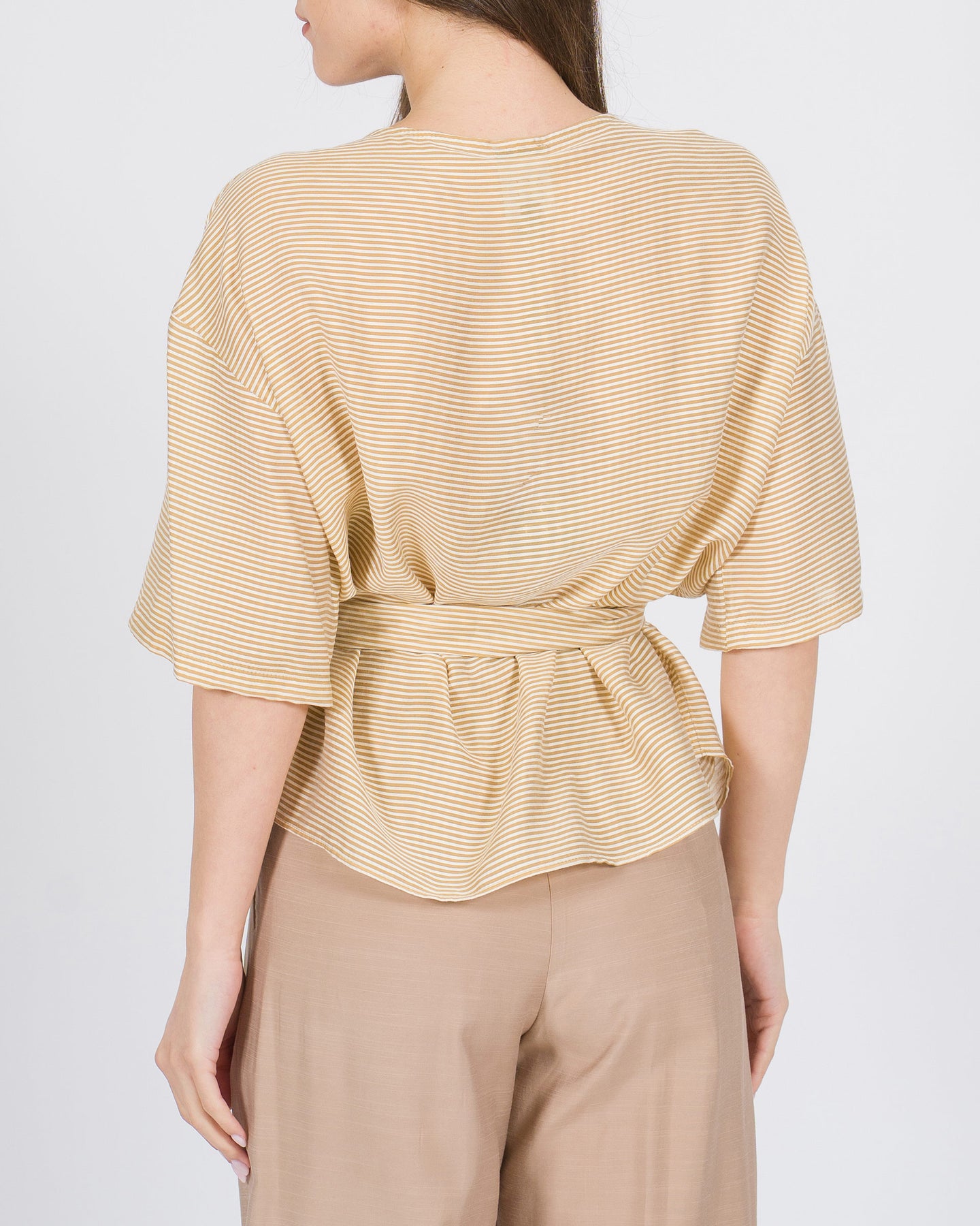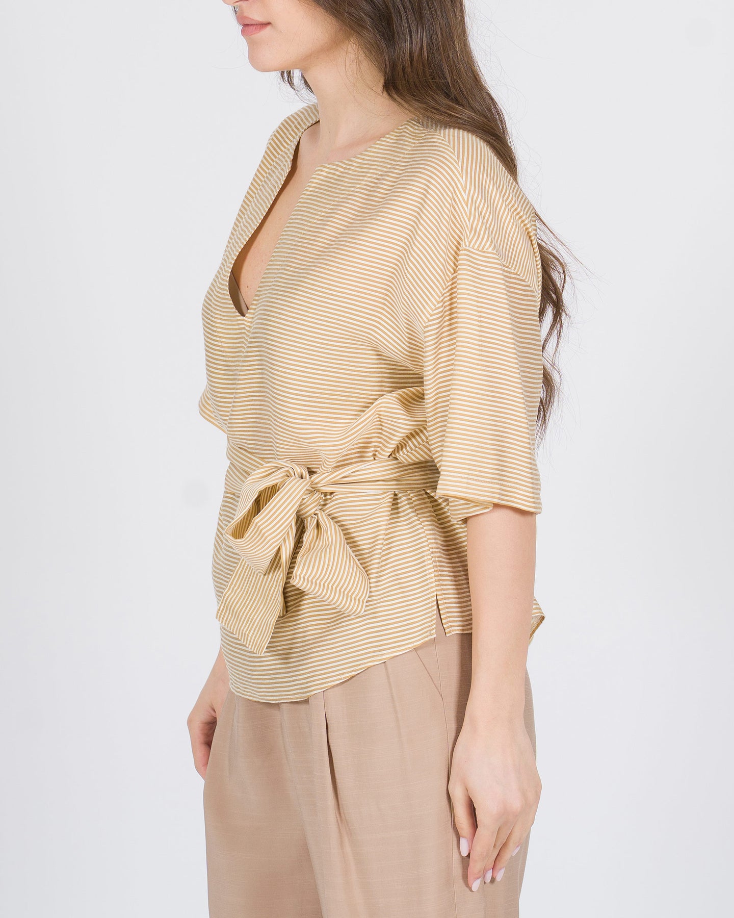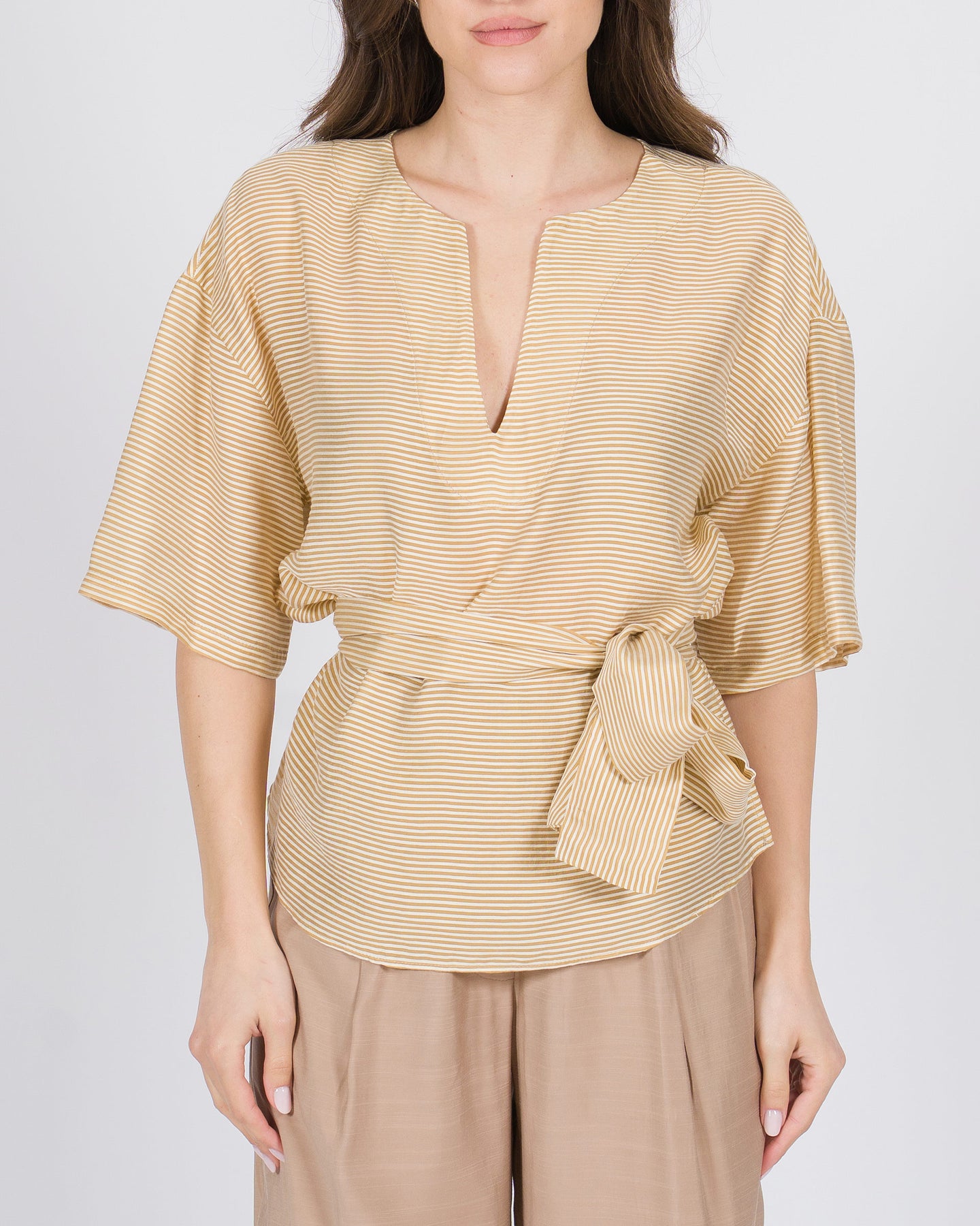 Rinnova il tuo guardaroba con la nostra striped belted blouse, un capo raffinato che unisce stile classico e contemporaneo. Realizzata in tessuto leggero e fluido di qualità premium, questa blouse offre una vestibilità elegante e confortevole, ideale per chi cerca outfit sofisticati senza rinunciare al comfort.Le sottili righe beige conferiscono un effetto raffinato e allungano visivamente la figura, mentre la cintura integrata definisce la vita e aggiunge un tocco strutturato e femminile. Perfetta sia indossata su pantaloni sartoriali che su gonne a matita, questa blouse versatile si presta a look da ufficio chic, brunch eleganti o serate raffinate.Dettagli curati come le cuciture precise, i bottoni nascosti e le maniche leggermente morbide trasformano un capo quotidiano in un vero must-have di lusso, capace di valorizzare ogni outfit con discrezione e stile.