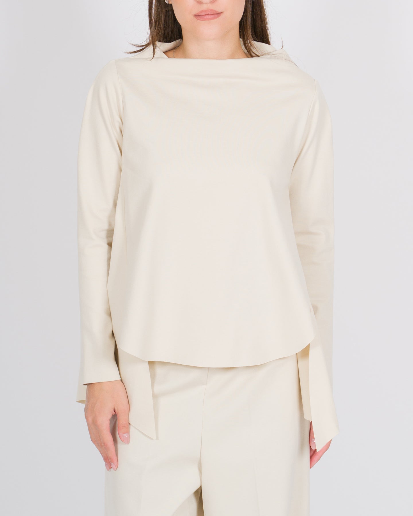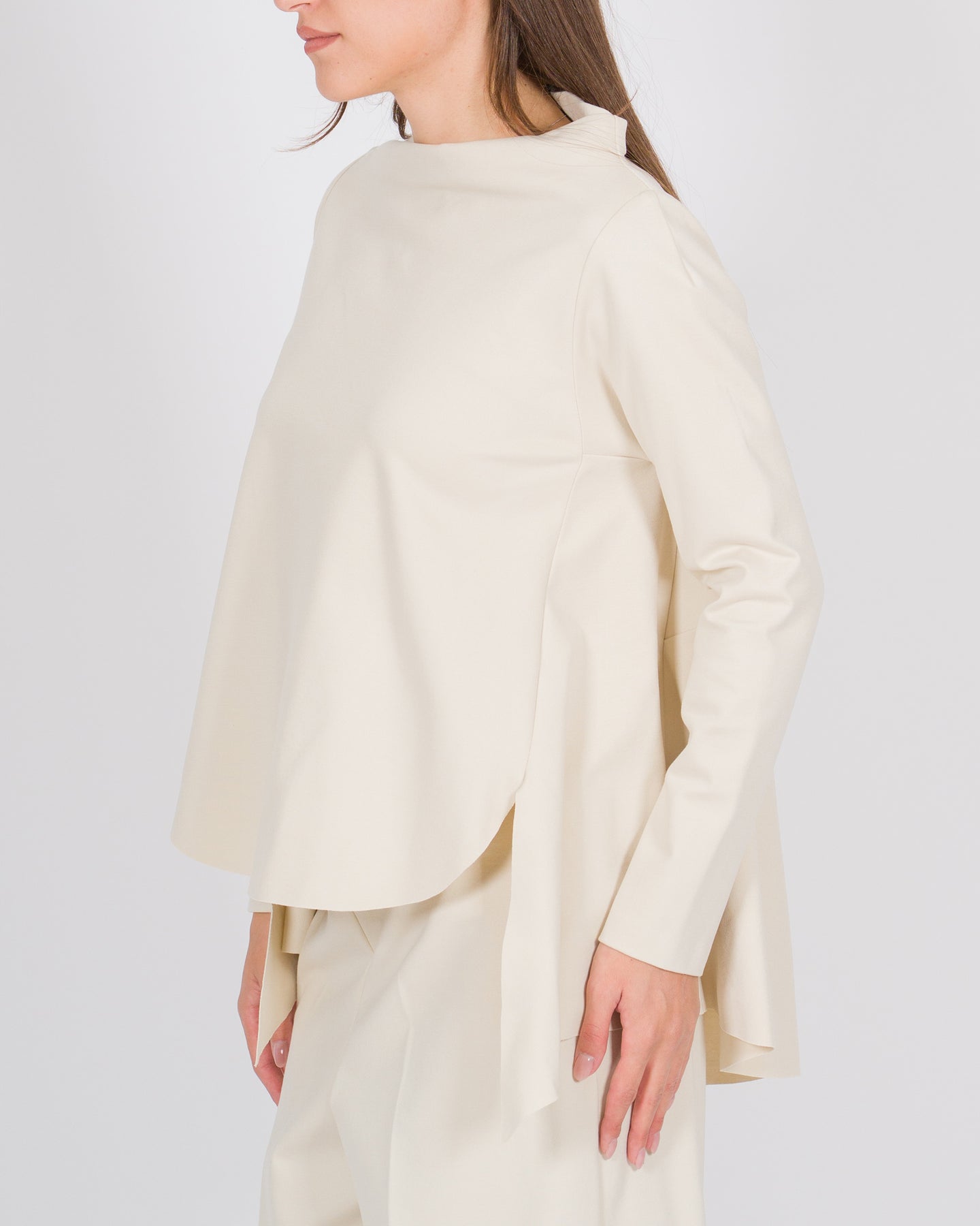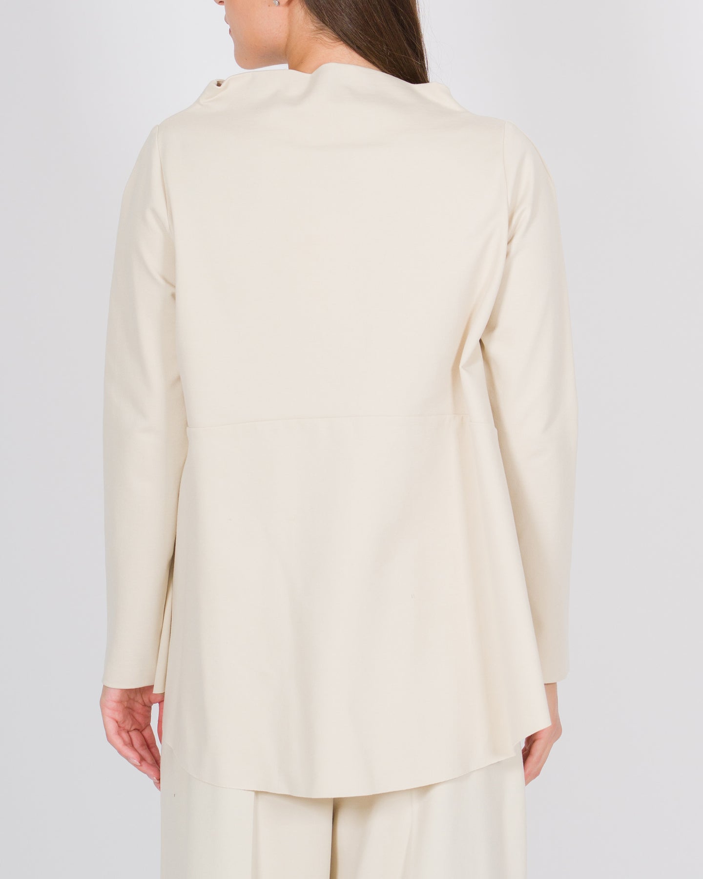 Un capo dal carattere contemporaneo, questa blusa in jersey bordeaux firma Meimej reinterpreta la femminilità con dettagli architettonici e linee fluide. Le maniche lunghe e il tessuto morbido assicurano comfort e vestibilità perfetta, mentre le balze posteriori introducono movimento e leggerezza, creando un gioco di volumi sofisticato.Il collo cratere con tondo sul davanti aggiunge un tocco distintivo e geometrico, trasformando la blusa in un capo di design, elegante ma con un'attitudine moderna. Perfetta da abbinare a pantaloni strutturati o gonne fluide, rappresenta un equilibrio armonioso tra minimalismo e dettagli scultorei.