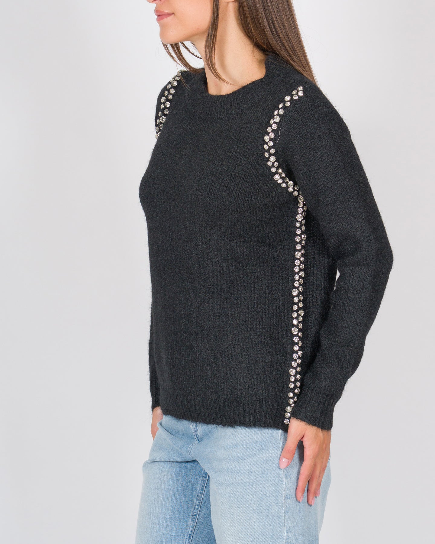 Un capo elegante e sofisticato che arricchisce la maglieria classica con dettagli preziosi. Realizzata in morbida lana, questa maglia a maniche lunghe presenta un girocollo con lavorazione doppia che assicura struttura e comfort. Le applicazioni cabochon sul davanti aggiungono un tocco luminoso e raffinato, trasformando il modello in un pezzo distintivo, perfetto sia per look da giorno chic sia per outfit da sera.Dettagli:Tessuto: lanaColore: biancoGirocollo con collo doppioManiche lungheApplicazioni cabochon sul davantiFondo e polsini rifiniti a costineVestibilità regolare