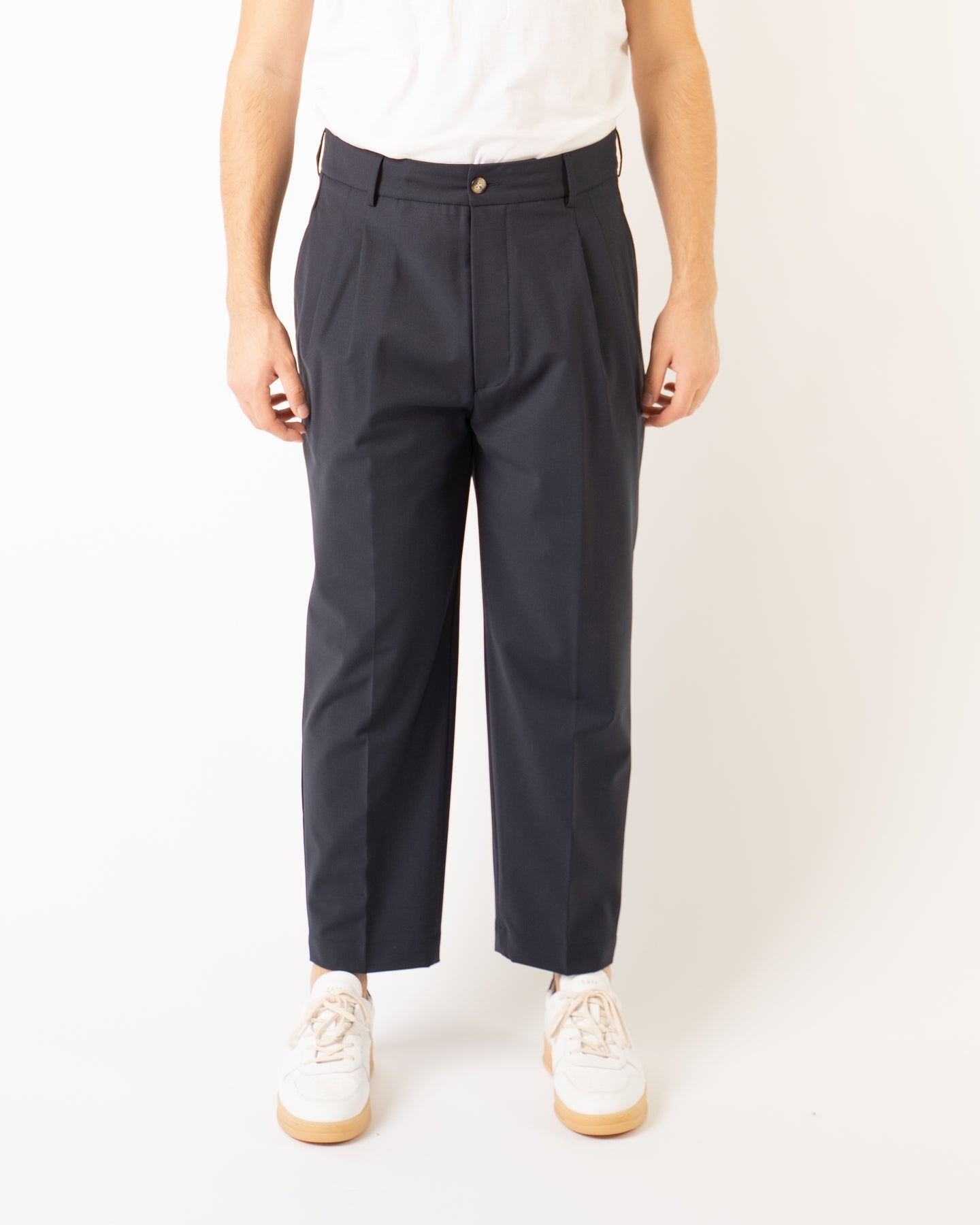Pantalone vestibilità japan in tessuto lana vergine elasticizzata, con doppia pence, chiusura bottoni.Pantalone per look over da completare con sneaker basse o running.