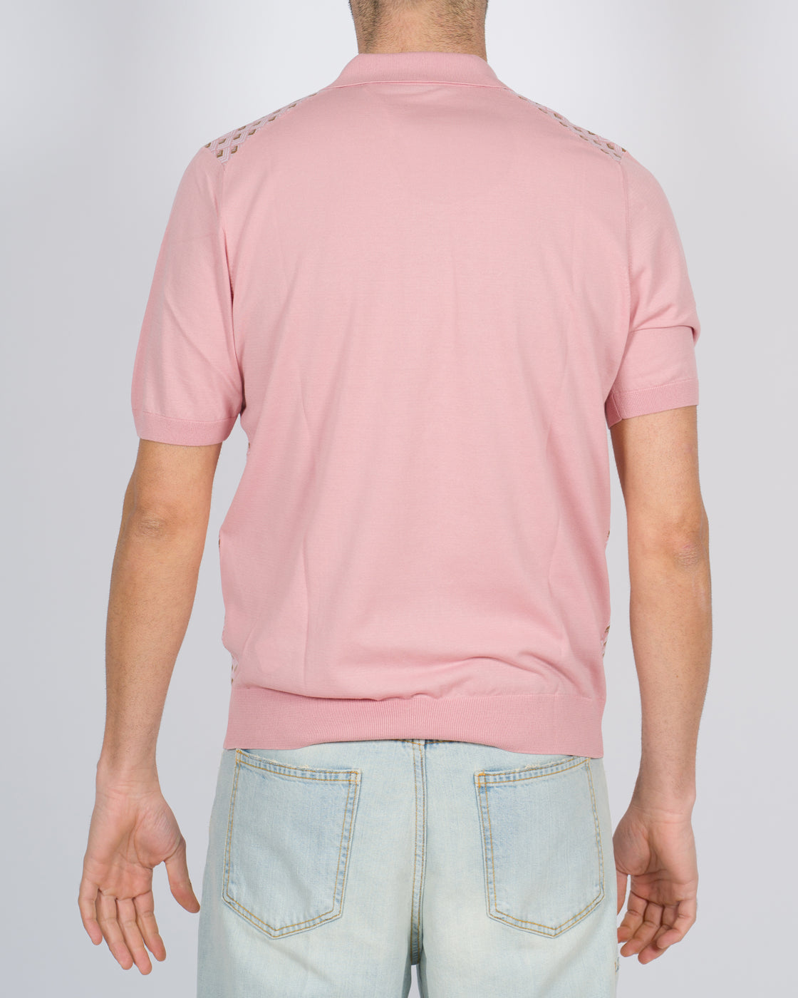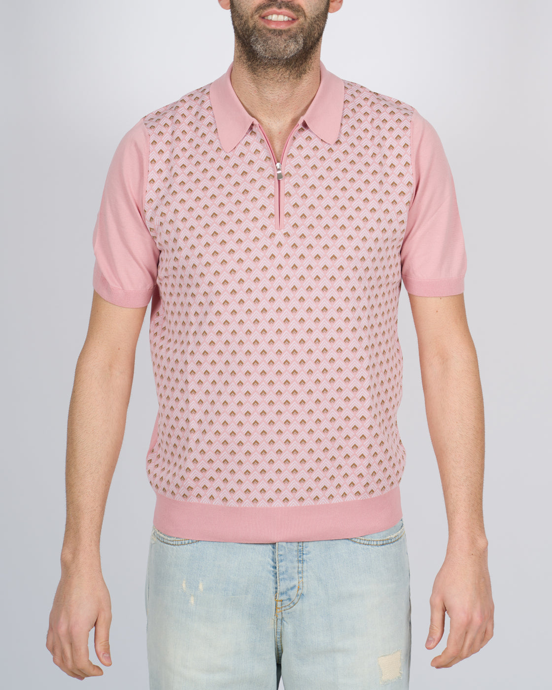 Polo mezza manica con chiusura mezza zip in tessuto cotone con lavorazione a contrasto marrone.Il modello è alto 1,90 e indossa la taglia 52.