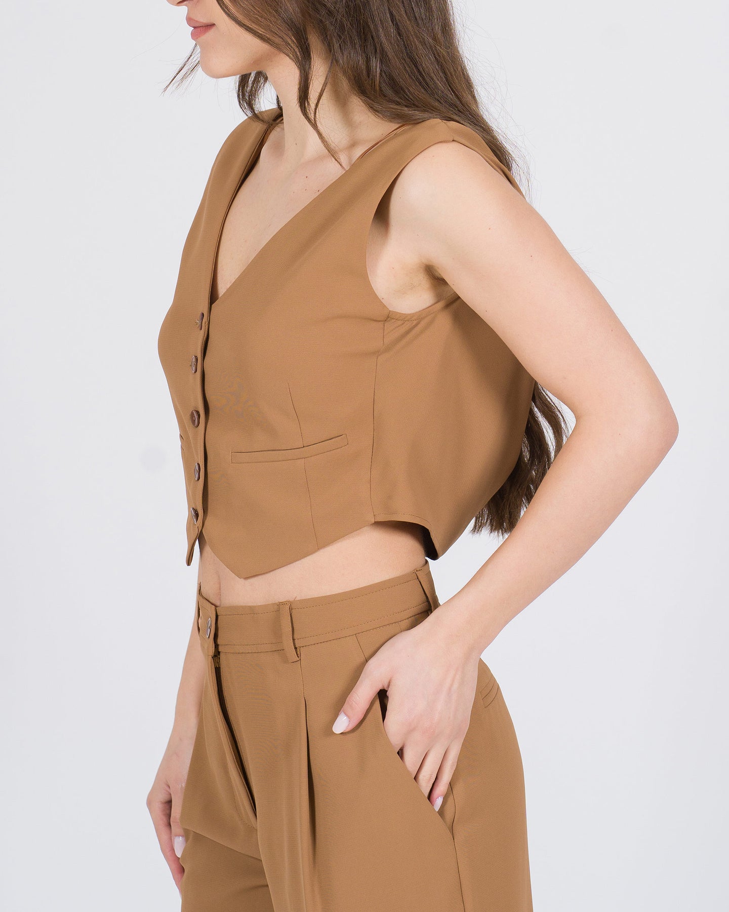 Eleva il tuo guardaroba con il nostro cropped vest top, un capo essenziale dal fascino minimalista e dalla linea sofisticata. Realizzato in tessuto premium, morbido al tatto e leggermente elasticizzato, questo top garantisce una vestibilità perfetta e comfort assoluto per tutto il giorno.La silhouette corta e sagomata valorizza la figura con eleganza discreta, rendendolo ideale da abbinare a jeans a vita alta, pantaloni sartoriali o gonne midi per un look contemporaneo e raffinato. La tonalità choco aggiunge un tocco di calore e versatilità, perfetta per outfit autunnali, invernali o per layering primaverile.Dettagli curati come le finiture pulite e le cuciture precise trasformano un semplice top in un vero must-have luxury, capace di diventare il pezzo chiave di ogni guardaroba moderno.