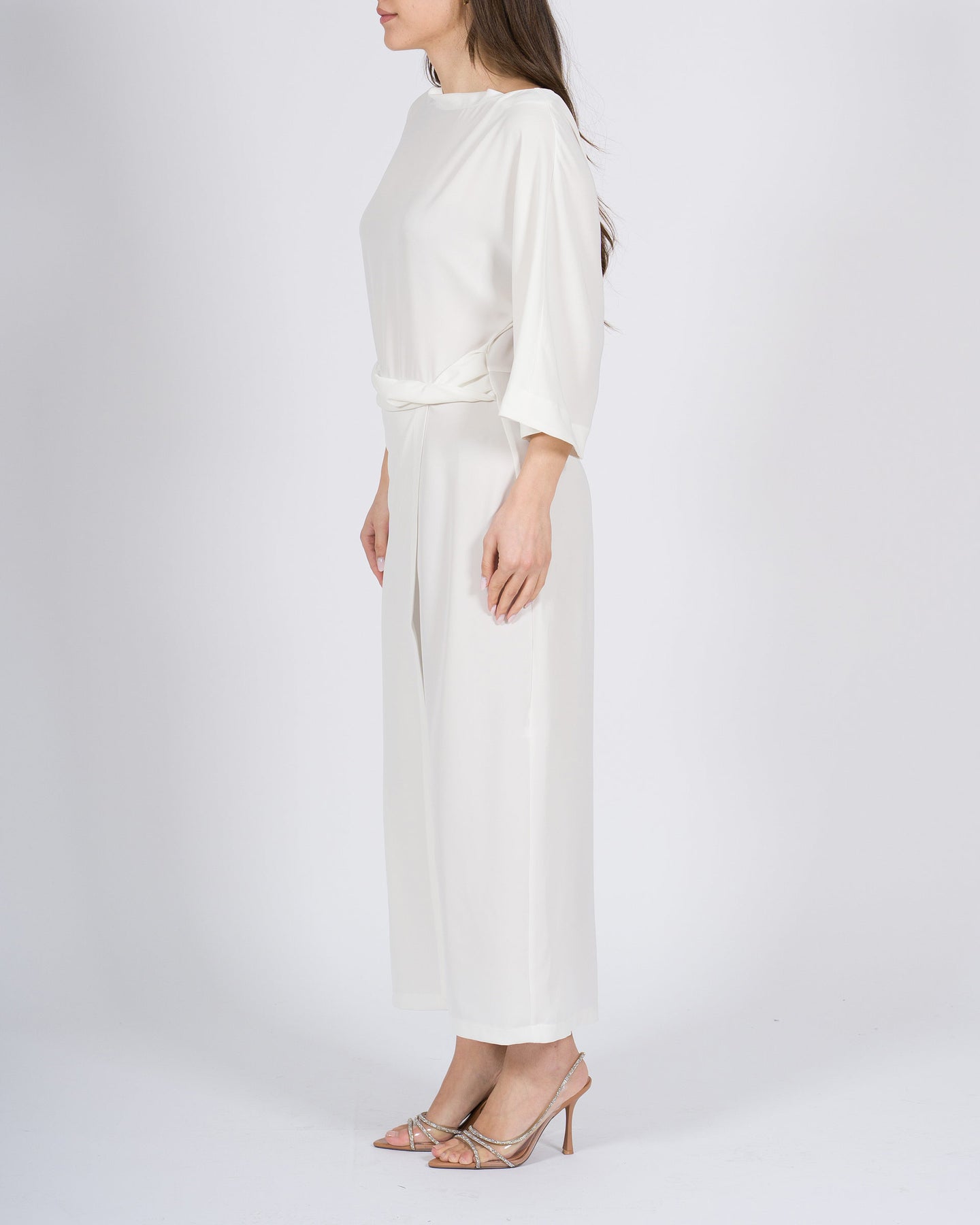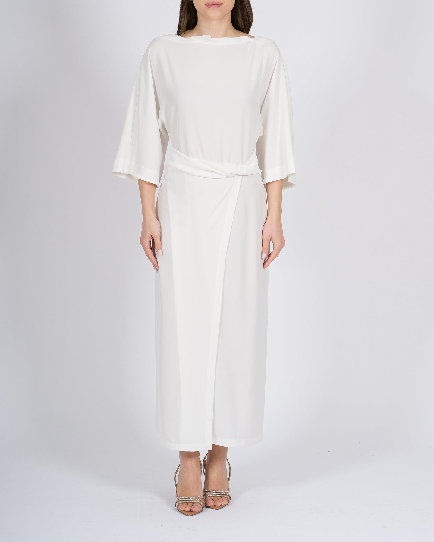 Fluidità elegante, silhouette femminile, stile contemporaneo.L'abito longuette MEIMEJ in georgette con drappeggio in vita valorizza la figura con morbidezza, combinando linee raffinate a dettagli sofisticati per un look minimal e ricercato.Un capo versatile, perfetto per occasioni eleganti o outfit dal carattere sofisticato.