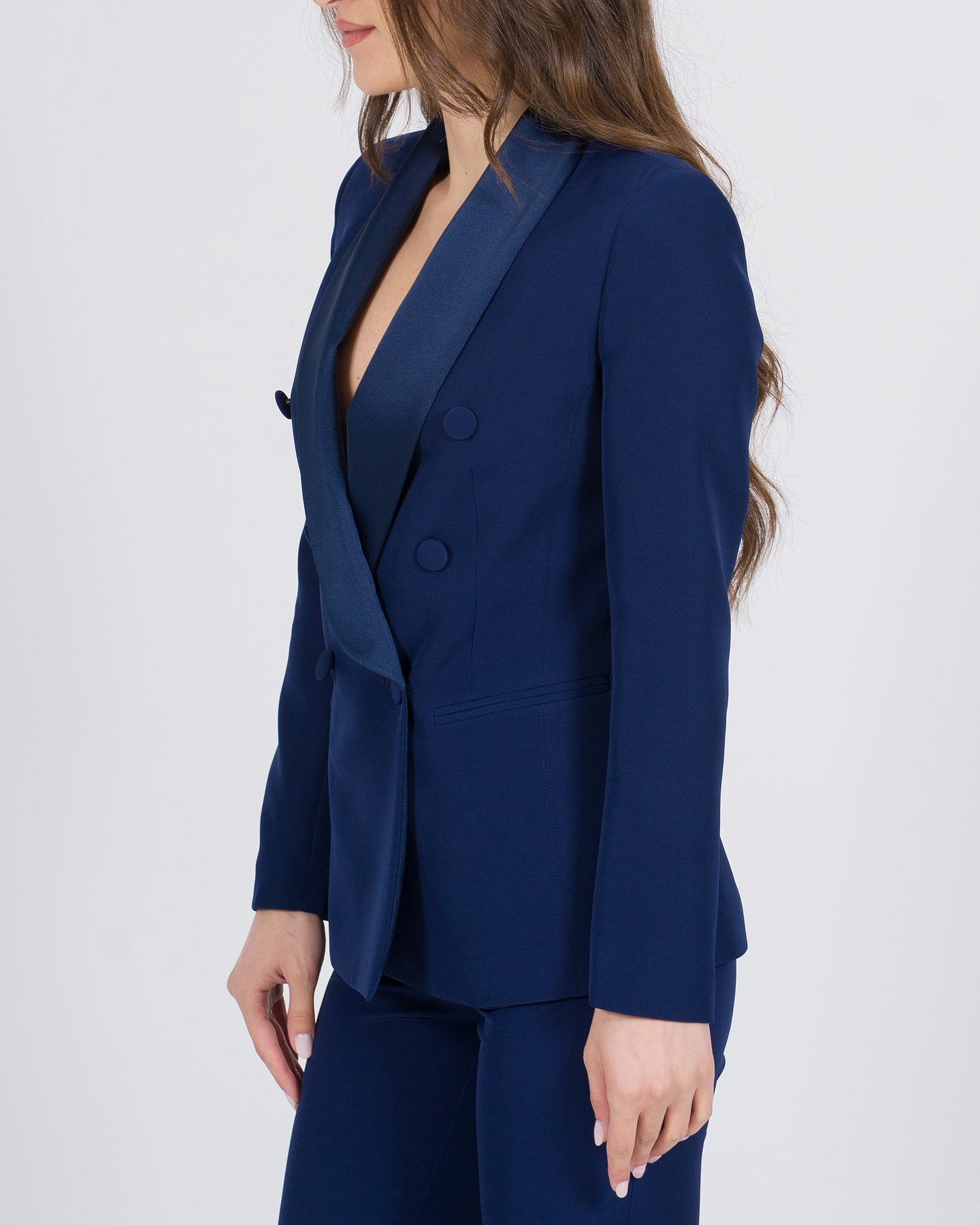 Sofisticato e luminoso, il Blazer blu doppiopetto in raso con collo a scialle unisce eleganza sartoriale e charme contemporaneo. Il taglio doppiopetto valorizza la silhouette con linee strutturate e raffinate, mentre il collo a scialle in raso dona un dettaglio fluido e prezioso, perfetto per look di grande classe.La lucentezza del raso e la tonalità blu intensa conferiscono versatilità e carattere, rendendo il blazer ideale per outfit da cocktail, eventi serali o ensemble eleganti. Realizzato con tessuto di alta qualità, garantisce vestibilità impeccabile, comfort e un allure luxury senza tempo.Perfetto da abbinare a pantaloni sartoriali coordinati, gonne eleganti o outfit monocromatici per un look femminile, raffinato e contemporaneo.