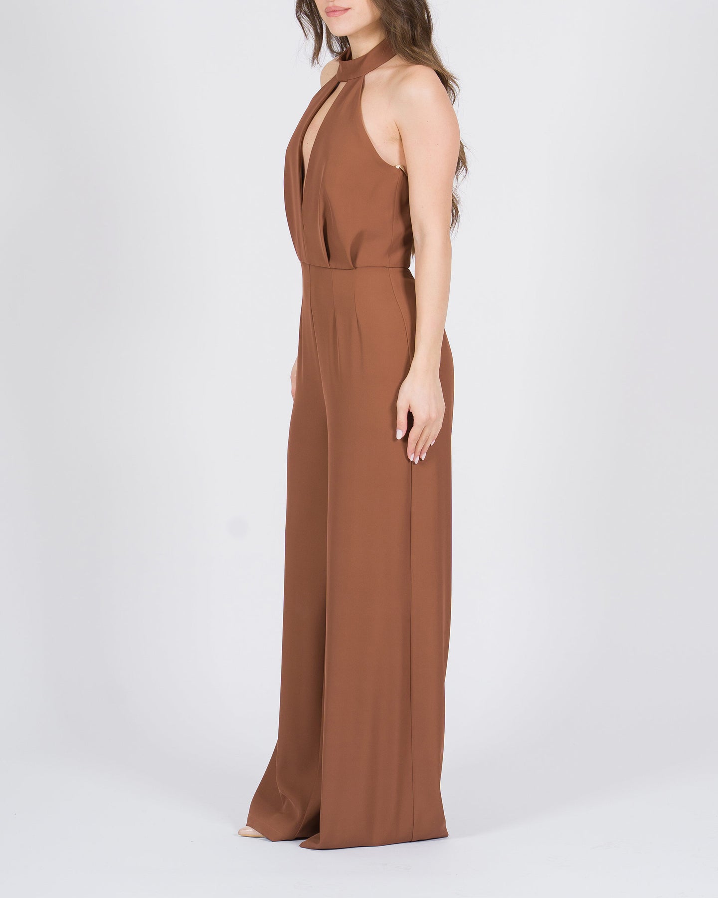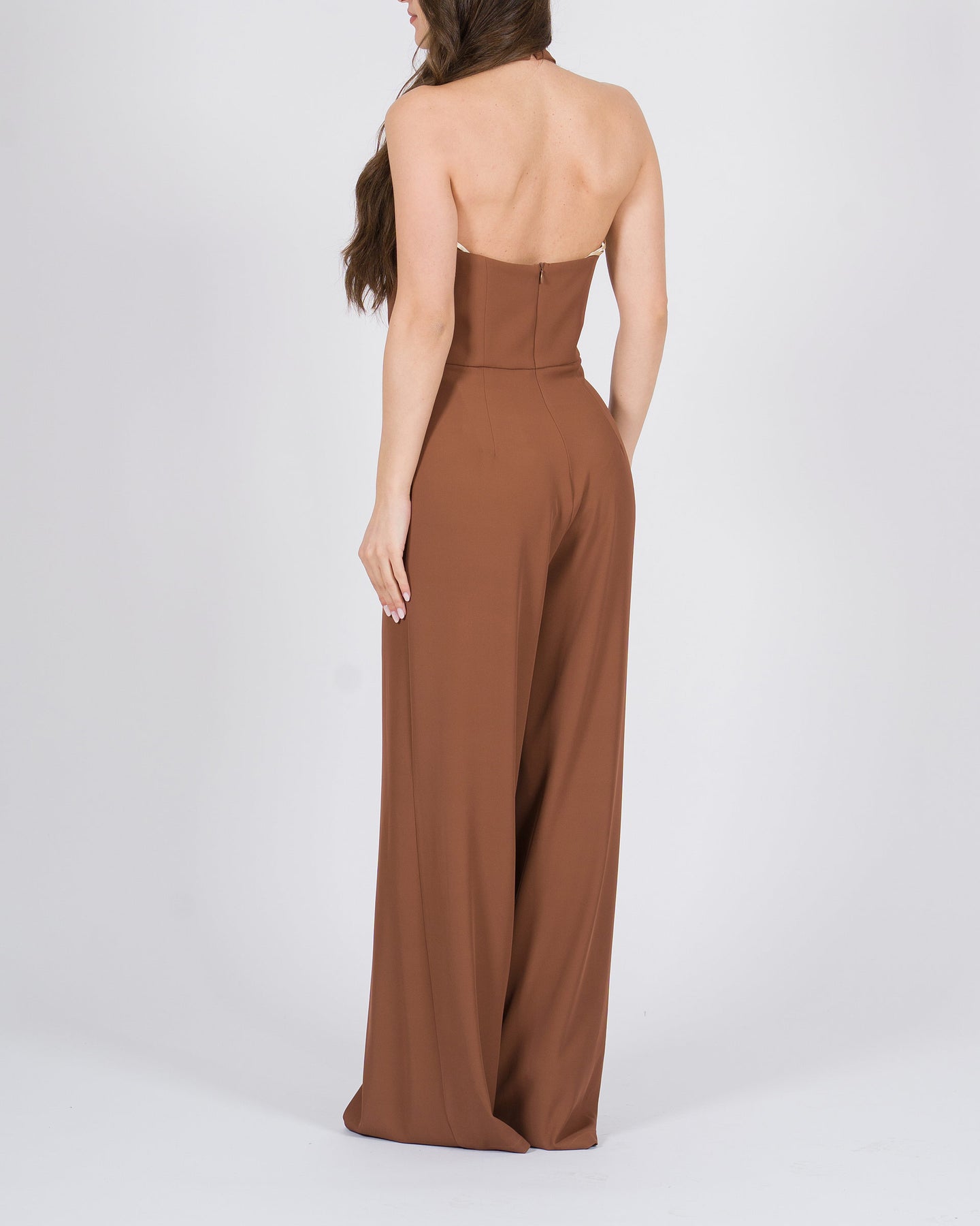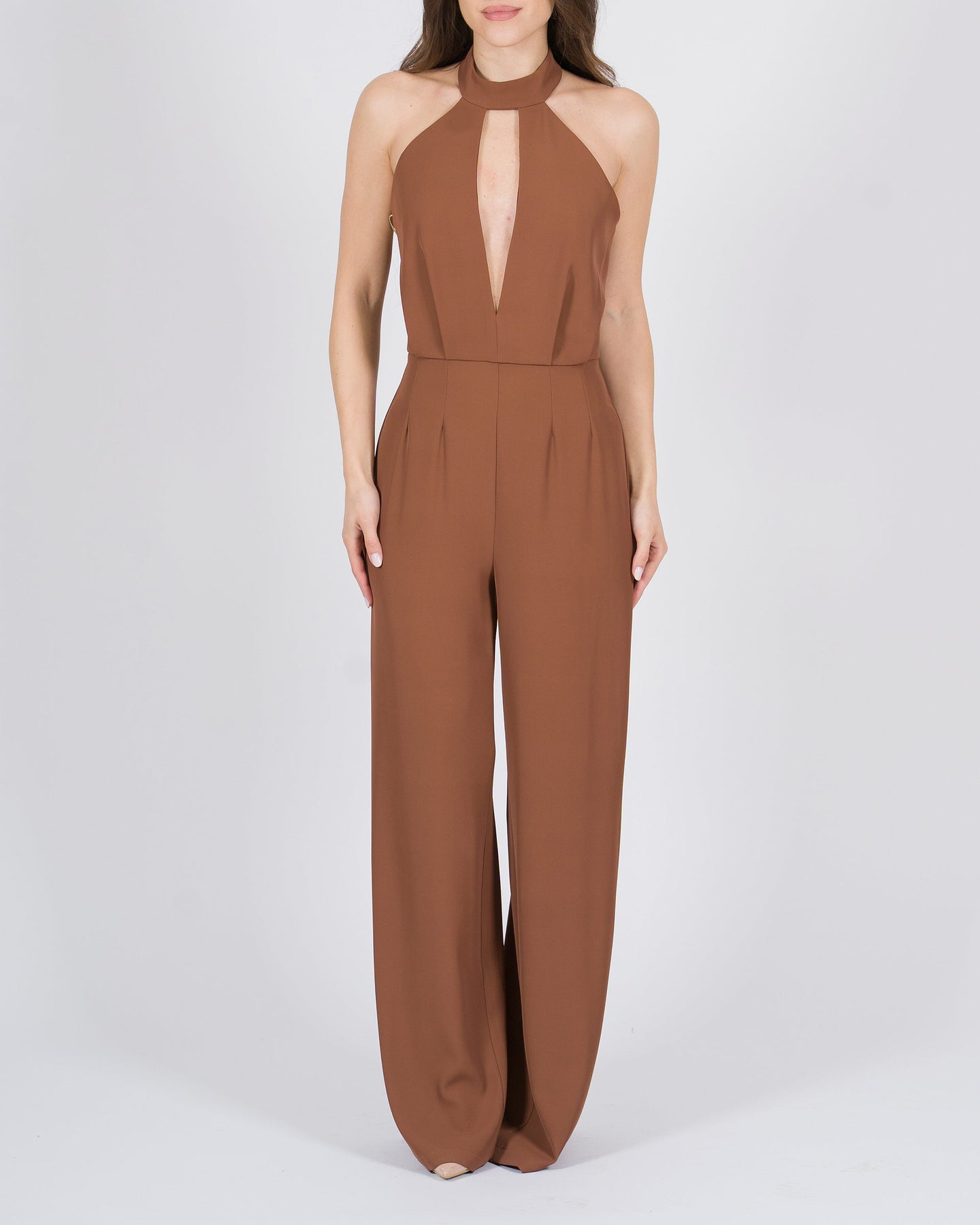Glamour e sofisticata, la Tuta elegante tegola con apertura sul seno, attaccatura al collo, pence al ventre e pantalone palazzo è un capo di grande impatto, perfetto per occasioni esclusive. L'apertura sul seno valorizza con femminilità e allure seducente, mentre l'attaccatura al collo crea una linea elegante e armoniosa.Le pence al ventre definiscono delicatamente la silhouette, conferendo struttura e vestibilità impeccabile, mentre il pantalone palazzo scivola fluido sulle gambe, aggiungendo movimento e un tocco di glamour senza tempo.La tonalità tegola calda e sofisticata conferisce carattere e versatilità, rendendo la tuta ideale per cocktail, eventi serali o red carpet. Realizzata in tessuto di alta qualità, combina comfort e lusso contemporaneo.Perfetta da completare con sandali gioiello e accessori minimal per un outfit femminile, elegante e di grande impatto.
