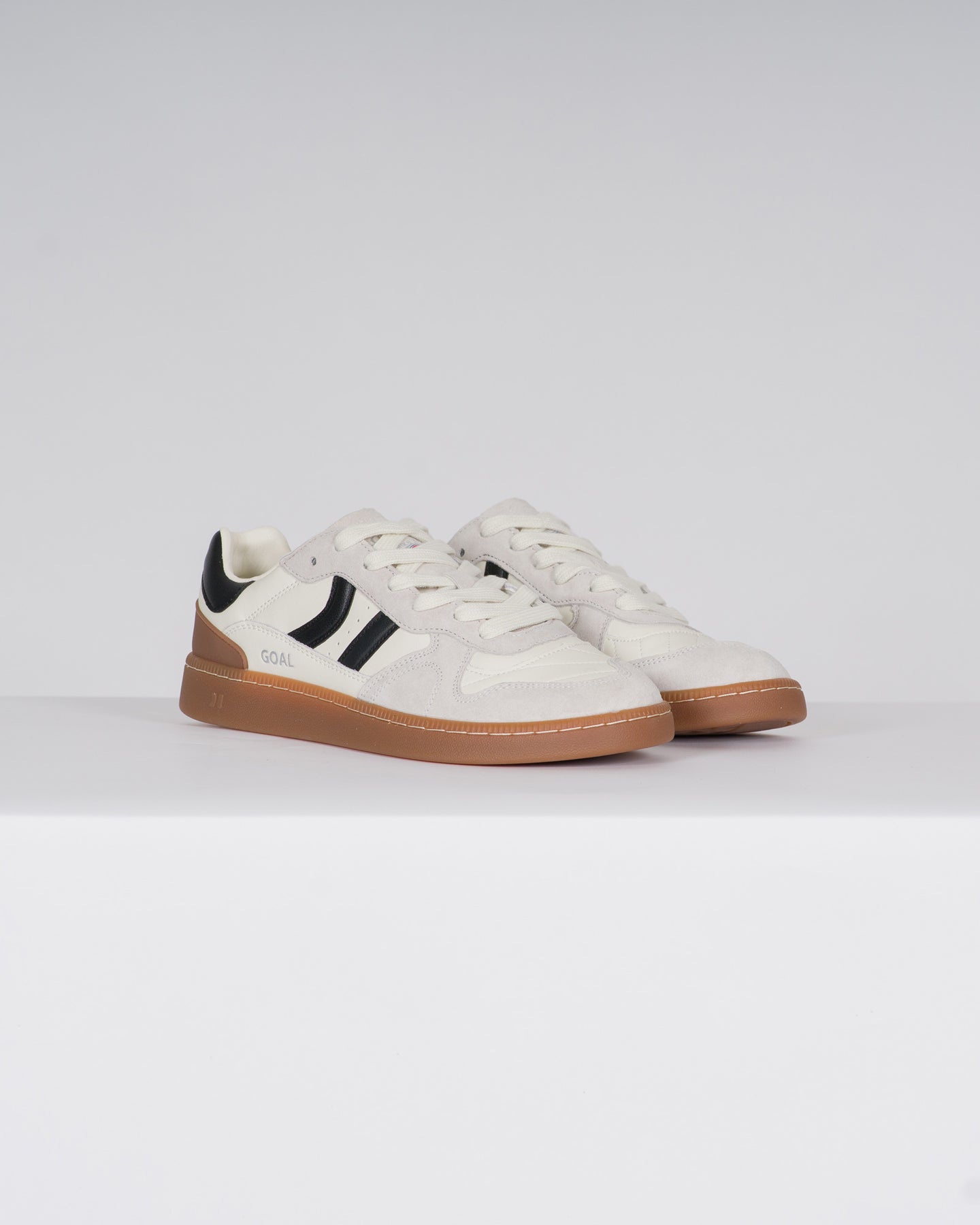 Scarpa sportiva in pelle scamosciata con dettagli a contrasto. Linguetta in pelle preformata con imbottitura sagomata. Vista della fodera in pelle. Lacci piatti intercambiabili in cotone bicolore. Colletto leggermente imbottito. La parte anteriore presenta un rinforzo con cuciture. Suola flessibile in gomma/gomma che garantisce resistenza e aderenza. Presenta il nome del modello "GOAL" sul lato in oro antico.