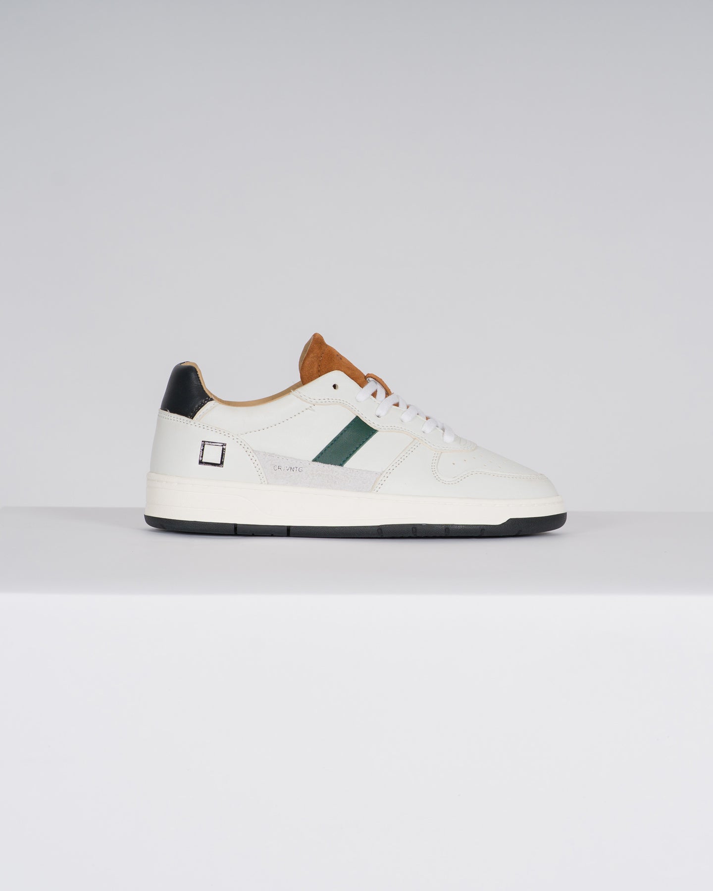Sneakers bassa in pelle colore bianco.DETTAGLI:-La punta è traforata per una maggiore traspirazione.-Sulla linguetta è impressa la scritta D.A.T.E..-I lacci sono in cotone.-Il codice e il logo quadrato sono impressi lateralmente.-La banda laterale è in pelle colore verde.-Il talloncino è in pelle colore nero effetto used.-Fodera in pelle e spugna di cotone.-Il soletto interno è rialzato di 2.5 cm per un migliore comfort.-La suola in gomma, alta 2.5 - 3 cm, è cucita.-La maggior parte del pellame utilizzato è Logic -Fondo Crust, una pelle che, con l'usura, sviluppa un effetto vissuto, rivelando il colore neutro sottostante, tendente al beige.-Tutti i materiali selezionati sono Made in Italy.