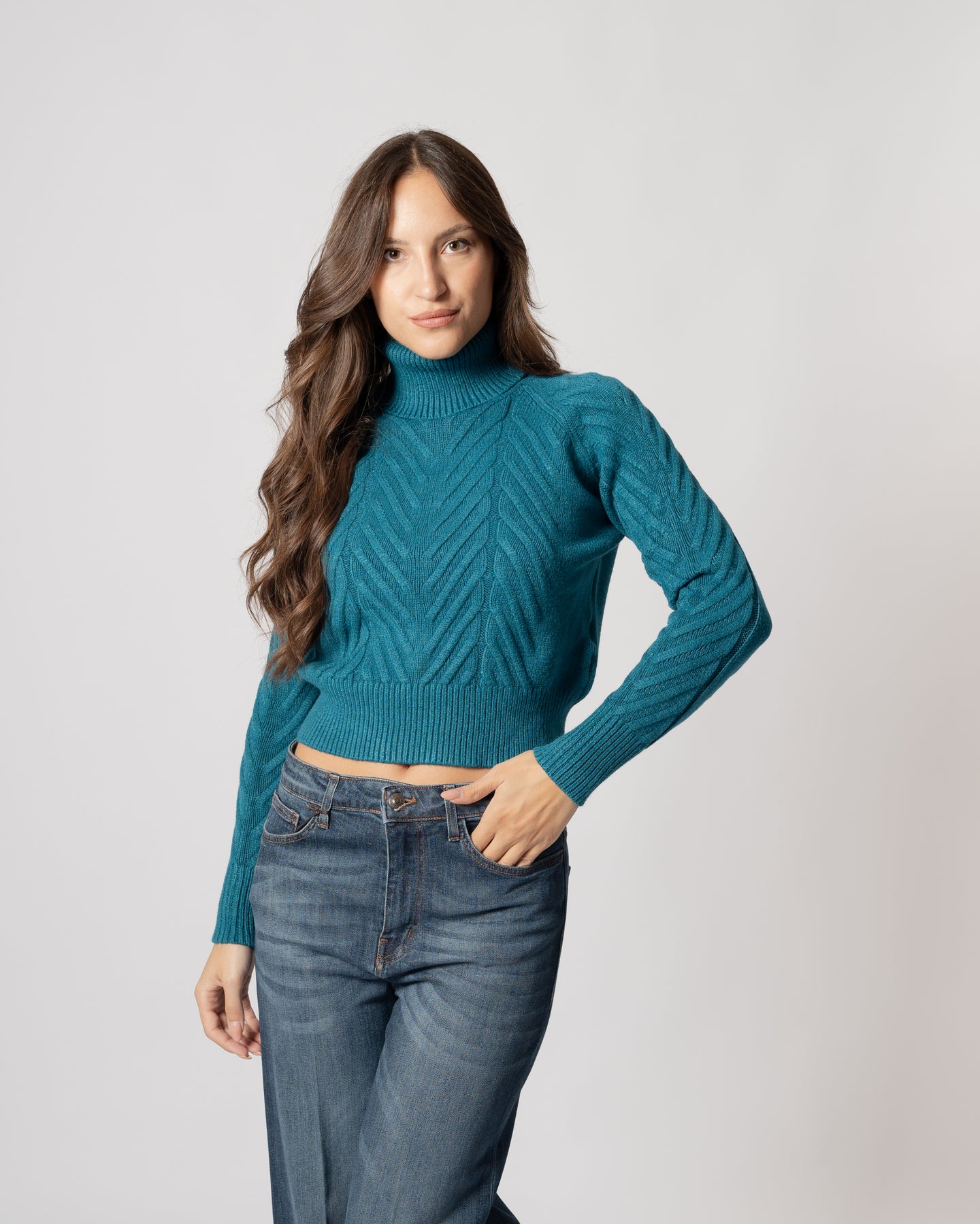 Maglia collo alto manica lunga in tessuto lana e viscosa con lavorazione spigata e lunghezza alla pancia.