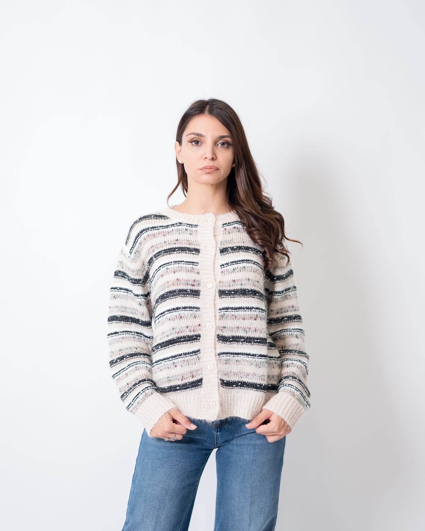 Giacca maglia con intarsi lavorazione rigata con contrasto colori e chiusura bottoni.