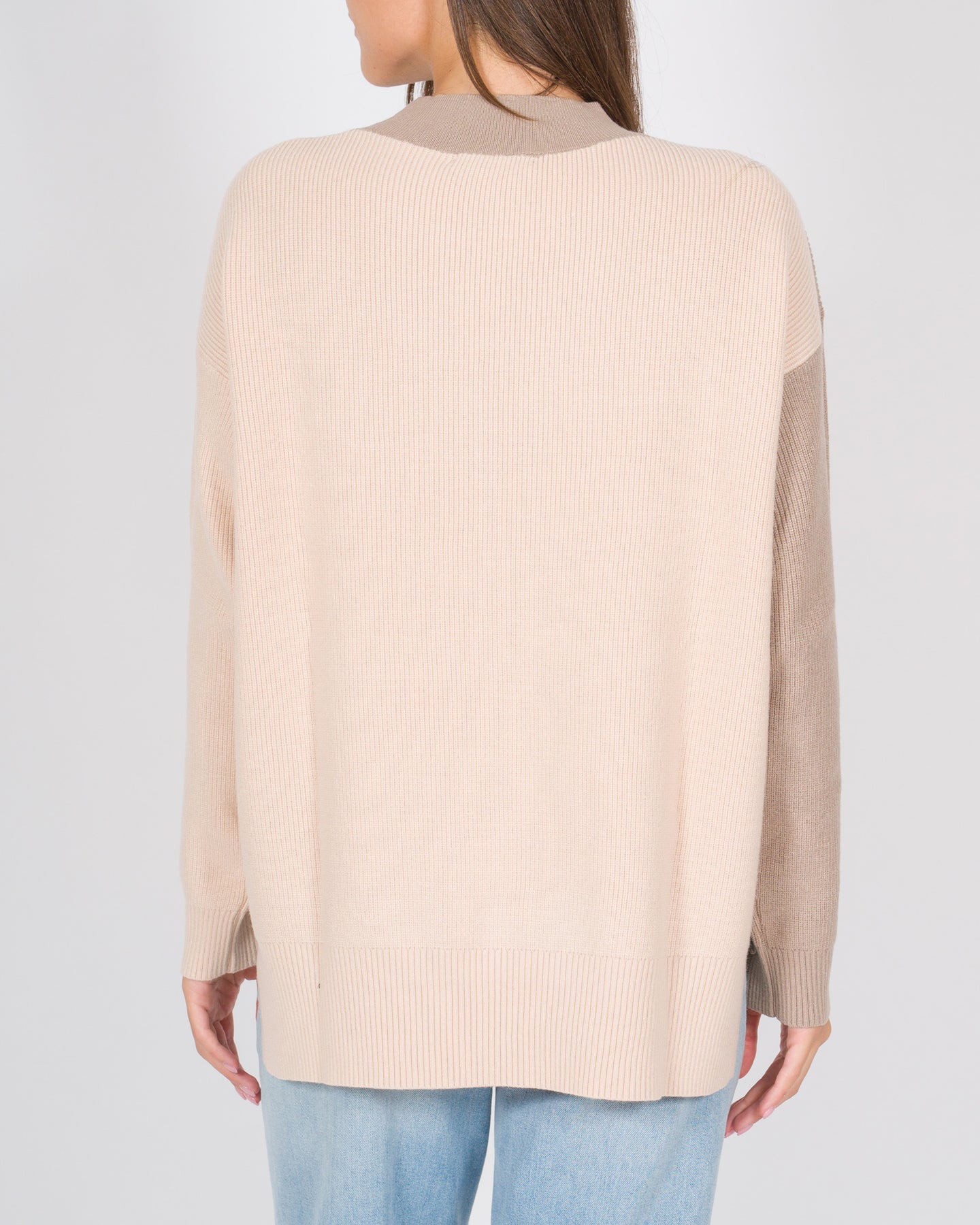 Questa maglia over in lana è realizzata con una lavorazione a costine che ne esalta la texture morbida e avvolgente. Il design è caratterizzato da un effetto tricolore nelle tonalità fango, rosa e bianco, che dona dinamismo e contemporaneità al modello. Le maniche lunghe raglan aggiungono comfort e una linea rilassata, perfetta per uno stile moderno e versatile.