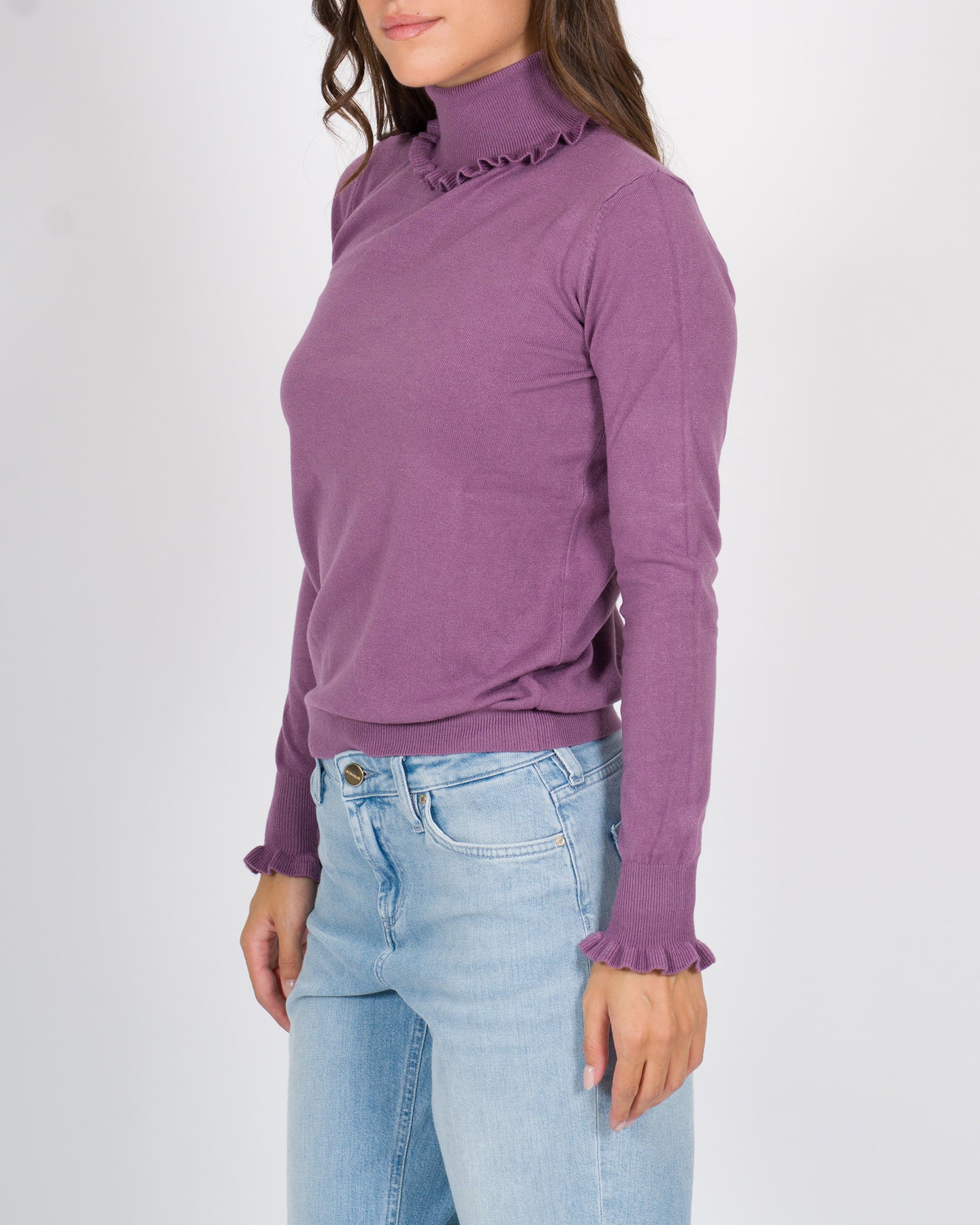 Elegante e femminile, questo pullover colo alto è realizzato in morbida viscosa elasticizzata, perfetta per accompagnare forme con leggerezza e confort. La sua linea essenziale è impreziosita da un raffinato dettaglio smerlato sul bordo del collo e dei polsi, che dona un tocco delicato e ricercato, ideale sia per il giorno che per la sera.Dettagli tecnici:Carattere: elegante, raffinatoTessuto: ViscosaVestibilità: regolareColore: melanzanaLa modella indossa la taglia S/M ed è alta 1.70.