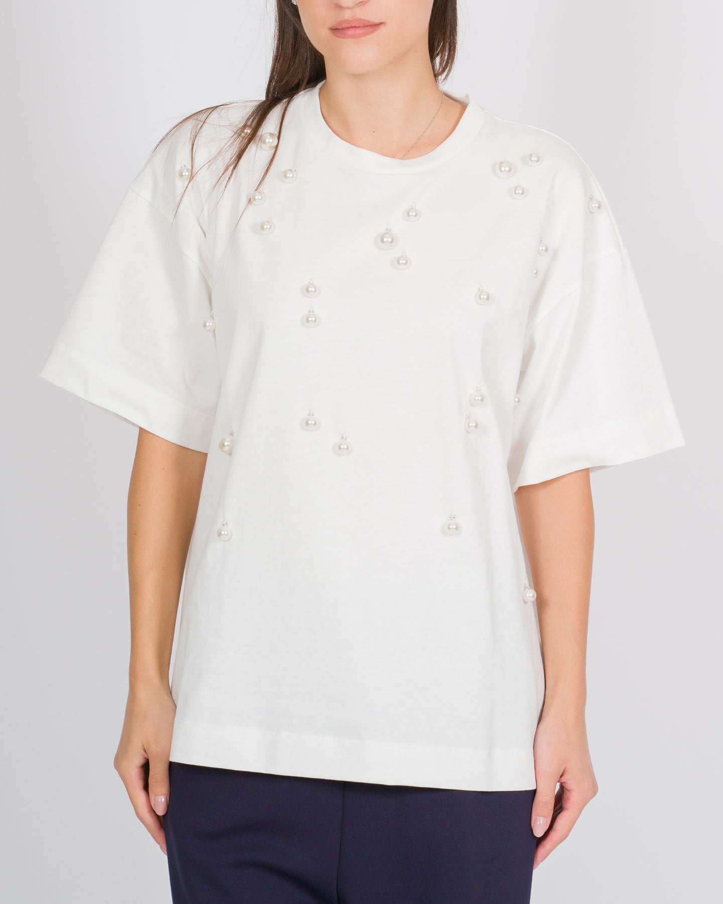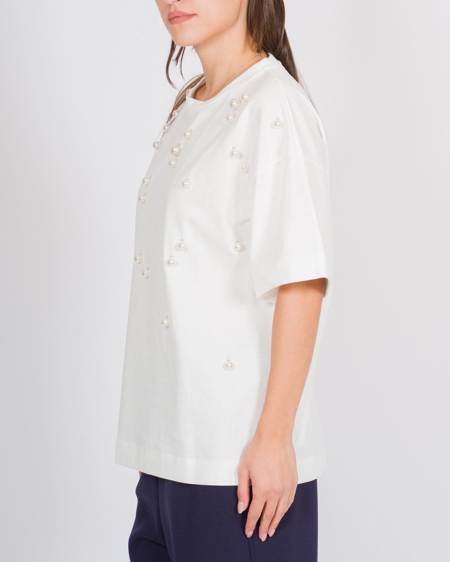 Un capo essenziale reinterpretato con un tocco sofisticato, questa T-shirt mezza manica in cotone bianco firmata Meimej unisce comfort e dettagli preziosi. Le applicazioni di perle lungo il tessuto donano luce e raffinatezza, trasformando una silhouette classica in un capo elegante e contemporaneo.Realizzata in cotone morbido e di alta qualità, la T-shirt garantisce vestibilità confortevole e versatilità, perfetta da indossare da sola o abbinata a blazer, gonne o pantaloni per look minimal ma ricercati.