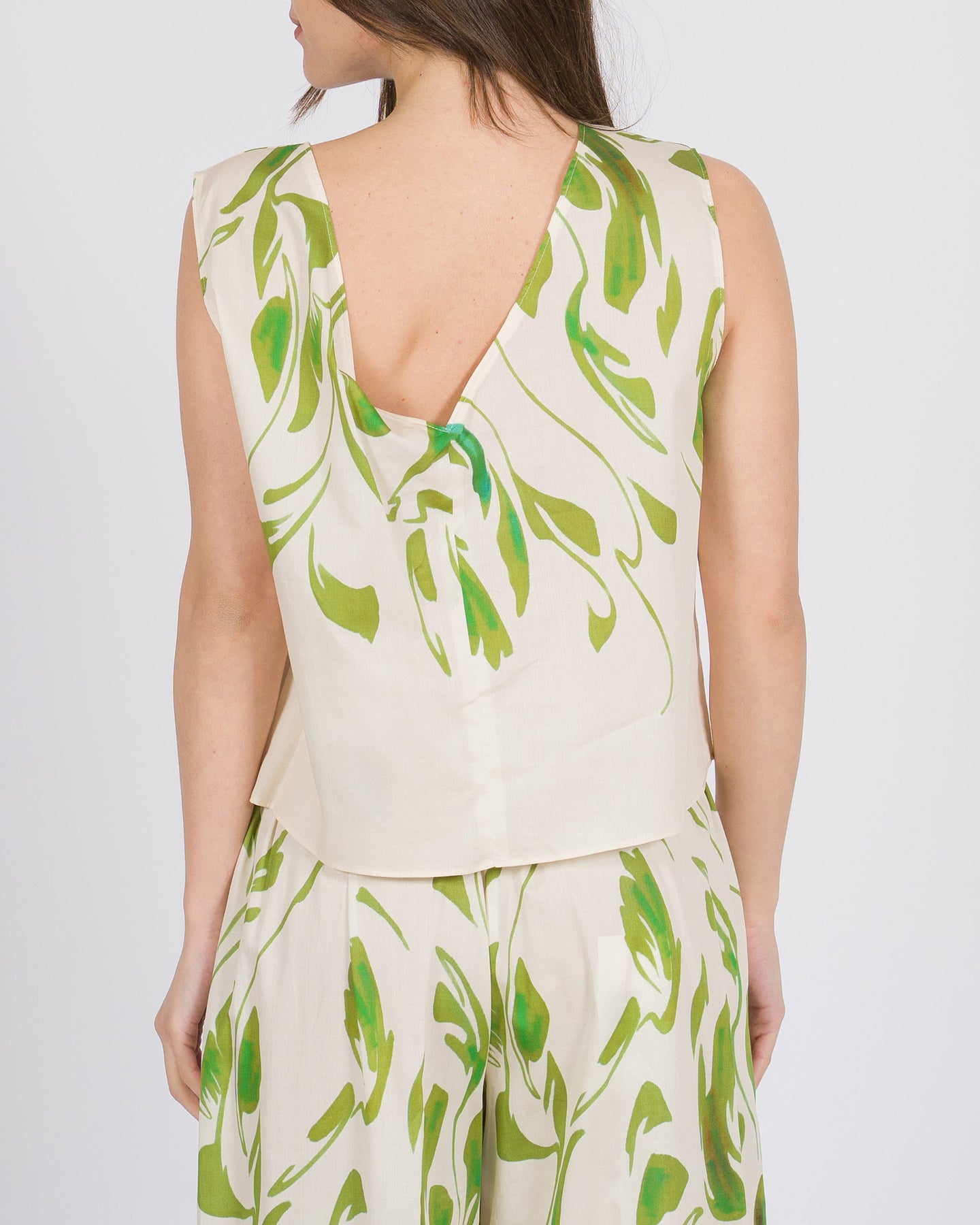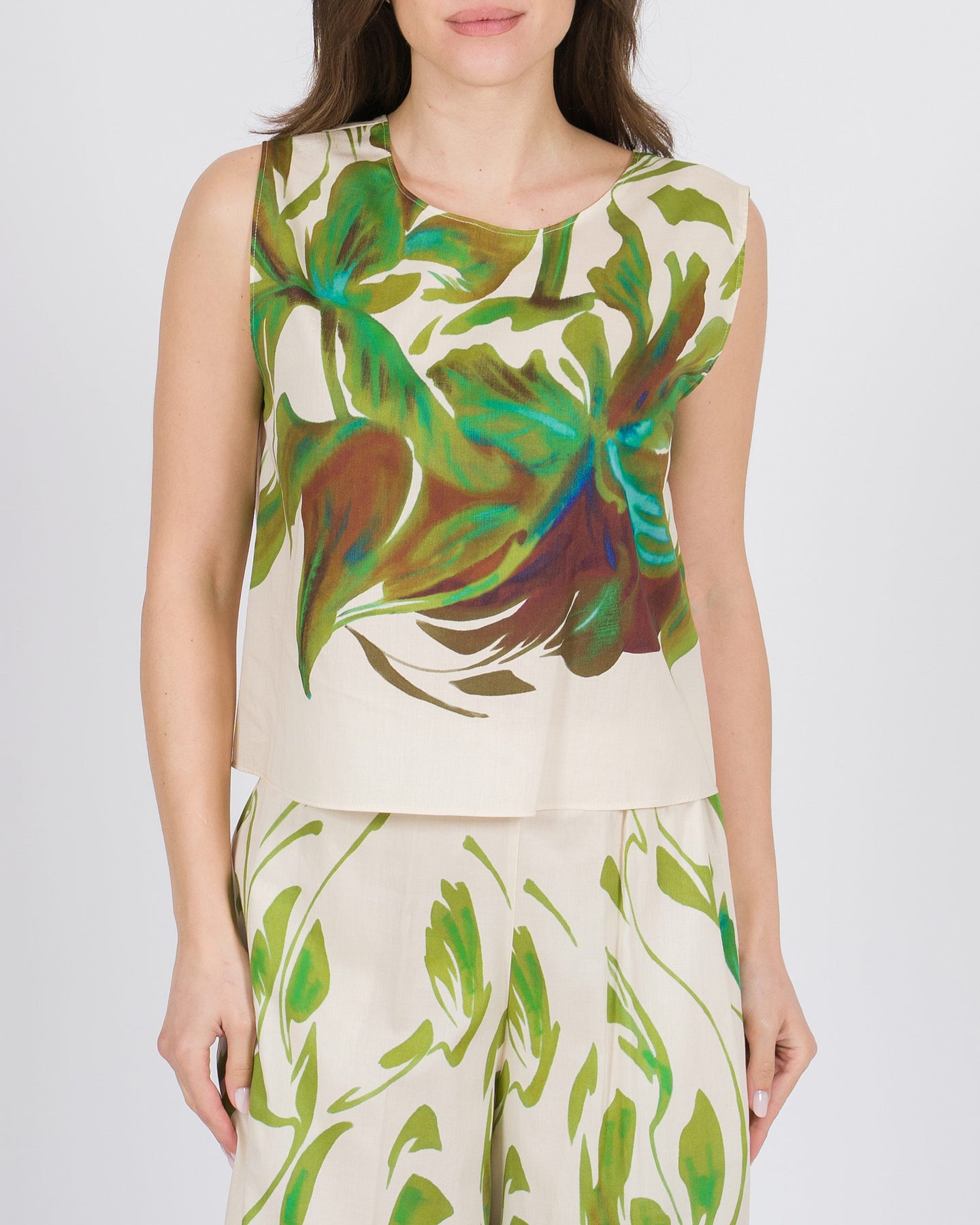 Raffinato e luminoso, il Top a giro con stampa floreale verde su fondo bianco esprime una femminilità fresca e contemporanea. Lo scollo a giro valorizza la linea del décolleté con eleganza essenziale, mentre la stampa floreale verde si distingue armoniosamente sul fondo bianco, creando un contrasto delicato e sofisticato.Realizzato in tessuto di alta qualità, offre una vestibilità confortevole e fluida, perfetta per outfit primaverili ed estivi. Ideale da abbinare a pantaloni palazzo, gonne midi o denim premium per un look chic e ricercato dal giorno alla sera.Un capo versatile e di tendenza, pensato per la donna che desidera uno stile elegante e naturale.